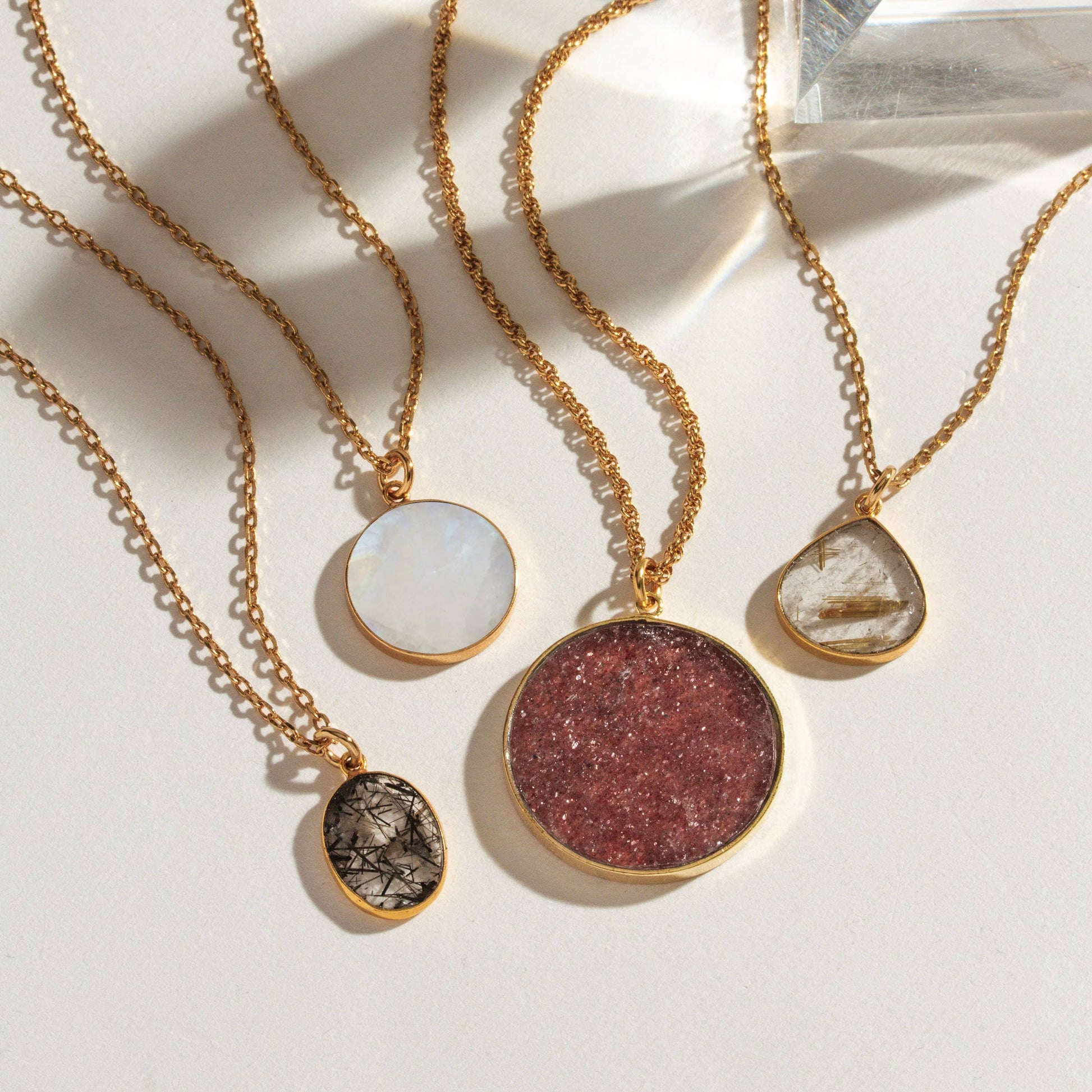 Dette halskjedet kombinerer ekte månestein med en sirkelrund form – et symbol på helhet, sykluser og balanse. Den skimrende overflaten fanger lyset som sølv på vann, og minner oss om å stole på vår indre visdom – selv i tider med forandring.