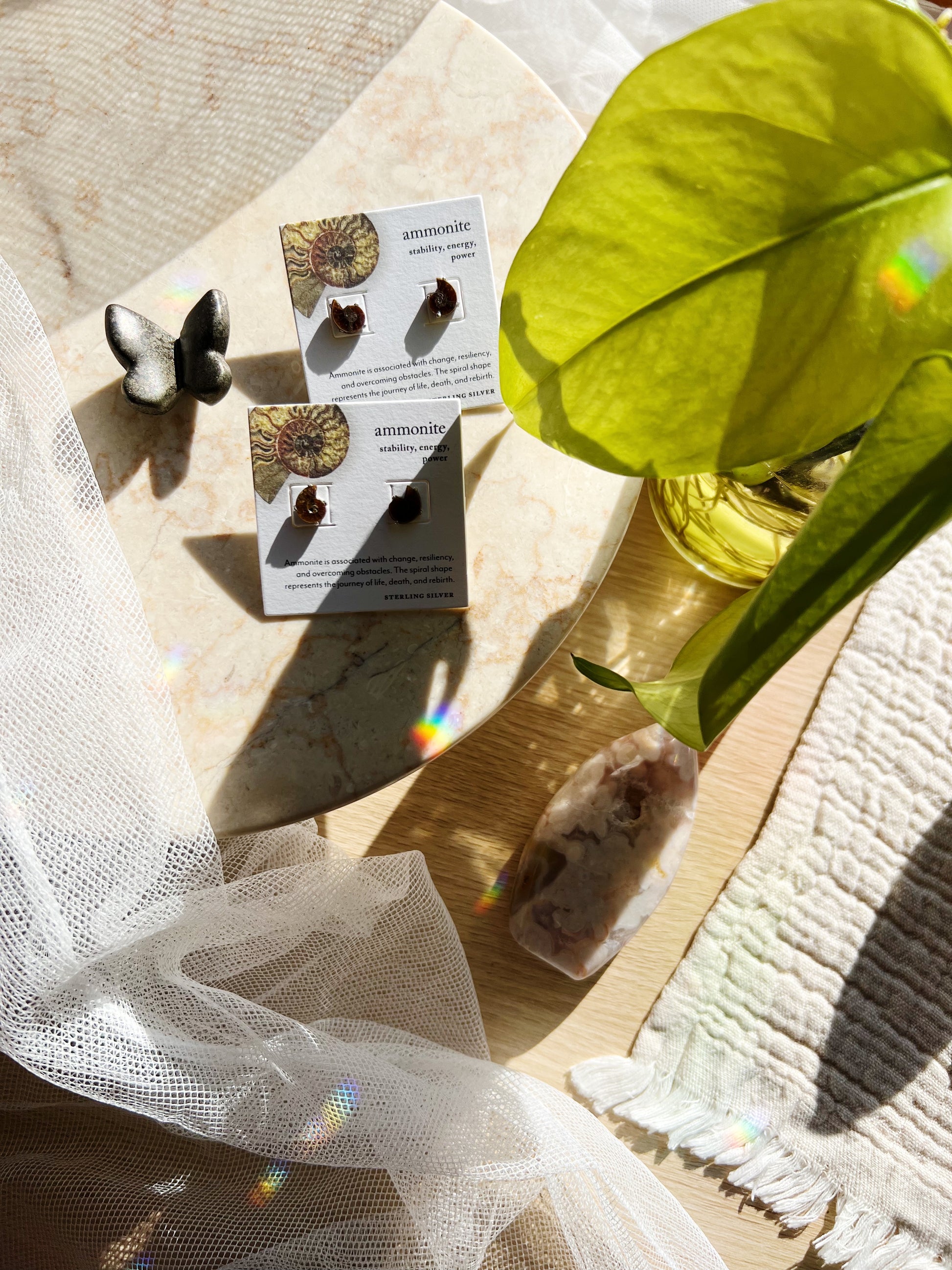 Bær et lite stykke jordens historie – formet for millioner av år siden. Våre ammonitt øredobber inneholder ekte fossiler med naturlige spiralformasjoner som symboliserer evighet, vekst og indre reise.