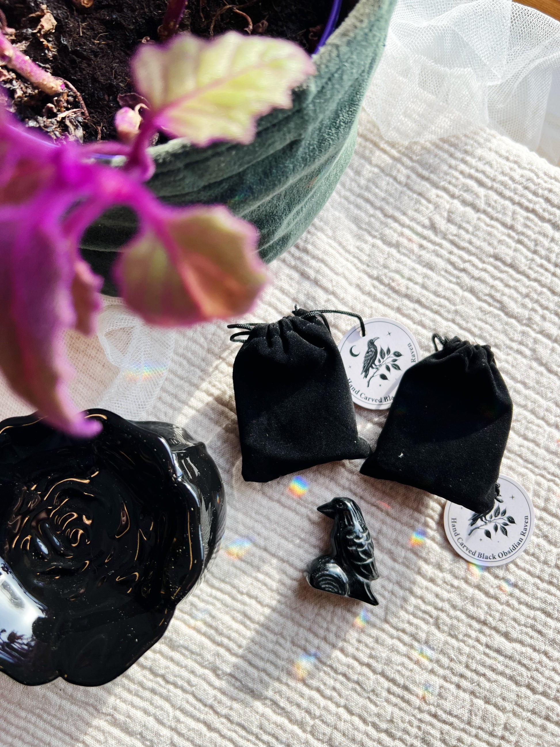 Sort Obsidian Gotisk Ravnefigur i Fløyelspose