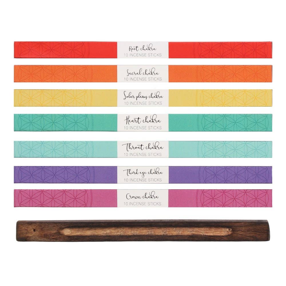 Dette komplette røkelsesettet inneholder 7 individuelle pakker med 10 røkelsespinner hver, samt en vakker tre røkelseholder. Hver pakke representerer ett av de syv chakraene med sin unike duft, perfekt for meditasjon, energihealing og chakra-balansering.