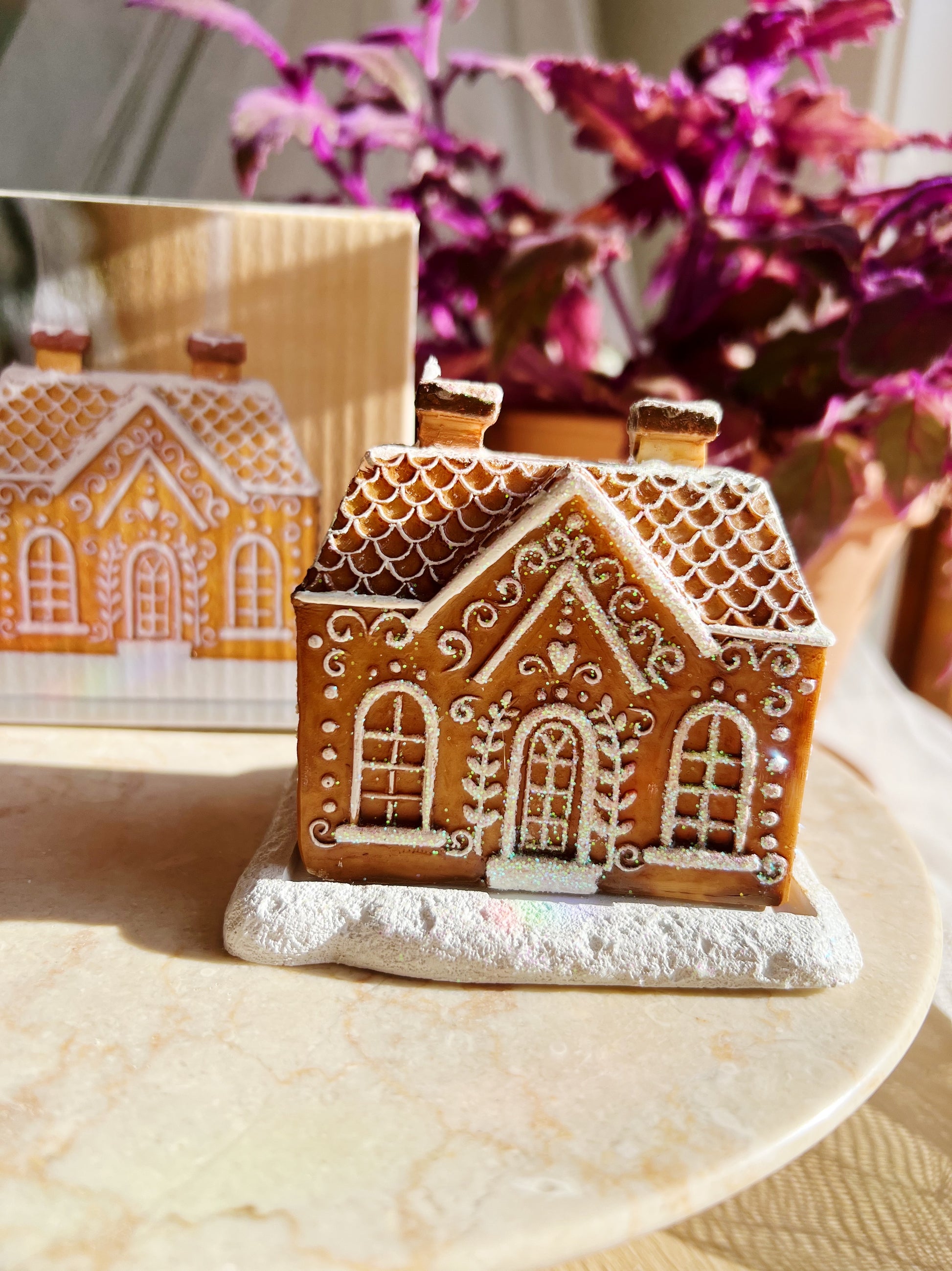 🏠 Design: Snødekt pepperkakehus med glitter og to piper