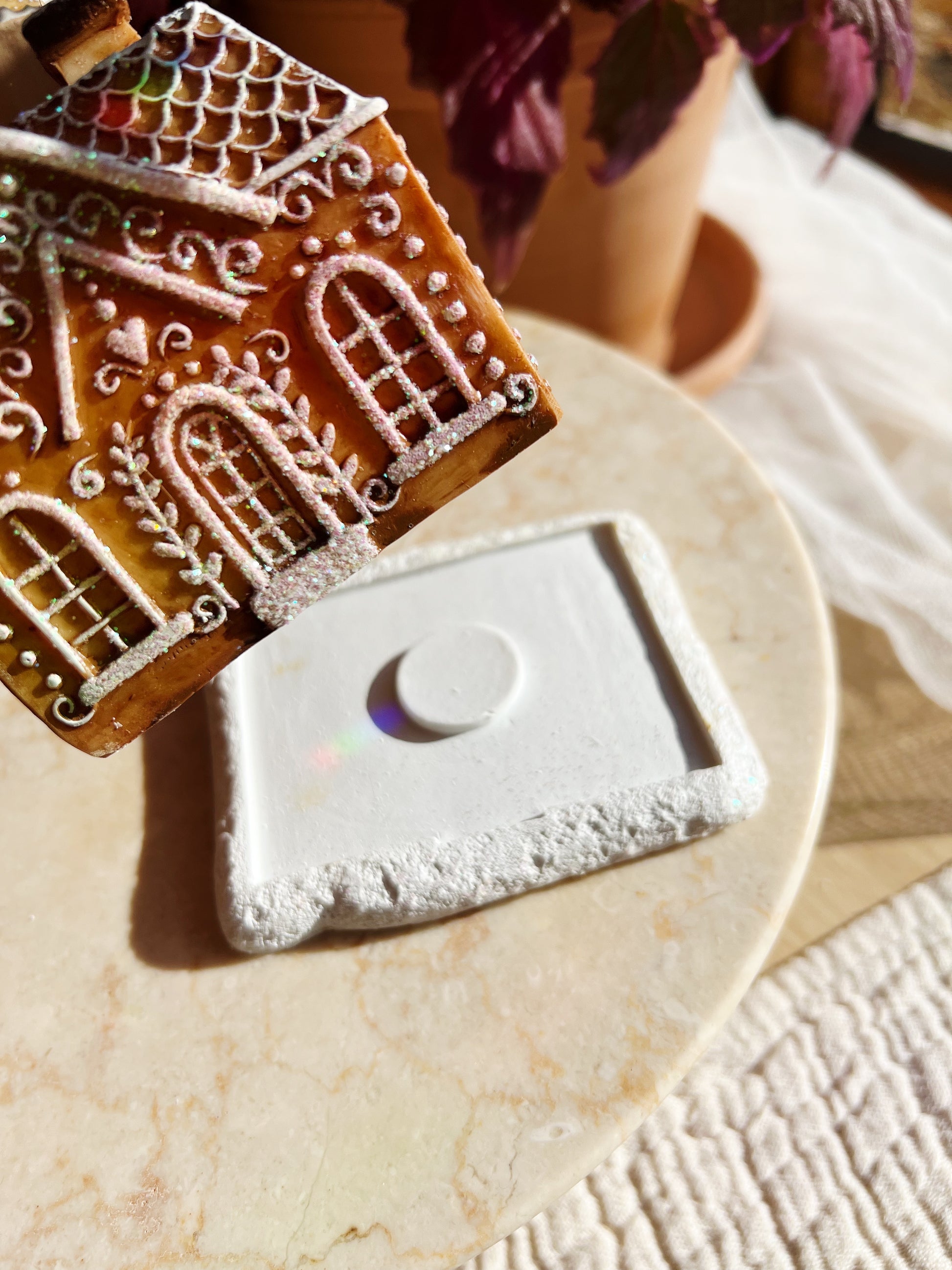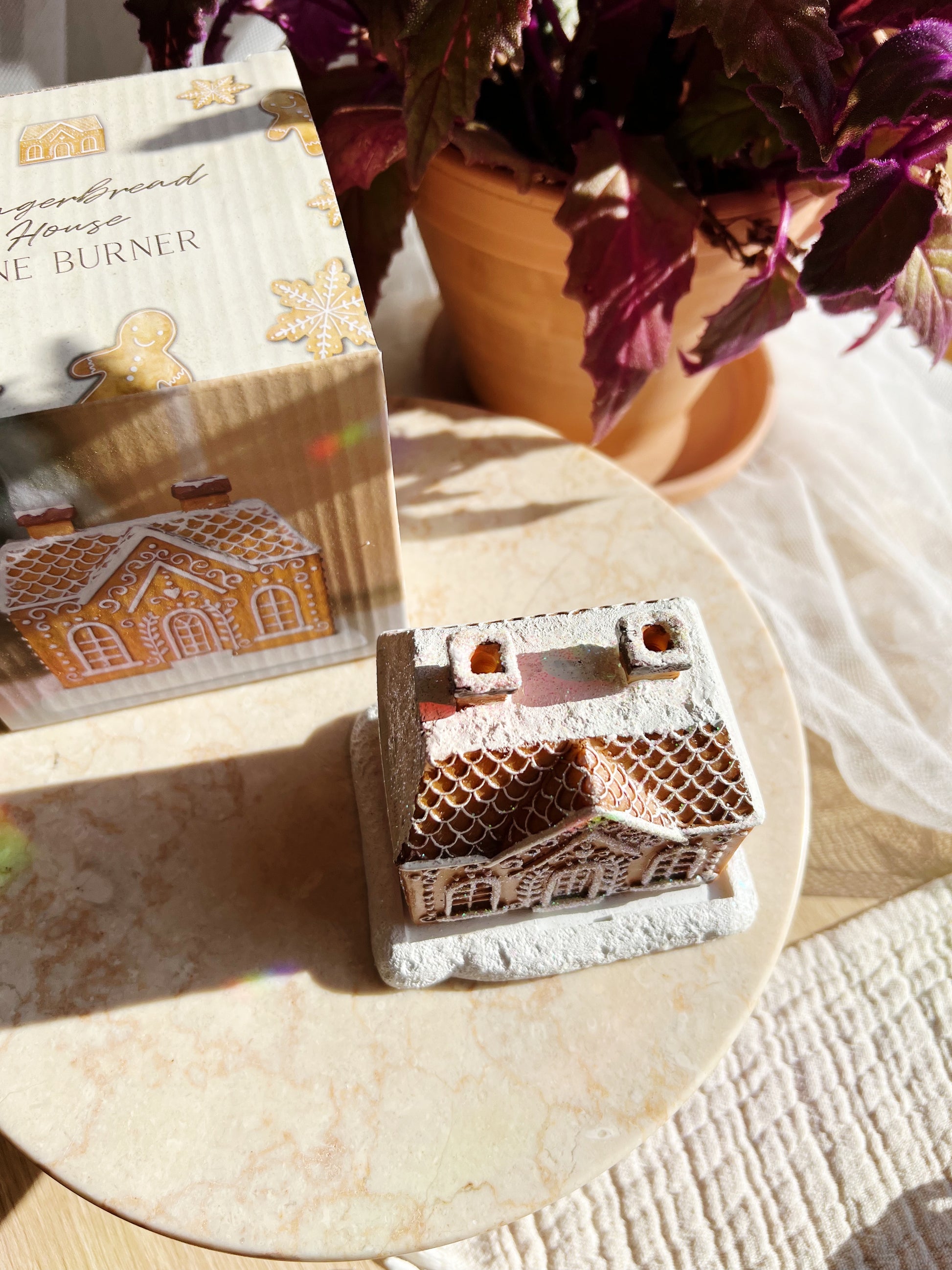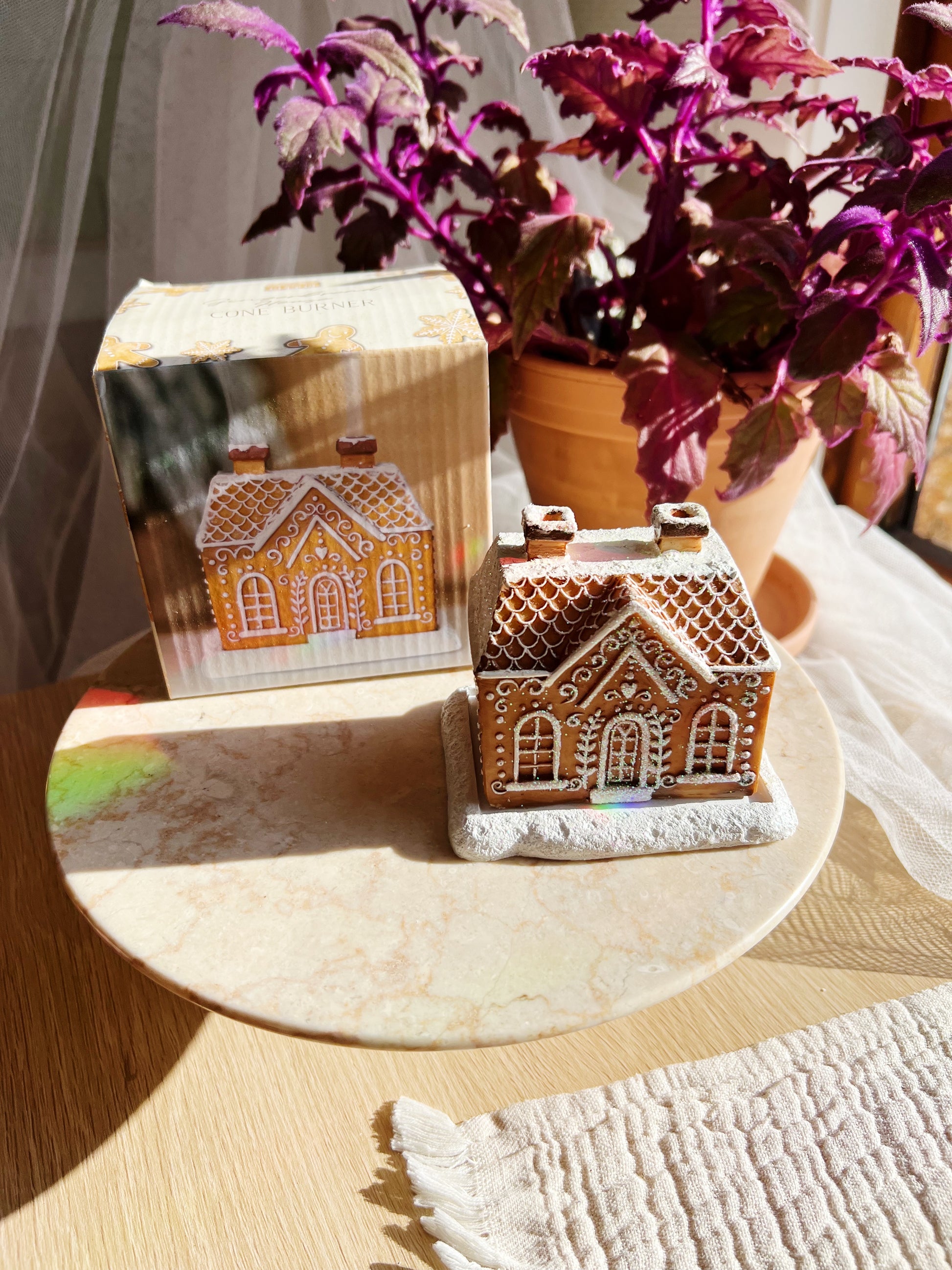 Dette nydelige pepperkakehuset med snødekt tak og glitrende detaljer er mer enn bare pynt – det er en røkelsesbrenner som bringer både stemning og duft inn i hjemmet. Når en røkelseskjegle tennes under huset, stiger røyk sjarmerende opp fra de to små pipene, akkurat som i et ekte juleeventyr.