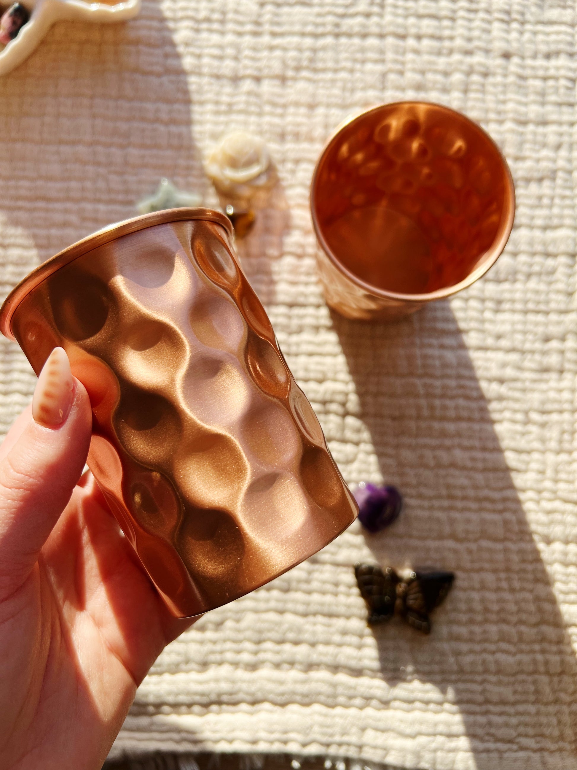 Elegante kobberkrus med hamret overflate, solgt i praktisk 2-pack. I ayurveda har kobberkrus lenge vært verdsatt for sine helsefremmende egenskaper.