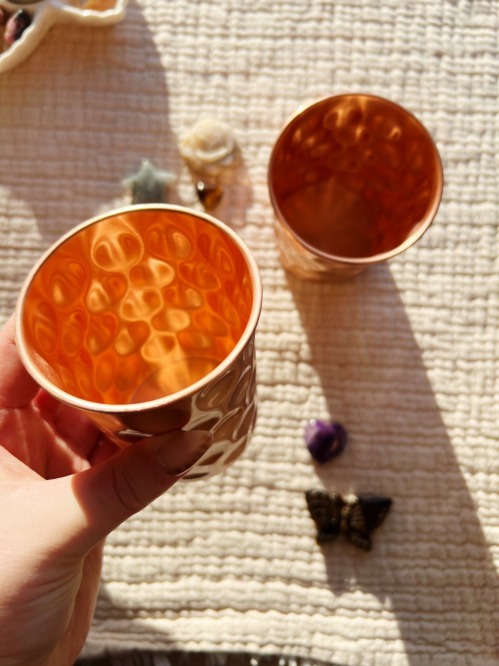 Bruk: Tradisjonelt fylles kobberkrusene med vann om kvelden og drikkes på morgenen for optimal effekt.