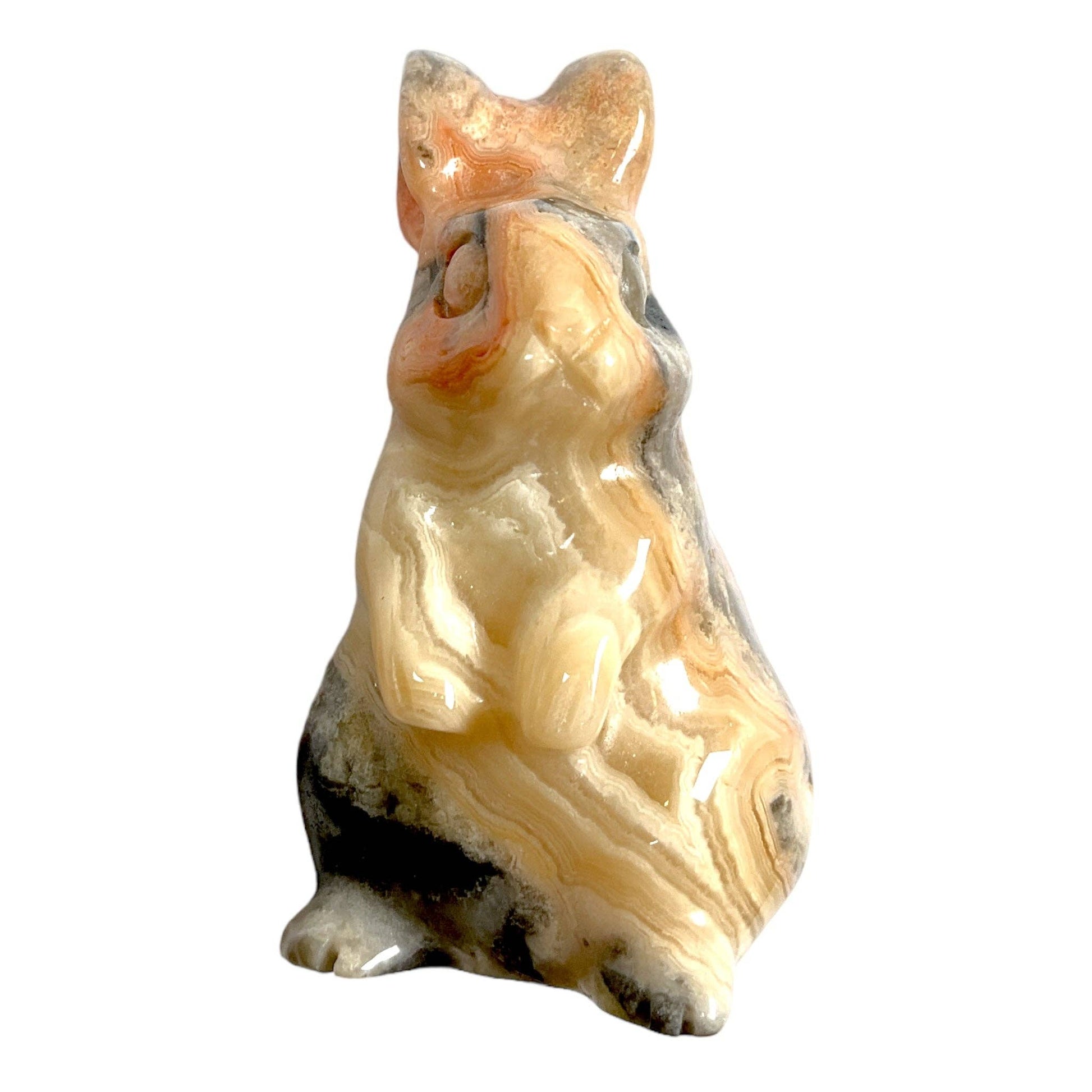 Denne sjarmerende kaninfiguren er håndskjært i vakker Crazy Lace Agat, kjent som "Lykke-agaten" eller "Lattersteinen". Med sine unike, virvlende mønstre i varme farger bringer denne lille kaninen glede, optimisme og positiv energi til hjemmet ditt.