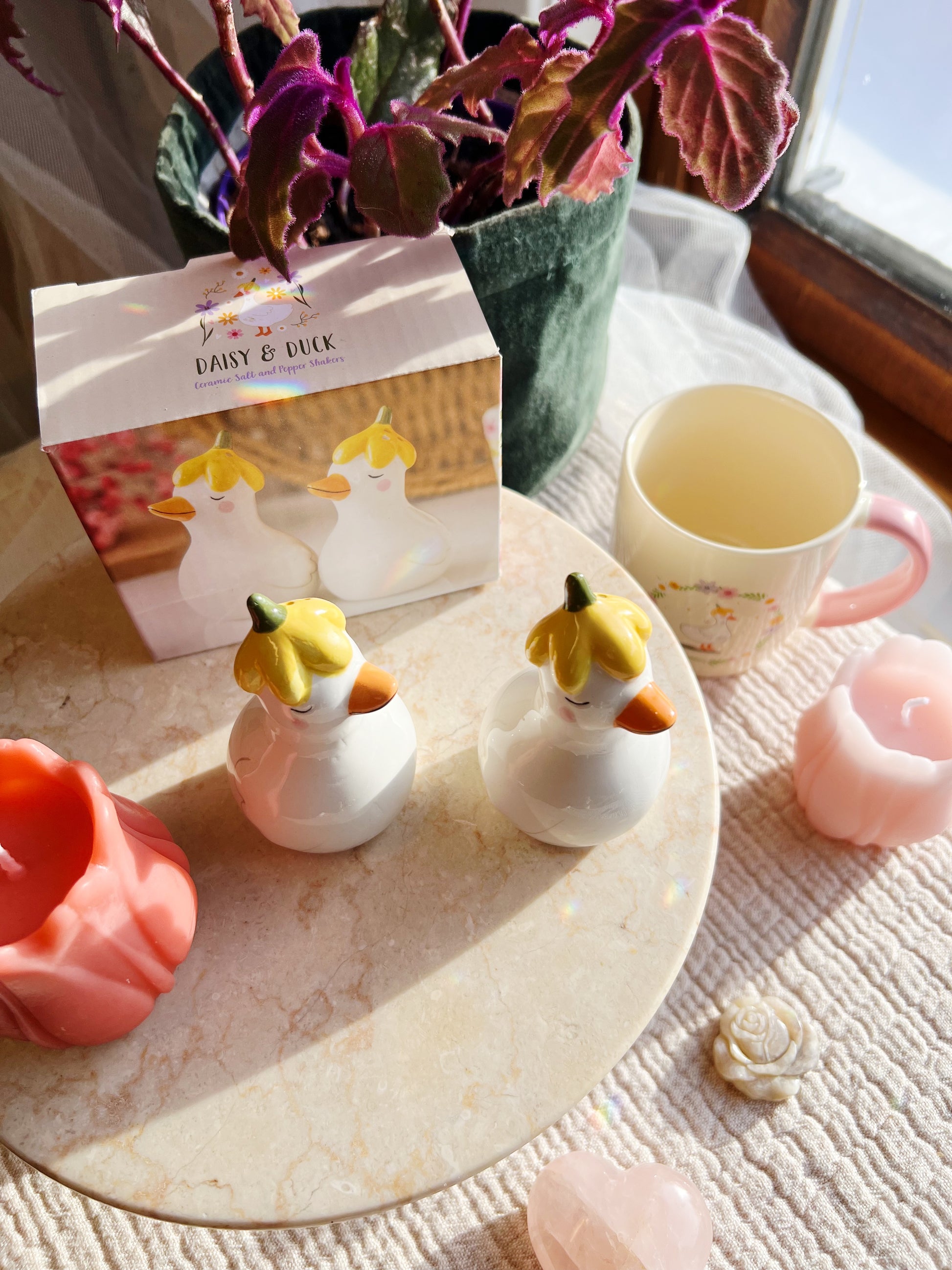Bring personlighet og vårlig sjarm til bordet ditt med dette sjarmerende keramiske salt- og peppersettet i form av to søte ender iført blomsterhatter. Perfekt for sesongbaserte borddekorasjoner eller som en herlig gave til de som elsker søt og leken dekor.