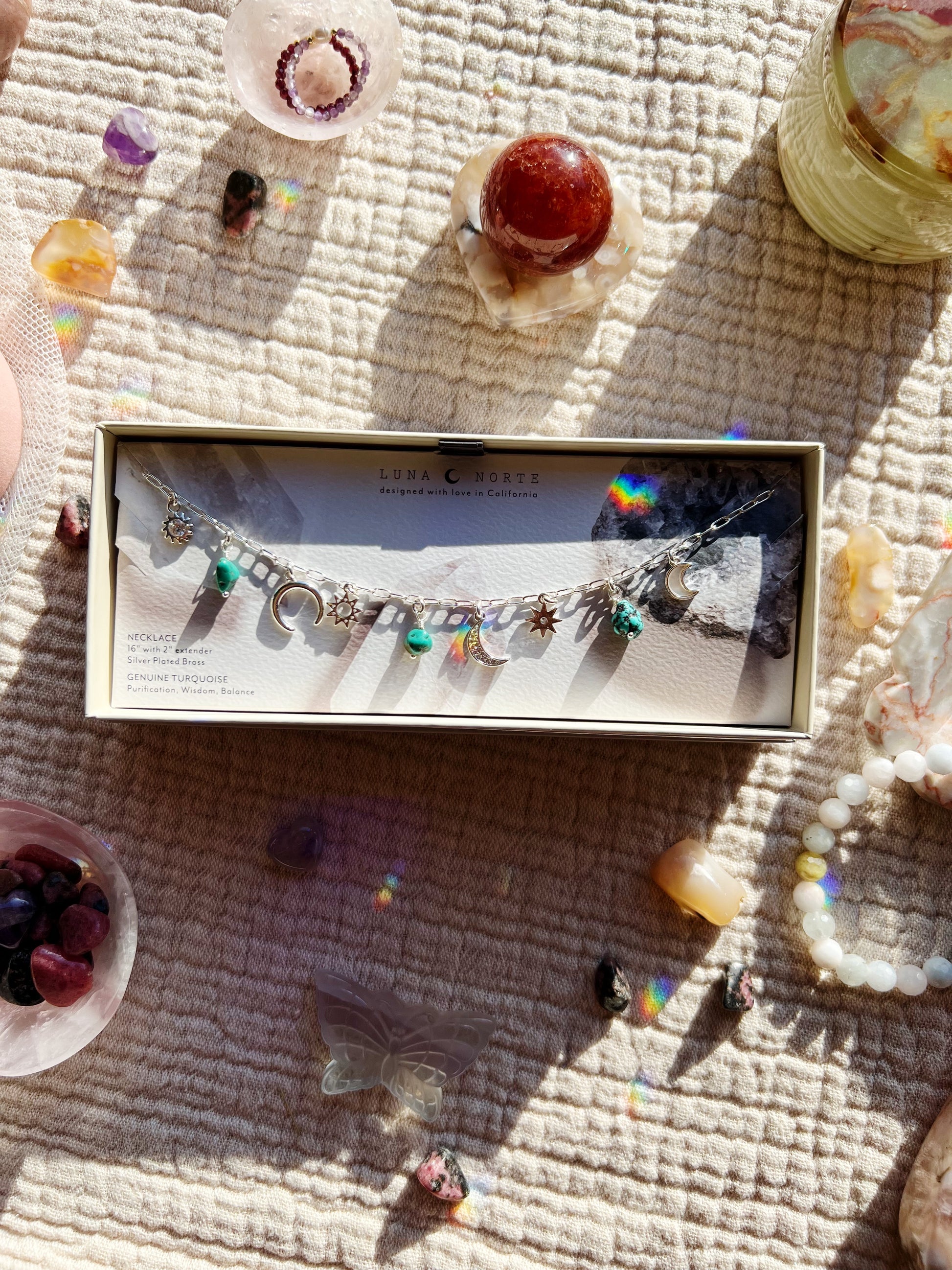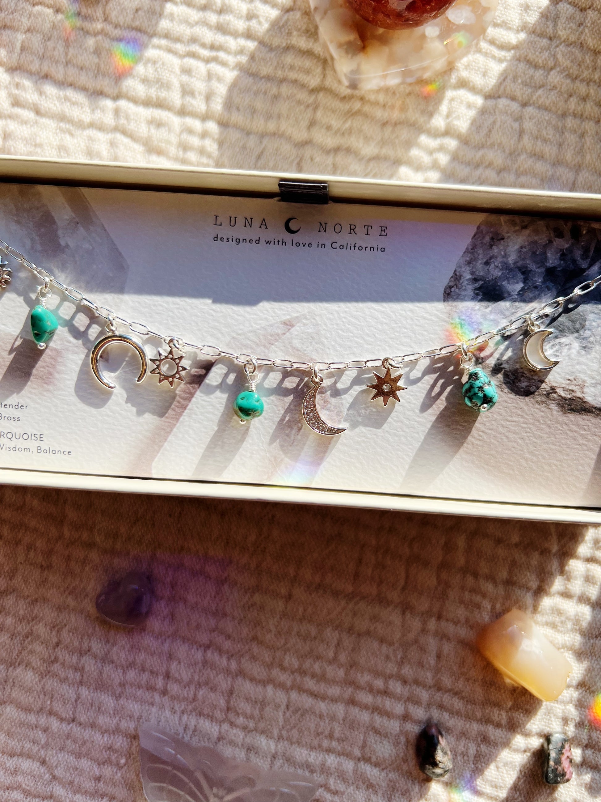 Ekte turkissteiner stråler jordaktig energi og ro, mens vekslende himmelske charms – glitrende soler, månesigder og en lysende perlemor-måne – speiler den skiftende ørkenhimmelen.