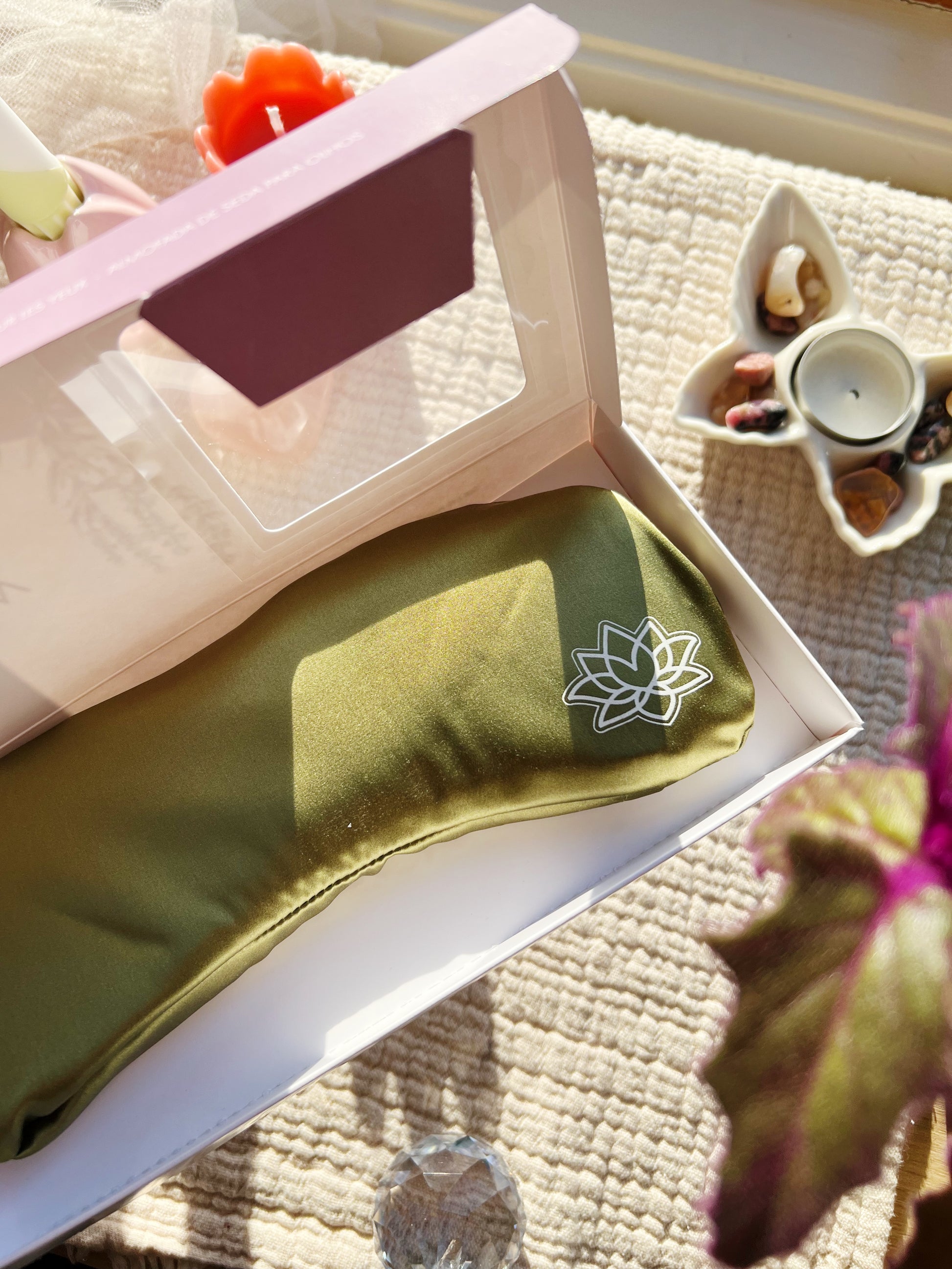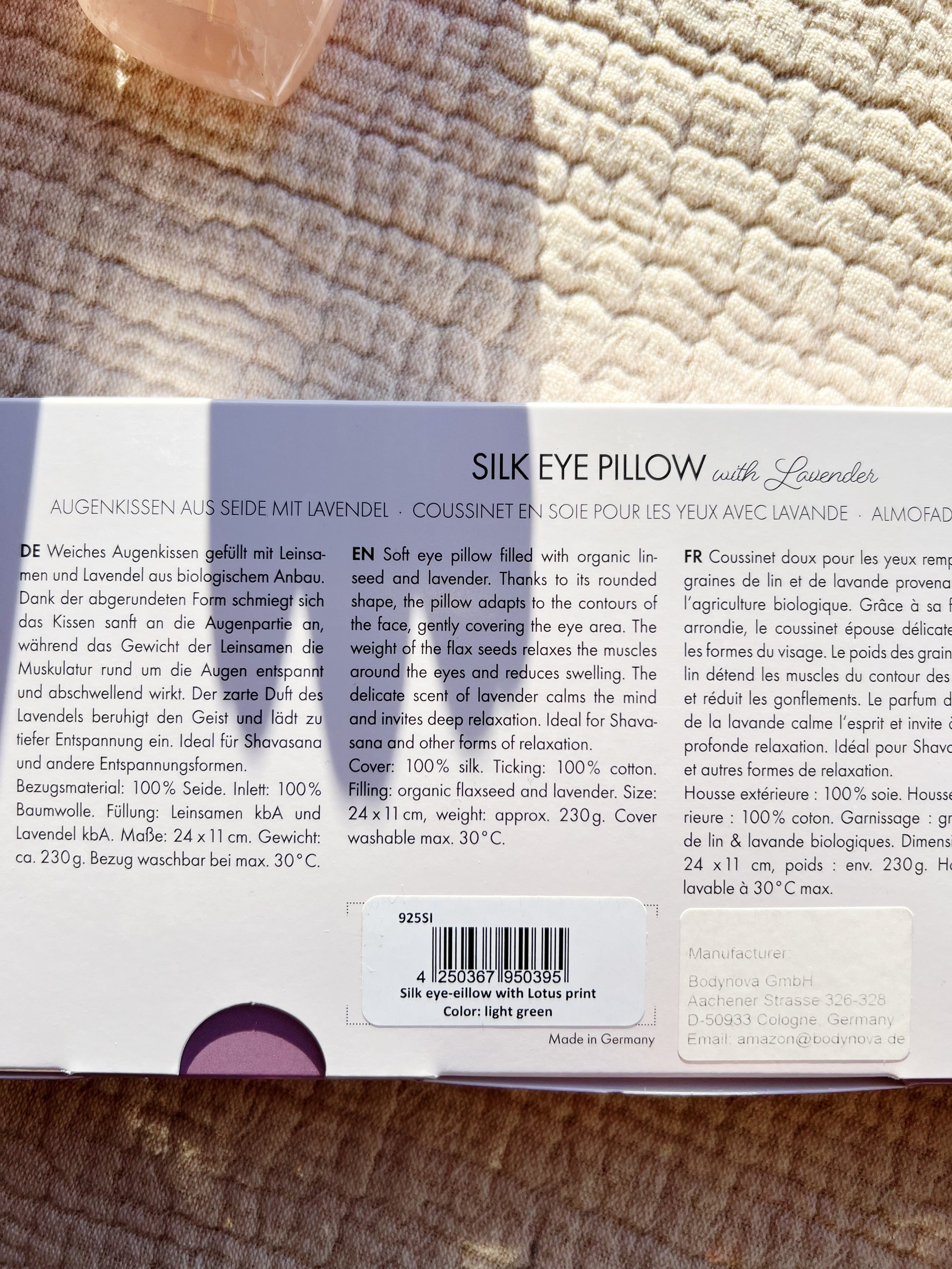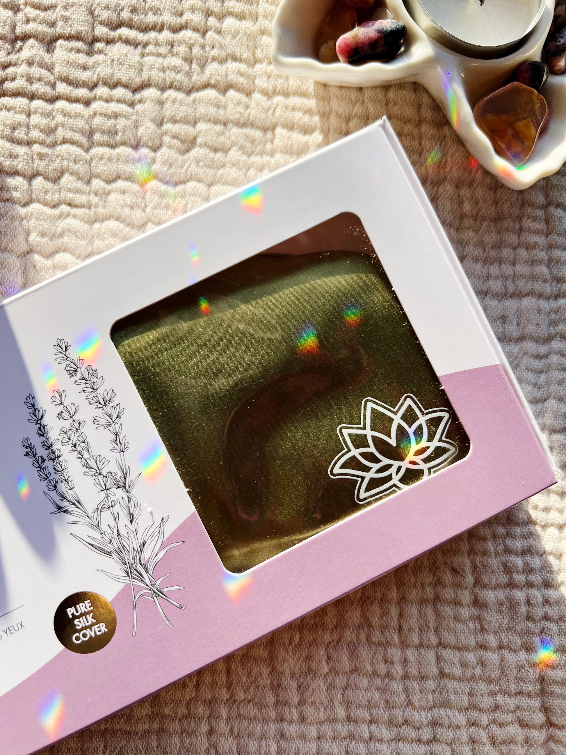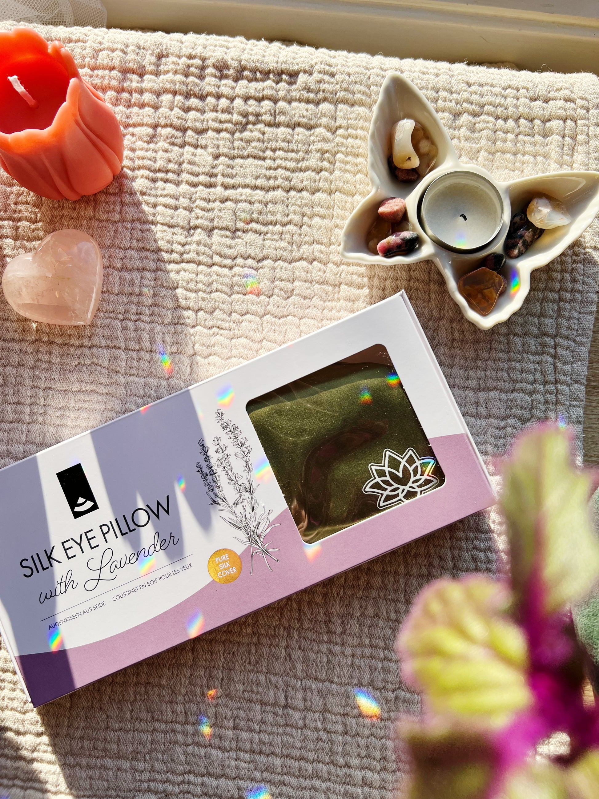 Luksuriøs øyepute i silke med aromaterapeutisk fylling av linfrø og lavendel. Perfekt for dyp avslapning under yoga, meditasjon eller hvile.