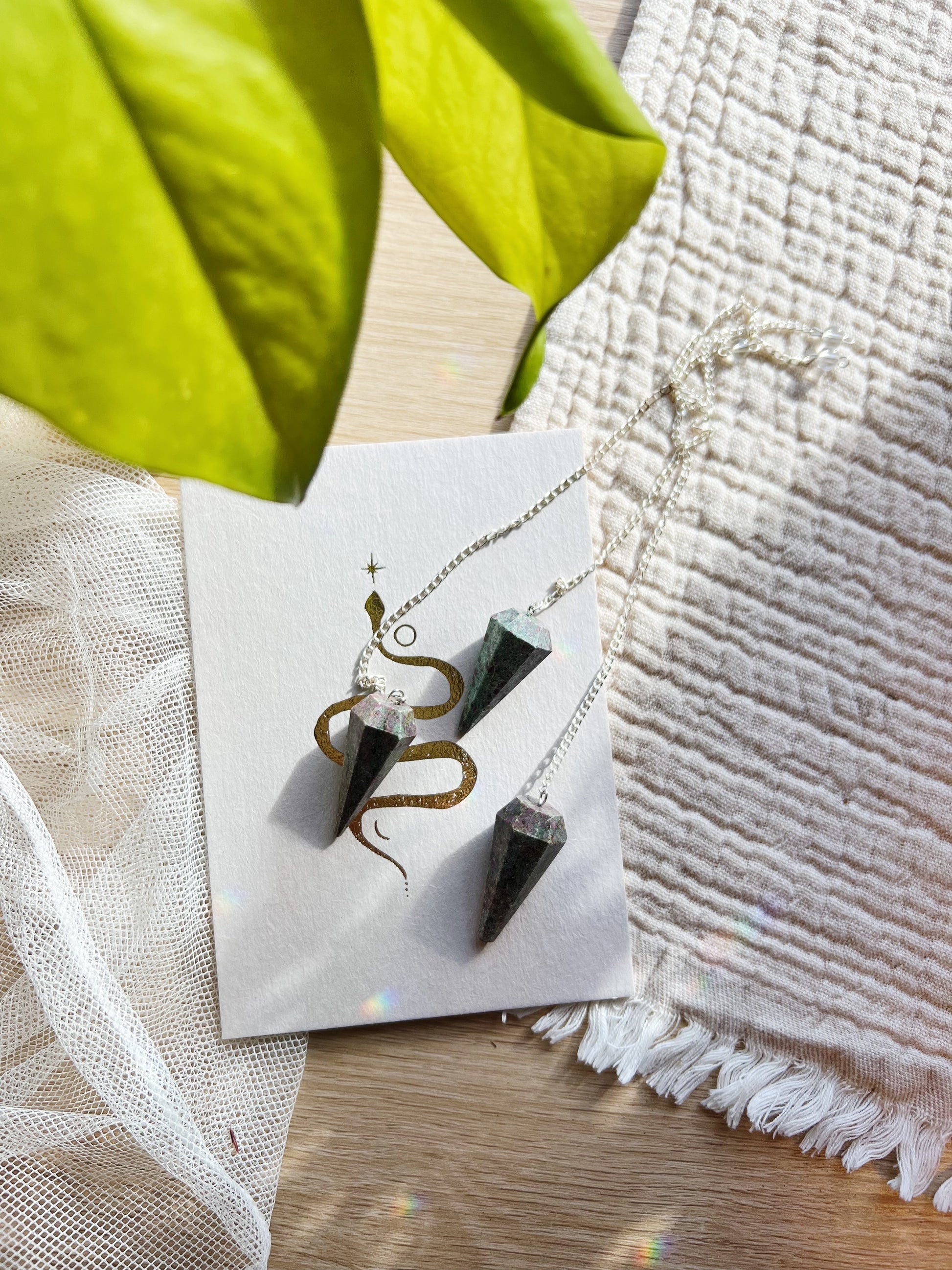 La denne unike zoisitt-pendelen bli din portal til transformasjon og spirituell vekst. Zoisitt, også kjent som Anyolit når den kombineres med rubin, forener den livgivende, ildfulle energien fra rubinen med zoisittens jordende og balanserende kraft. Dette kraftfulle samarbeidet gir deg styrken til å vokse, helbrede og realisere ditt fulle potensial.