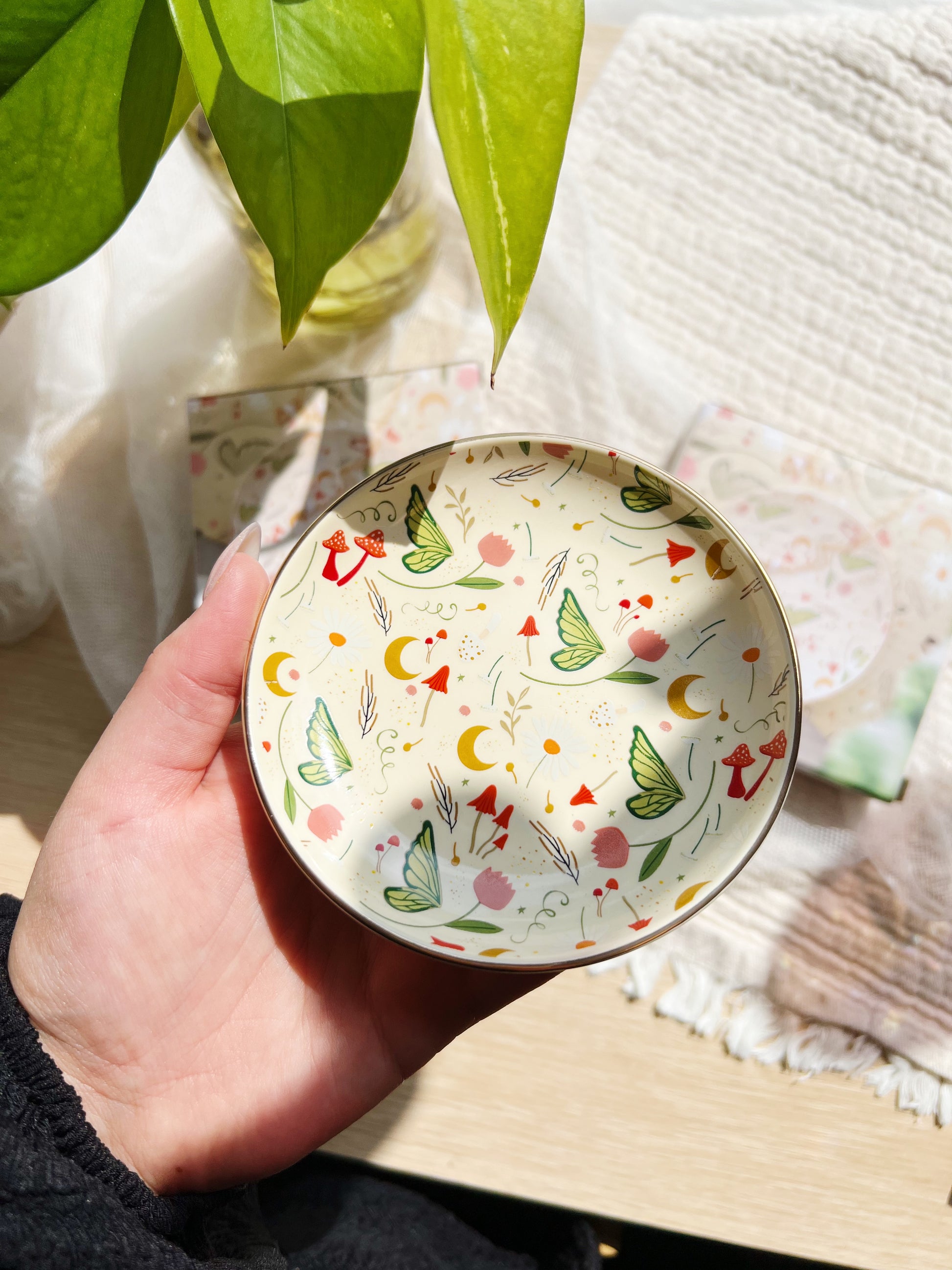 La små skatter finne hvile i dette fortryllende runde smykkefatet av keramikk, dekorert med en drømmende hagefe blant blomster og blader. Som et lite stykke eventyr bringer det en dæsj av skogsmagi og fantasi til sminkebordet, nattbordet – eller hvor enn du ønsker å gjemme dine mest kjære småting.
