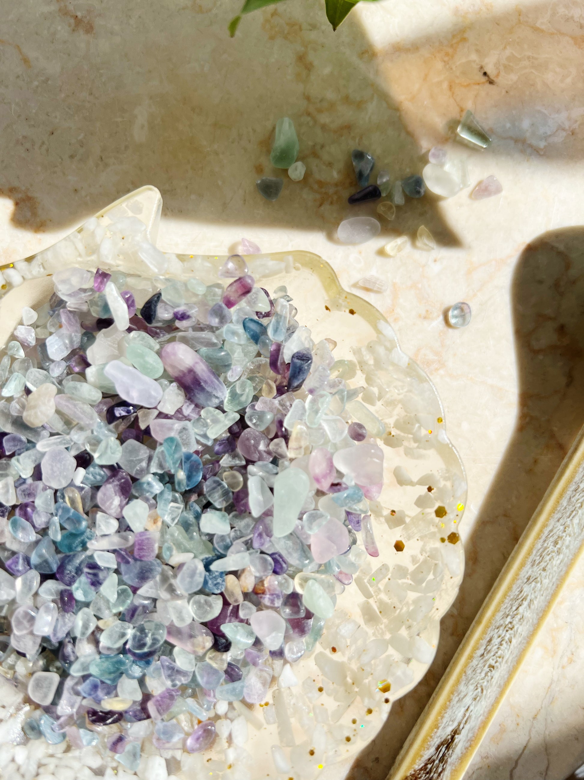 Har du noen gang opplevd magien med Regnbue Fluoritt? Denne krystallen er en portal til intuisjon, klar kommunikasjon og stimulerer ditt tredje øye chakra for å manifestere åndelig vekst. Fluoritt er nøkkelen til et klarere sinn; tenk deg å fjerne tusenvis av tanker for å fokusere på ett skritt om gangen. Tenk på fluoritt som din personlige veileder som forsiktig hjelper deg å rydde opp i mental rot, og skape plass til et strøm av positivitet. Med sin kraft til å absorbere negativitet, krever Fluoritt hyppig renselse og er ideell for aura- og chakra-rensing. Det er en harmoniserende og balanserende kraft som forbinder deg direkte med ditt aller høyeste jeg. Er du klar til å låse opp ditt fulle potensiale med Fluoritt?