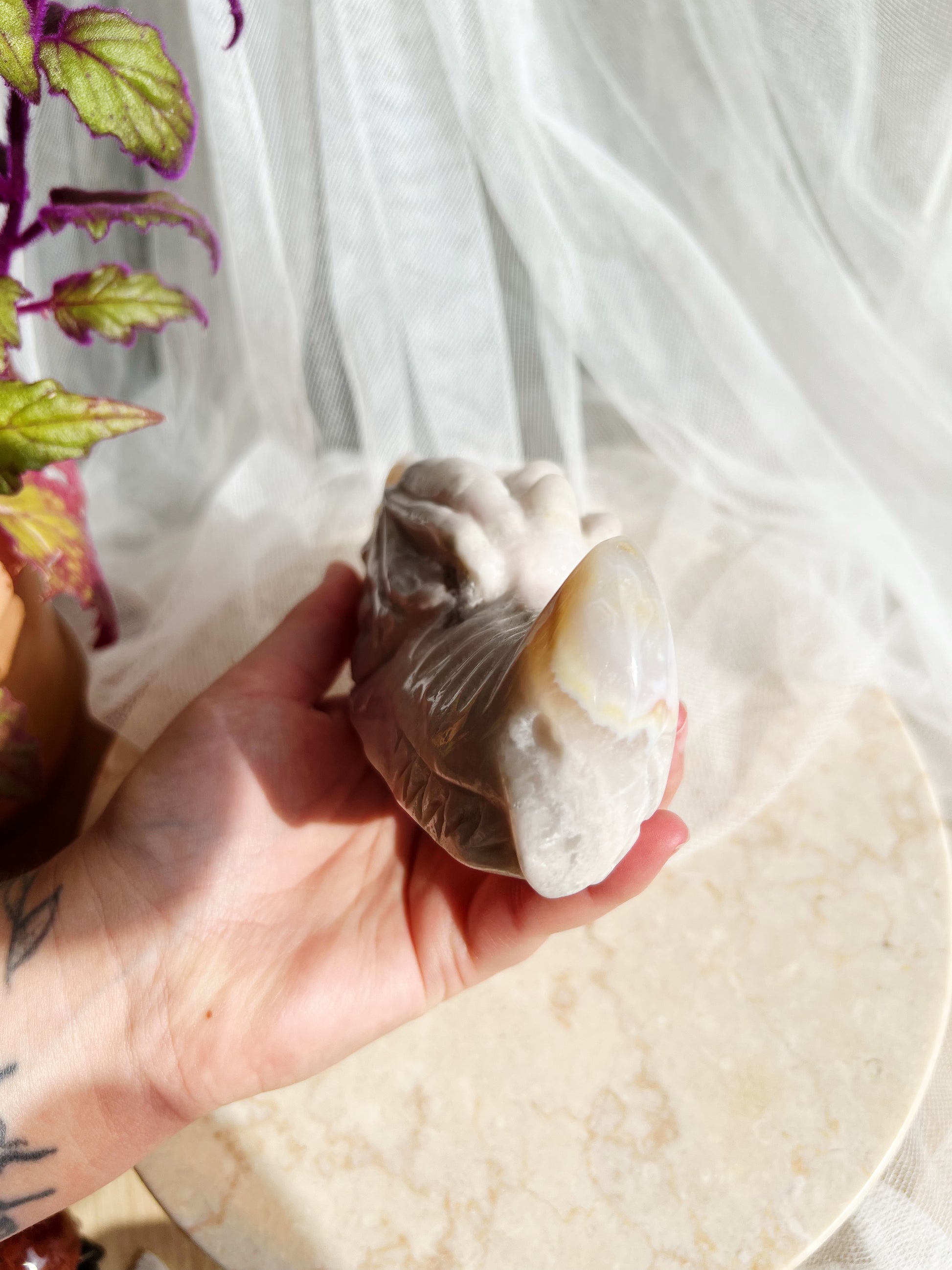 Dette unike dragehodet i rosa ametyst, med naturlige glitrende druzy-formasjoner, bærer med seg en kraftfull symbolikk. Dragen er et eldgammelt tegn på visdom, styrke og spirituell beskyttelse – og i kombinasjon med rosa ametysts kjærlige energi, får du en dypt balanserende og transformerende kraft. Den beskytter hjertet ditt, skjermer deg fra negativitet og hjelper deg å vokse gjennom forandring – med ro og indre trygghet.