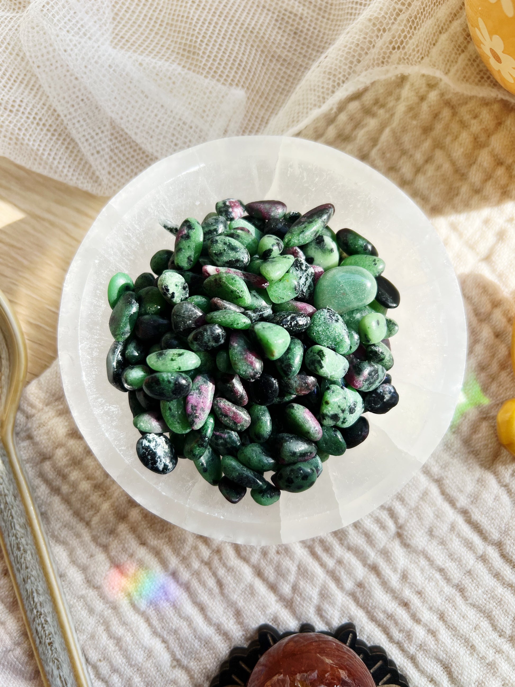 🌿 Energi og livskraft: Rubinen i steinen gir mot, lidenskap og vitalitet, mens zoisiten støtter følelsesmessig balanse og indre ro.