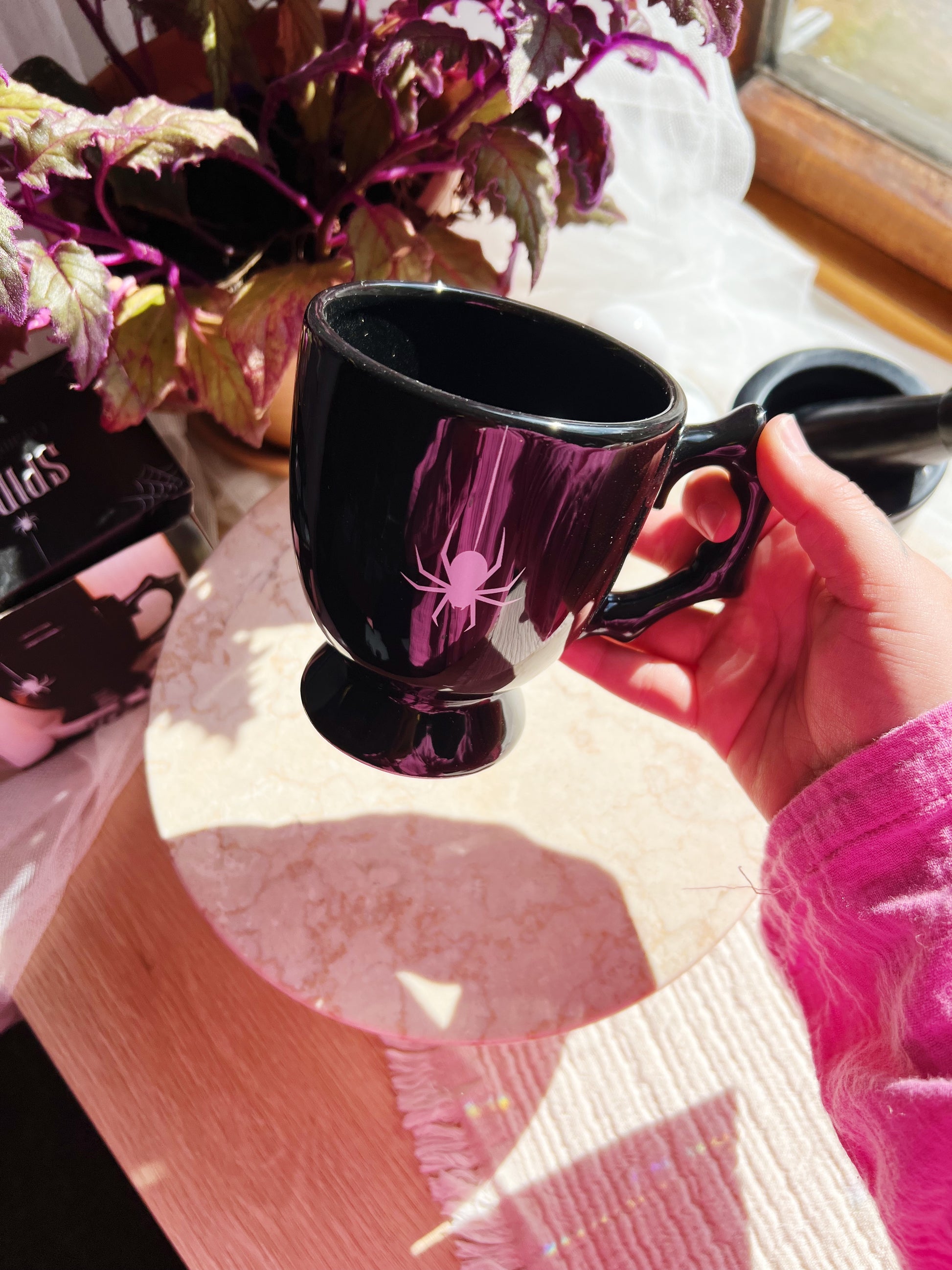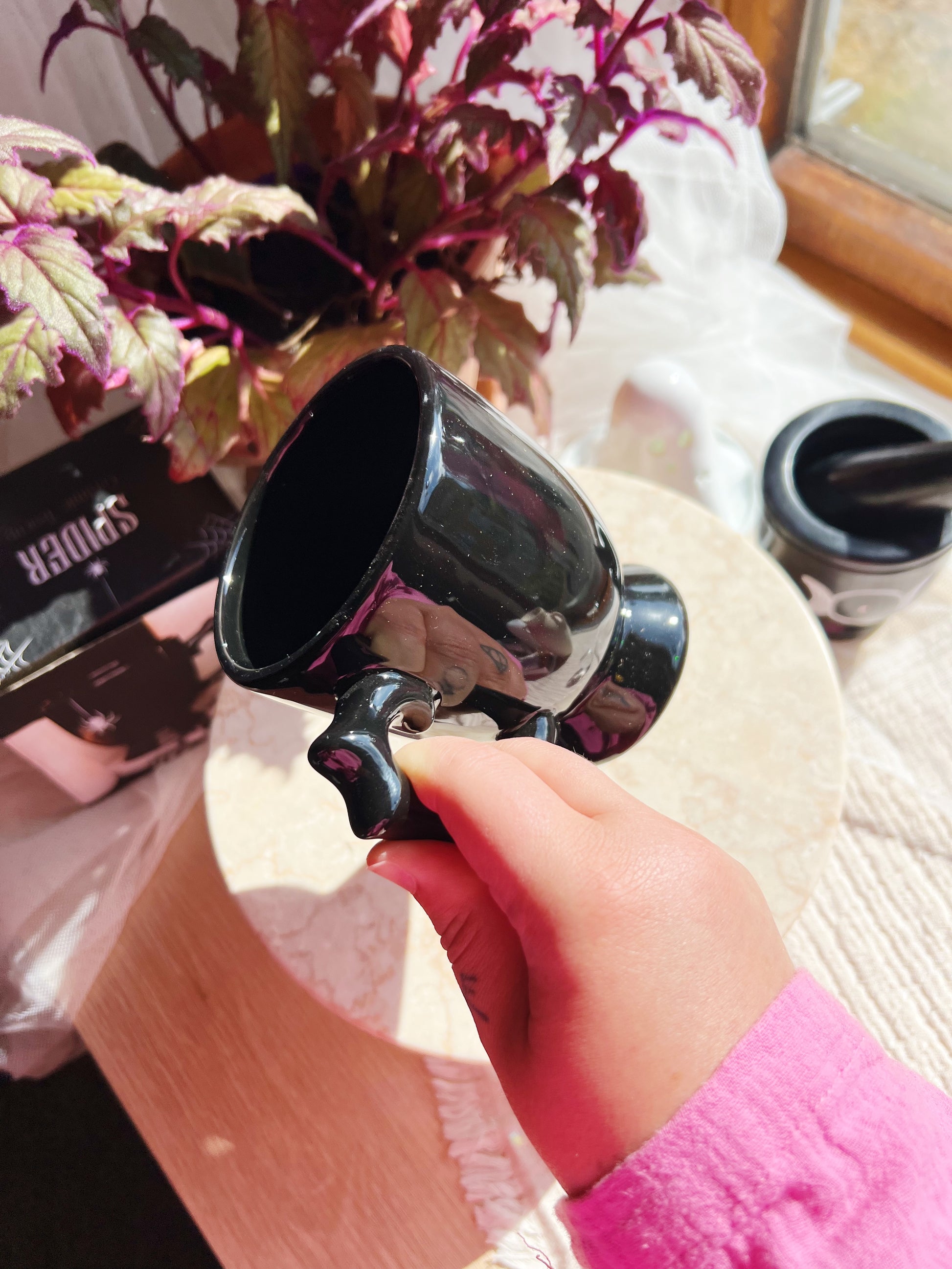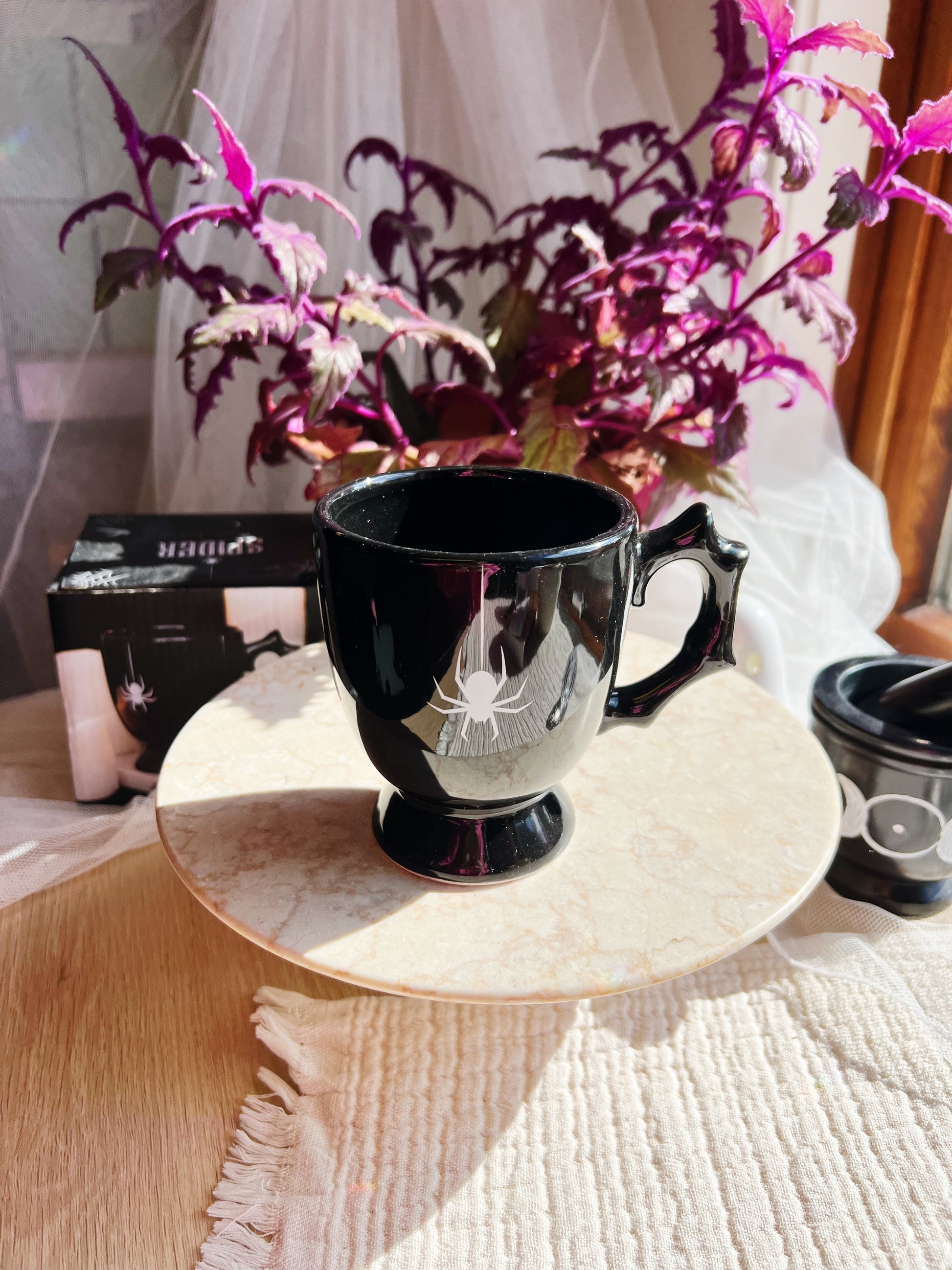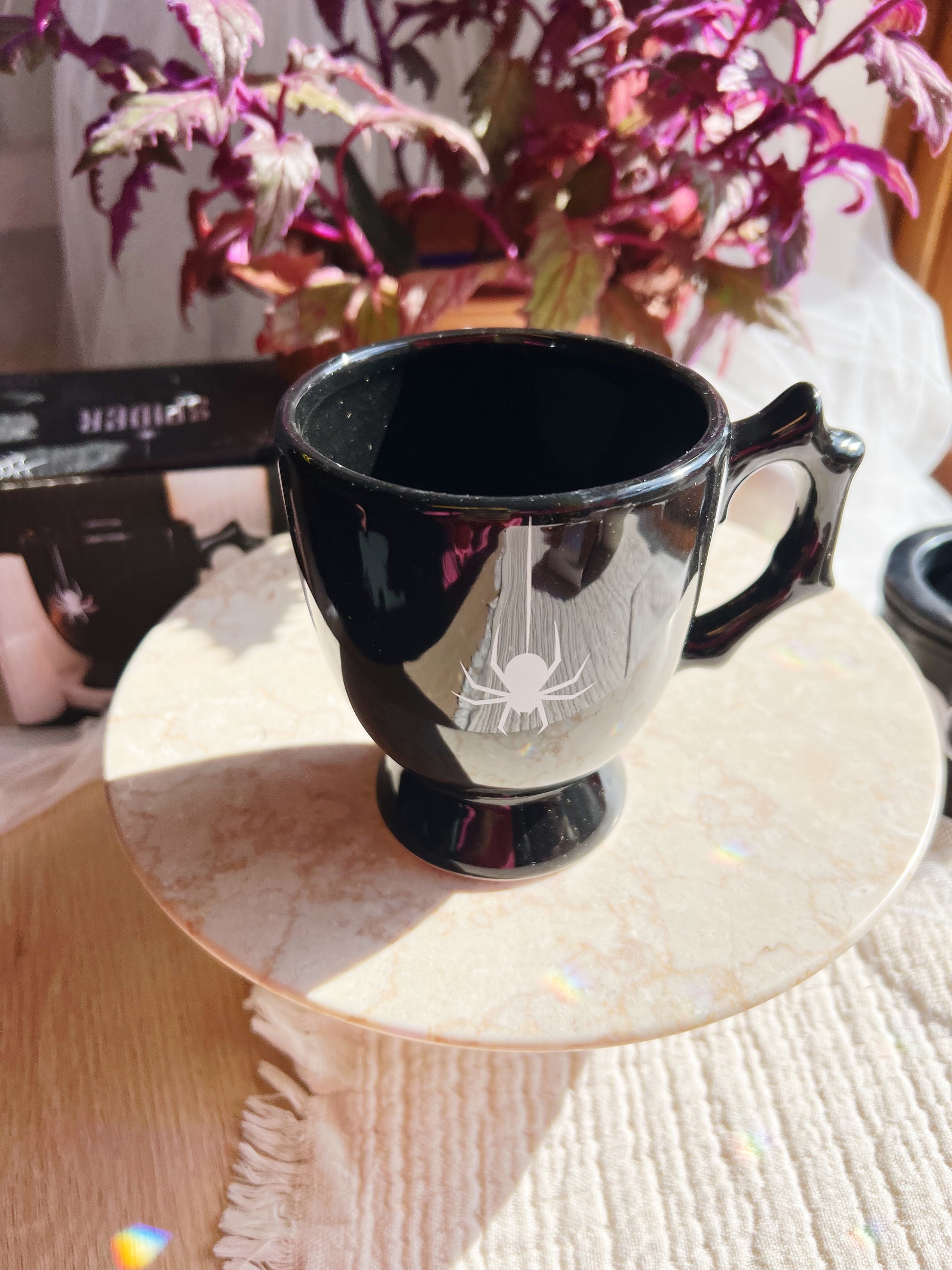 Vis frem din myke â men mystiske â side med denne unike gotiske tekoppen. Den sorte, torneaktige hanken og det subtile edderkoppdesignet gir en dramatisk, men elegant kontrast som gjĂžr denne koppen til et naturlig midtpunkt pĂ„ ethvert heksemĂžte, hĂžstmiddag eller mĂžrk teselskap.