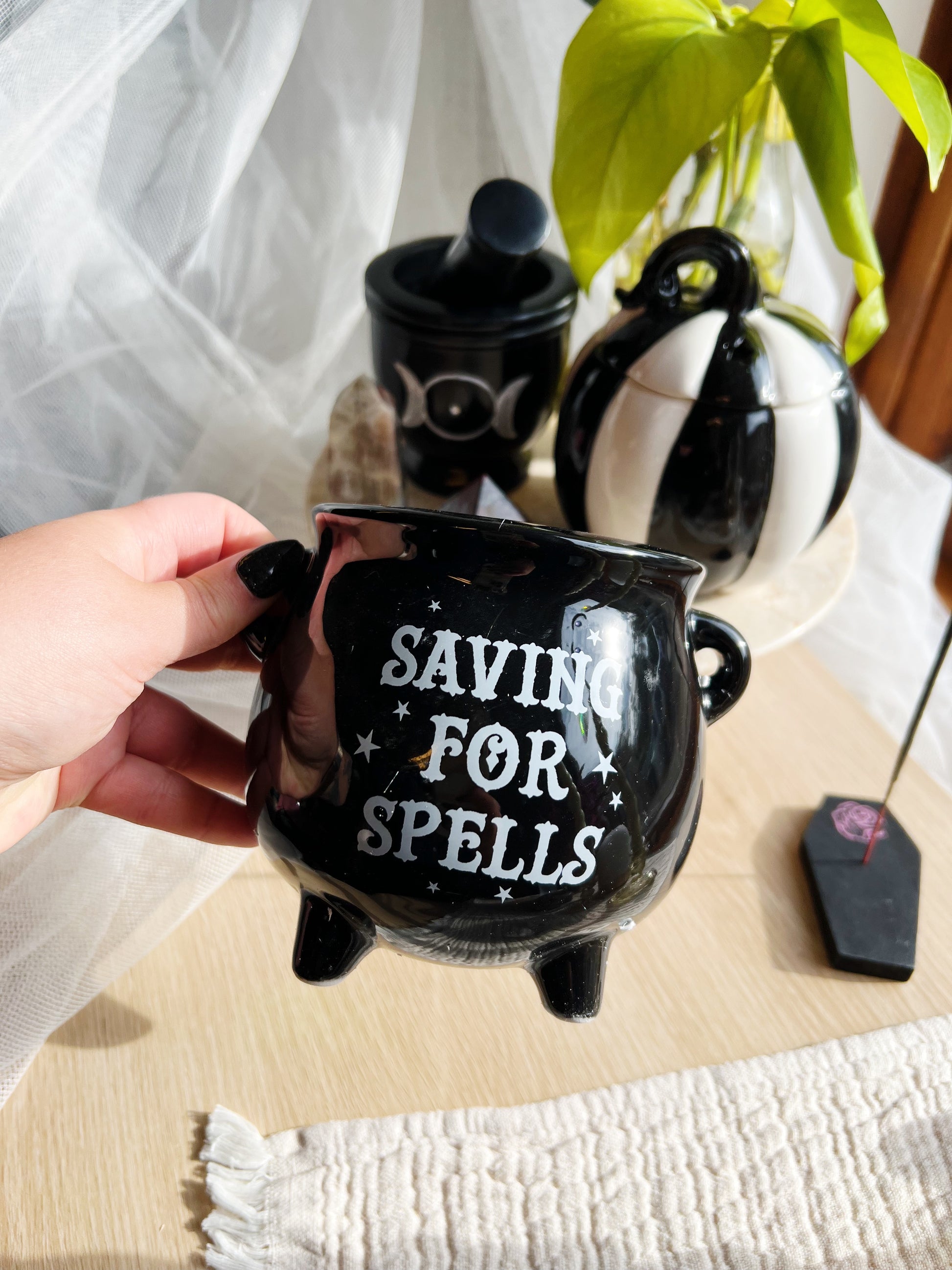 Store og smÄ hekser vil elske Ä samle myntene sine i denne keramiske kjelen! Med teksten «Saving for spells» pÄ forsiden er den perfekt for alle som sparer til magiske eventyr.