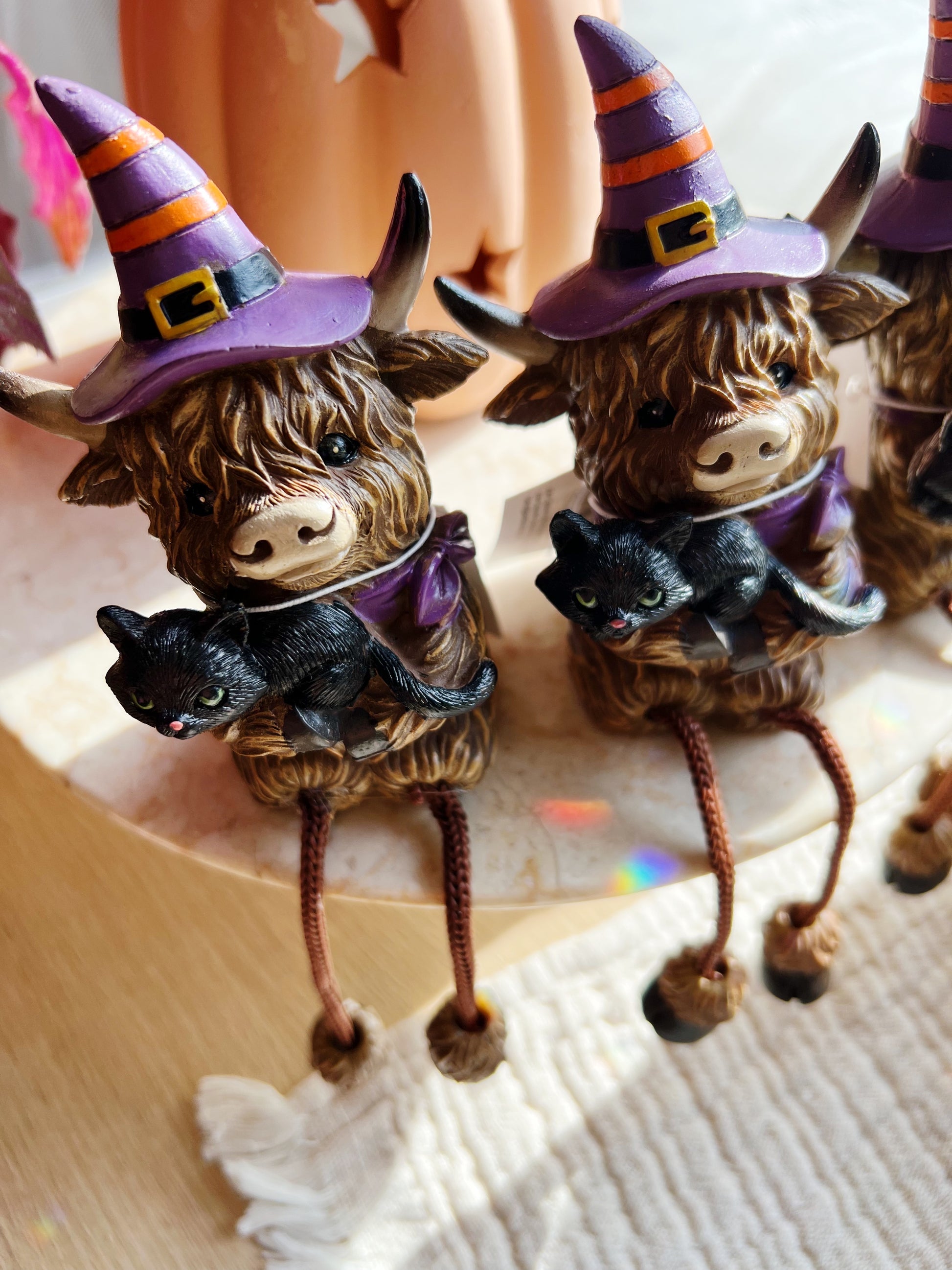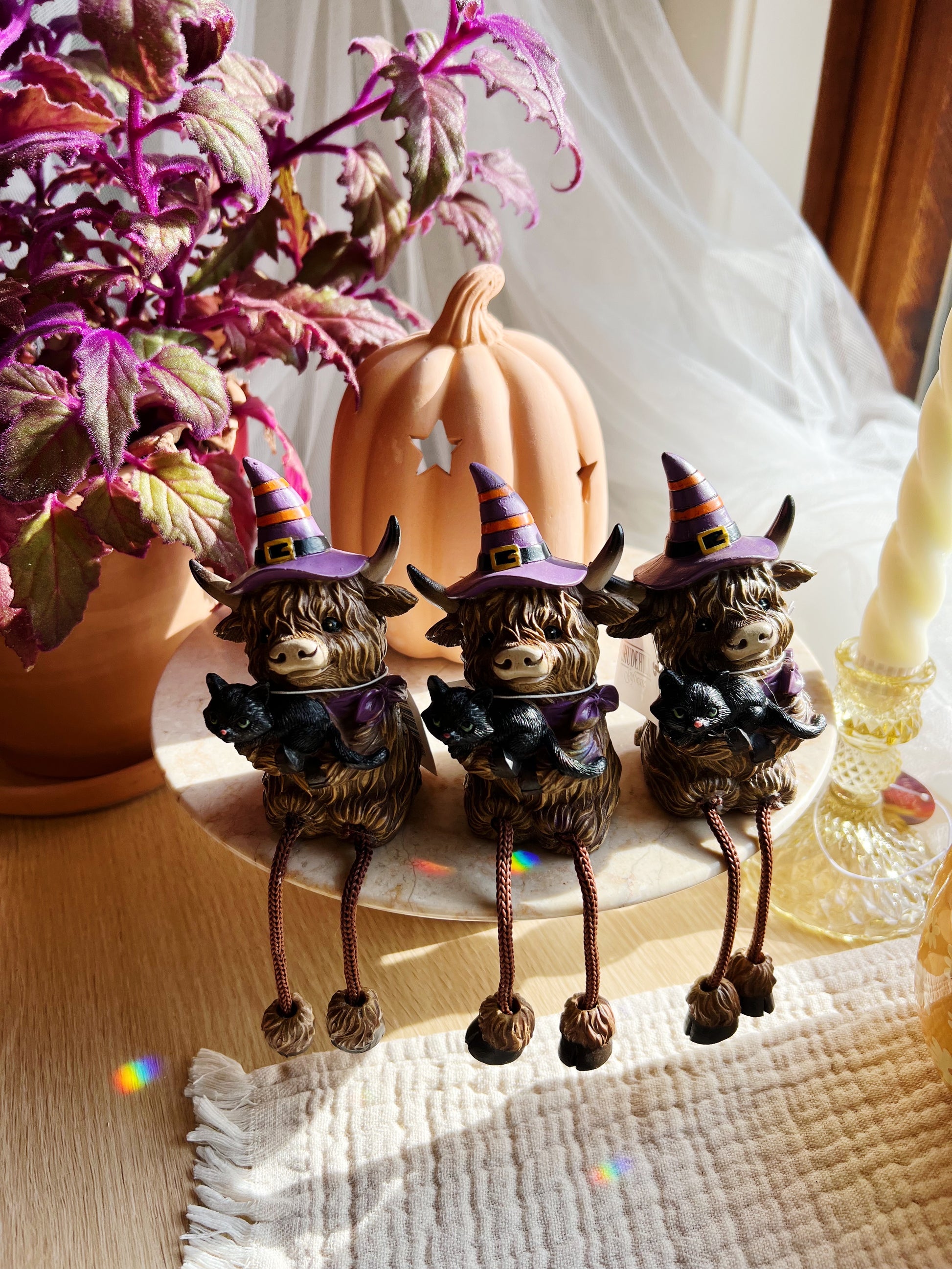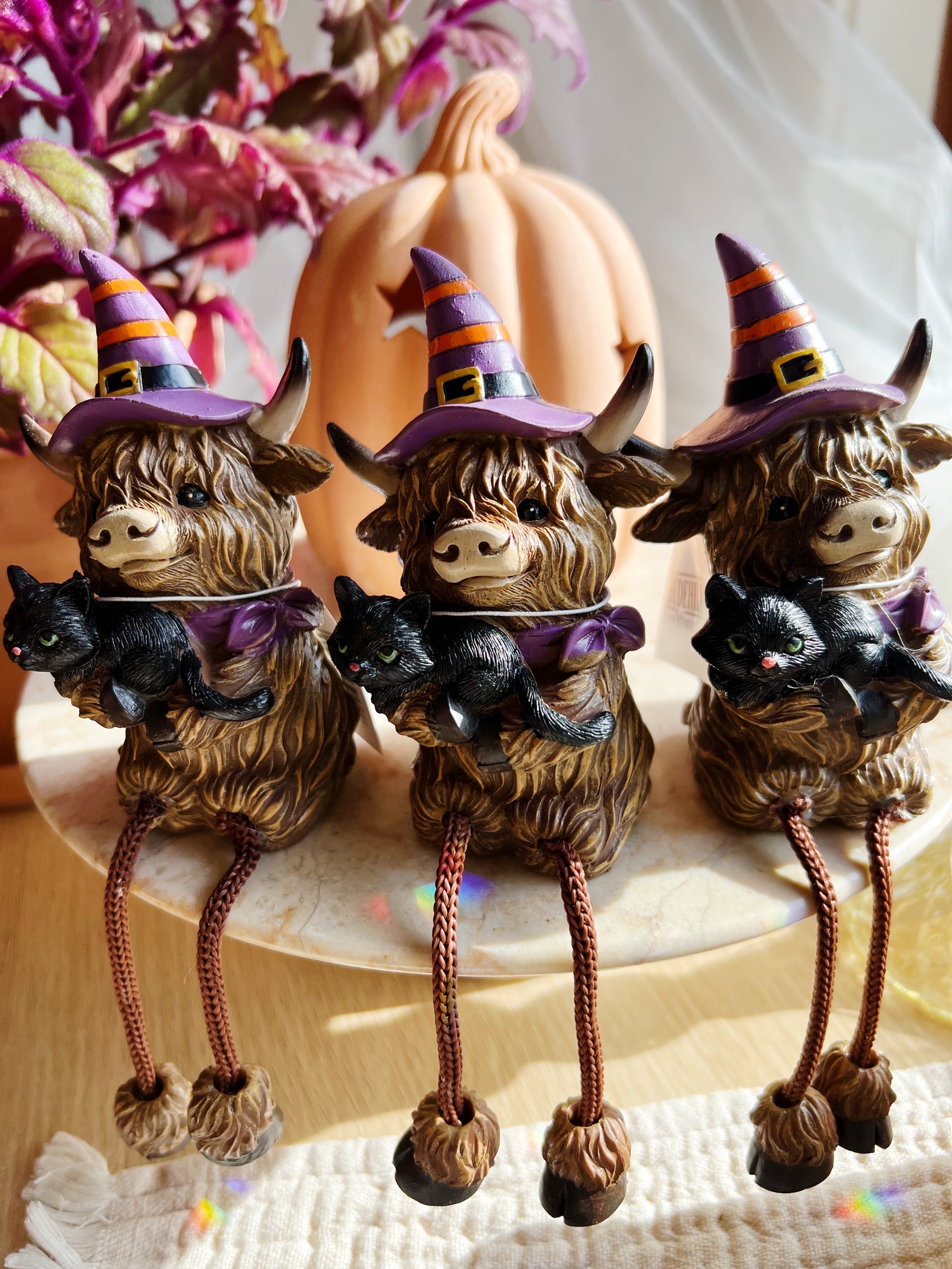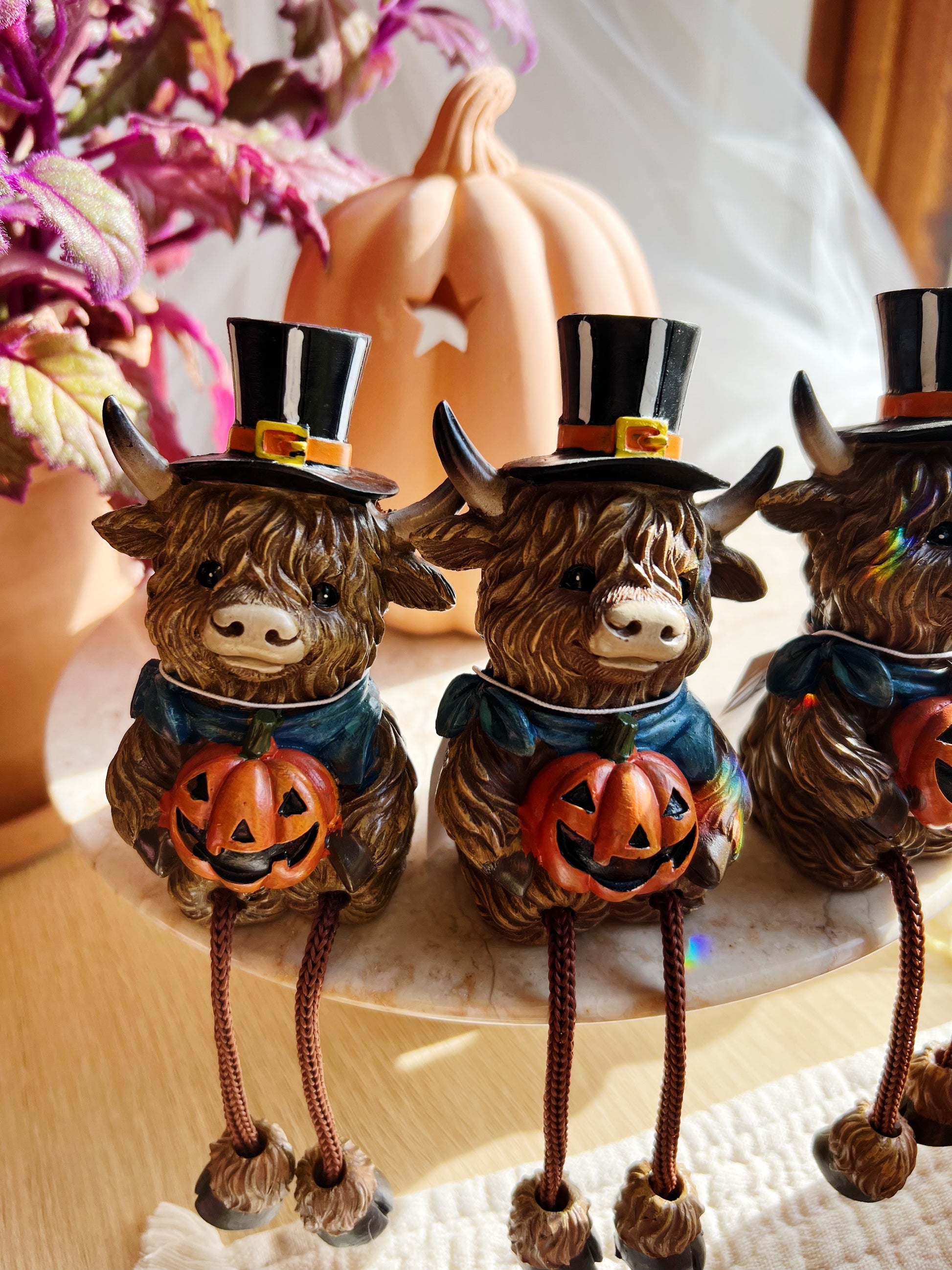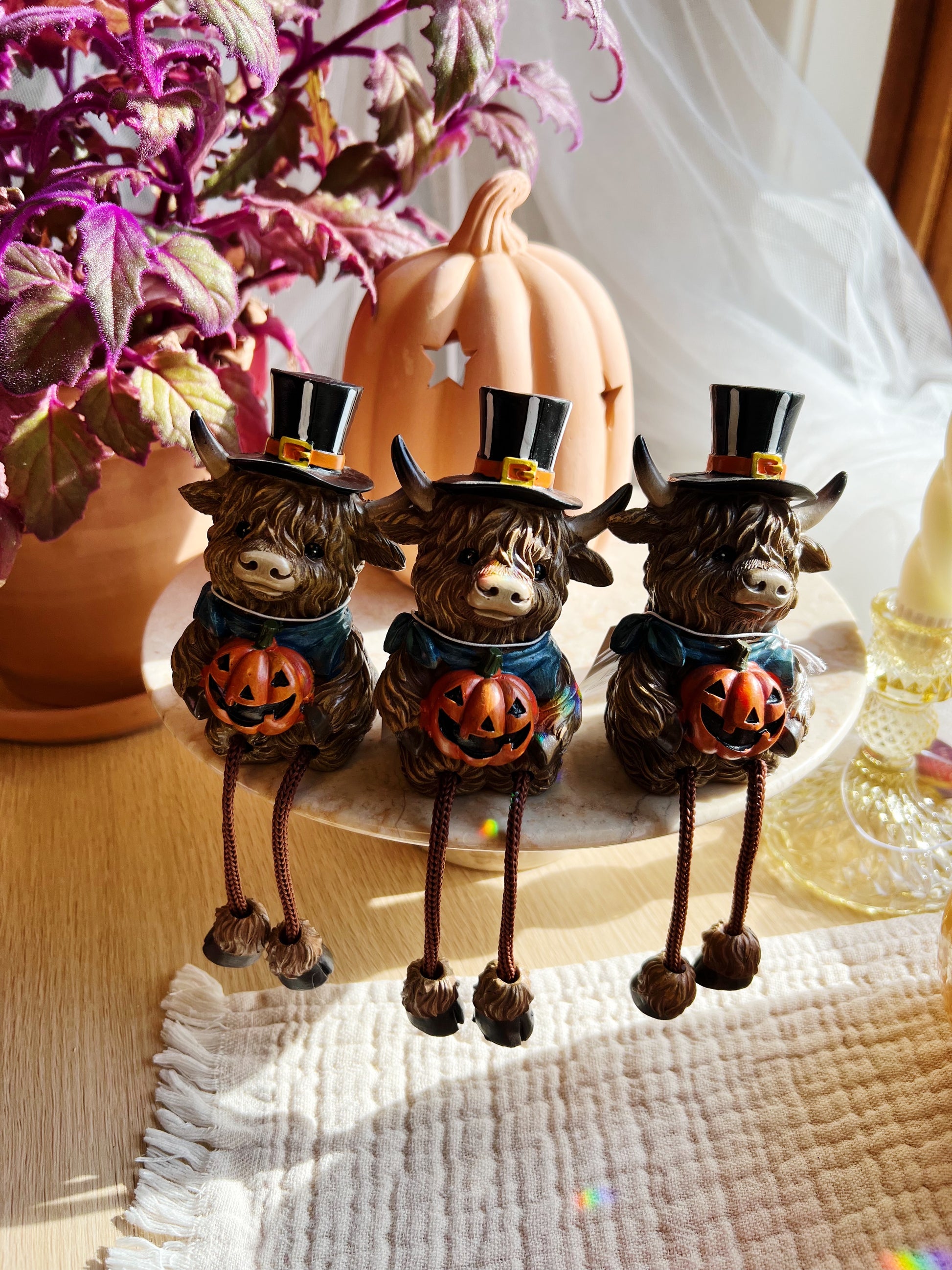 Møt høstens morsomste tilskudd! Våre Halloween Coos med dinglende ben er små, sjarmerende Highland-kyr laget i detaljert resin og malt for hånd – hver og én med sin egen rampete personlighet.