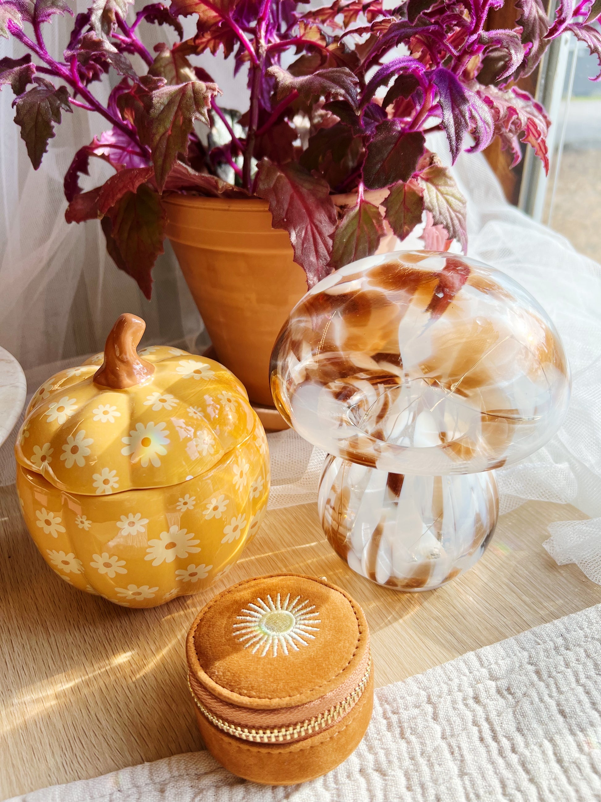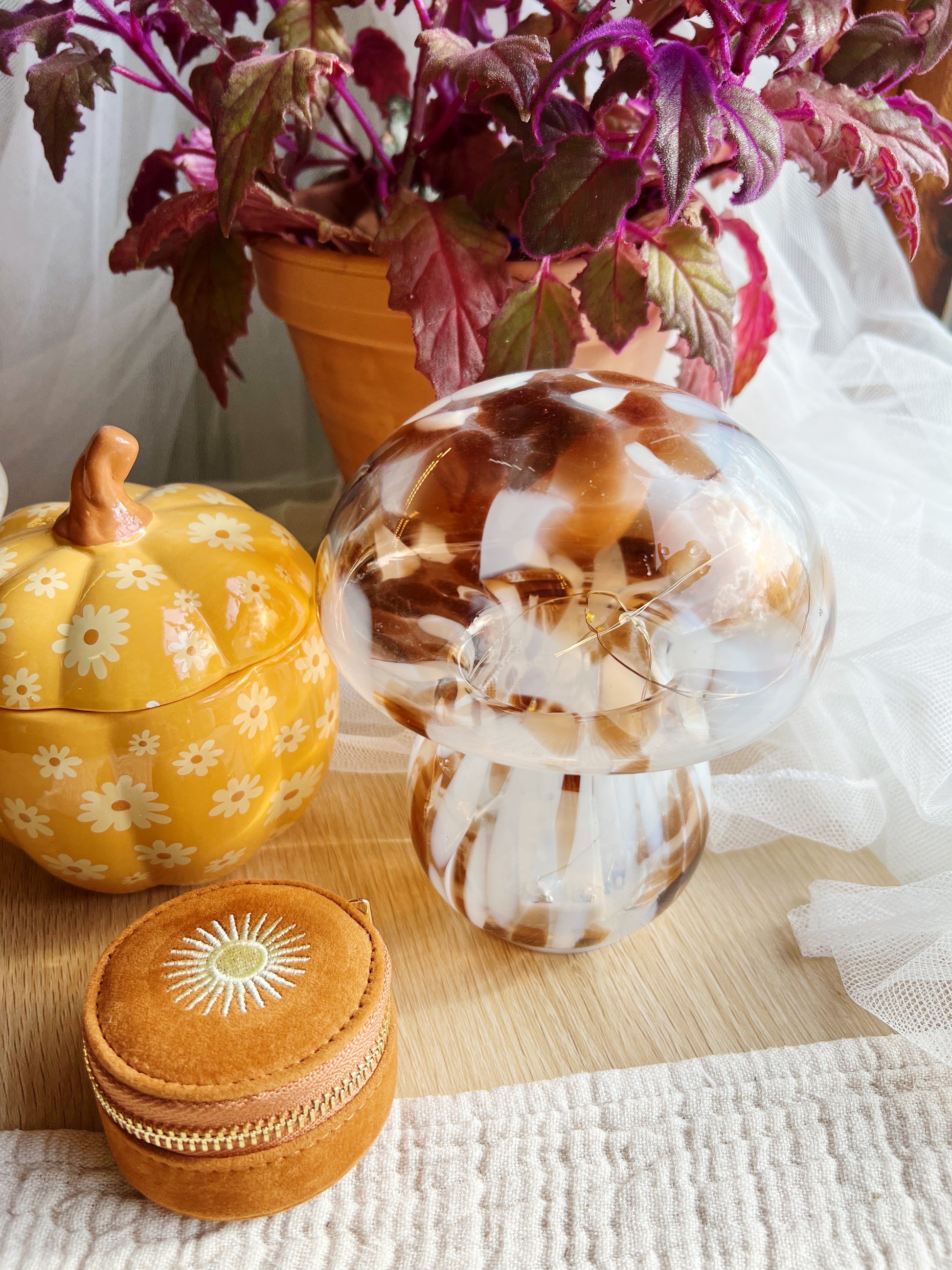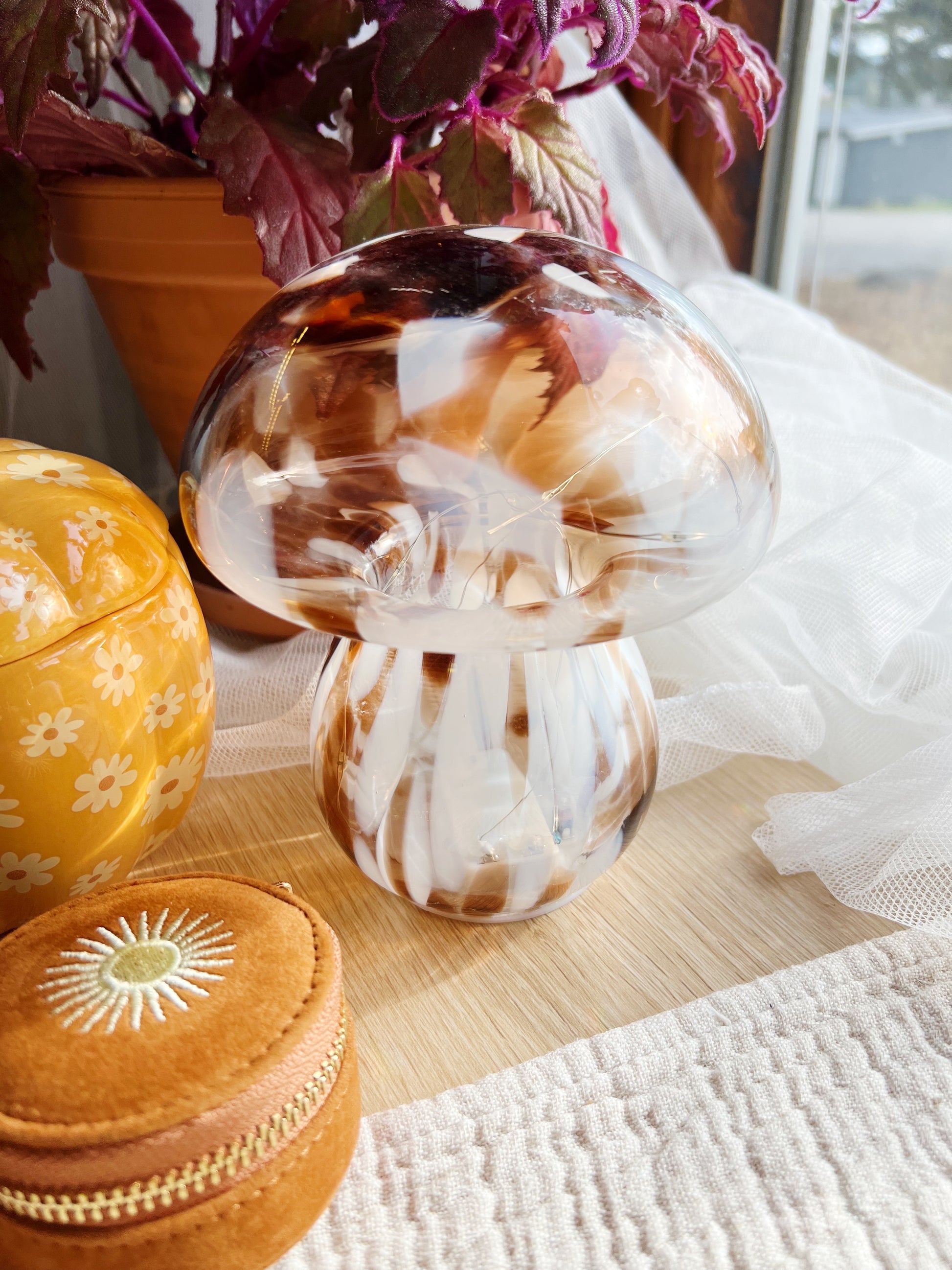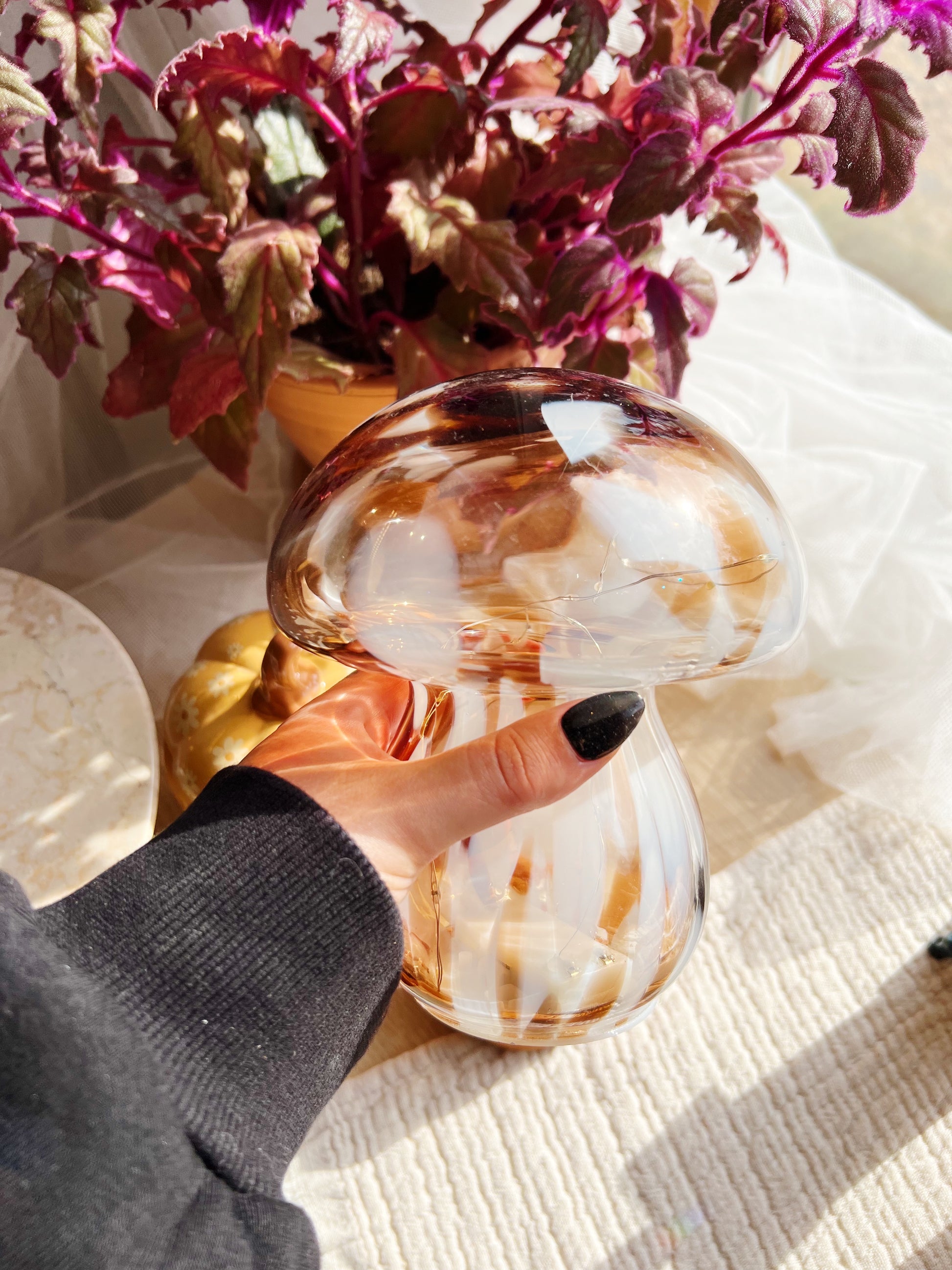 La hjemmet ditt fortrylles av denne unike sopplampen – et stemningsfullt smykke i håndblåst glass som lyser opp både rom og sinn.