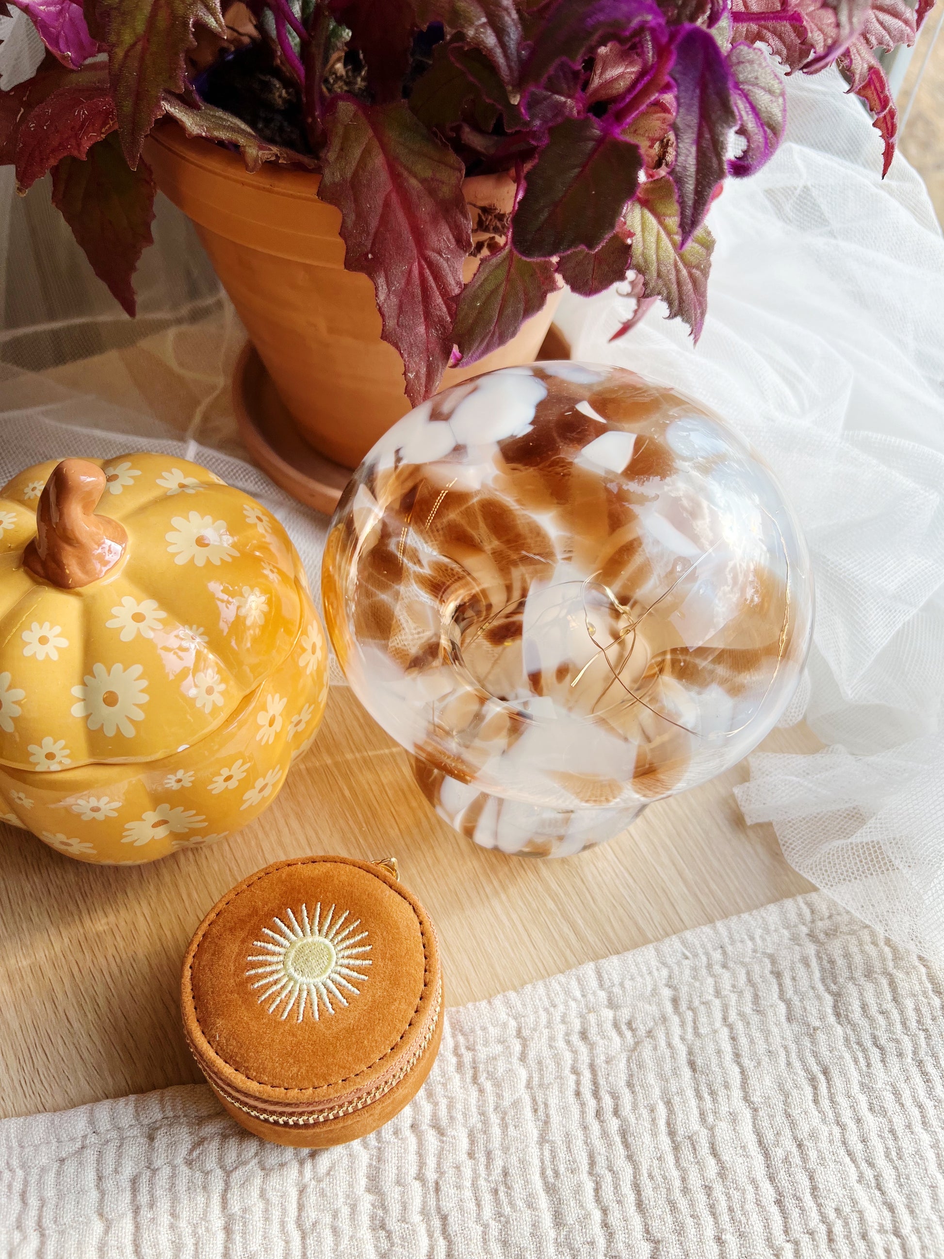 Hver lampe er håndlaget med kjærlighet, og ingen er helt like – hver glasskule er et lite kunstverk, med sine egne linjer, fargetoner og former. Inne i kulen skjuler det seg et varmt LED-lys som sprer et mykt, gyllent skinn – akkurat som gløden fra et eventyr du nesten husker.