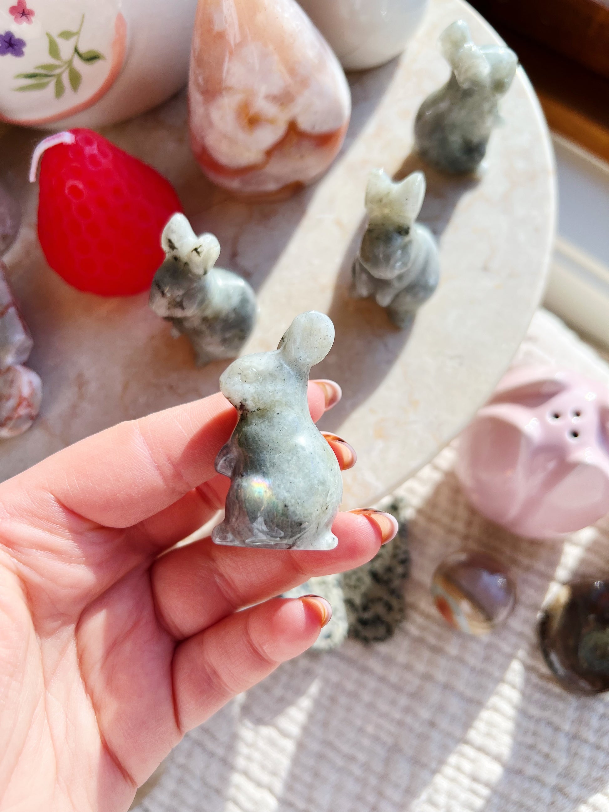 Denne mystiske kaninfiguren er håndskjært i ekte Labradoritt fra Madagaskar. Labradoritt er en kraftfull krystall kjent for å vekke intuisjonen, styrke synske evner og beskytte mot negativ energi. Dens magiske skjær av blå, grønn og gull gjør hver figur unik.