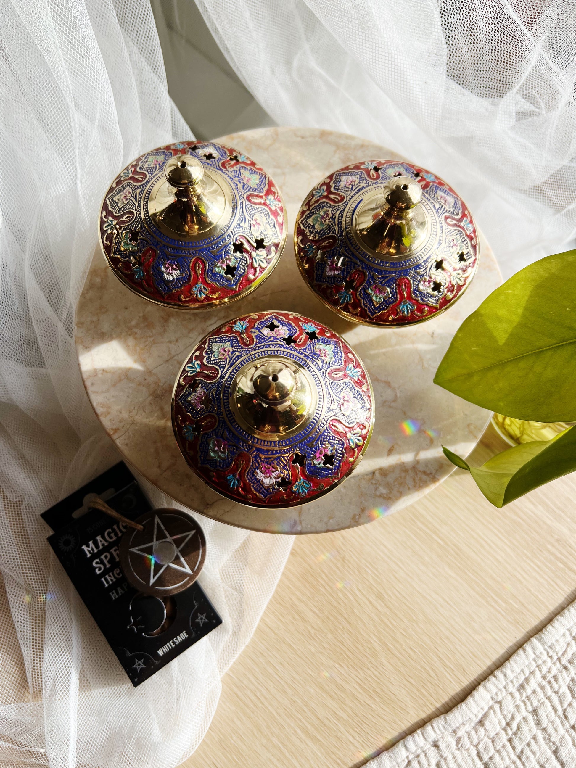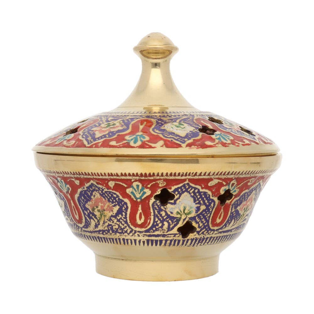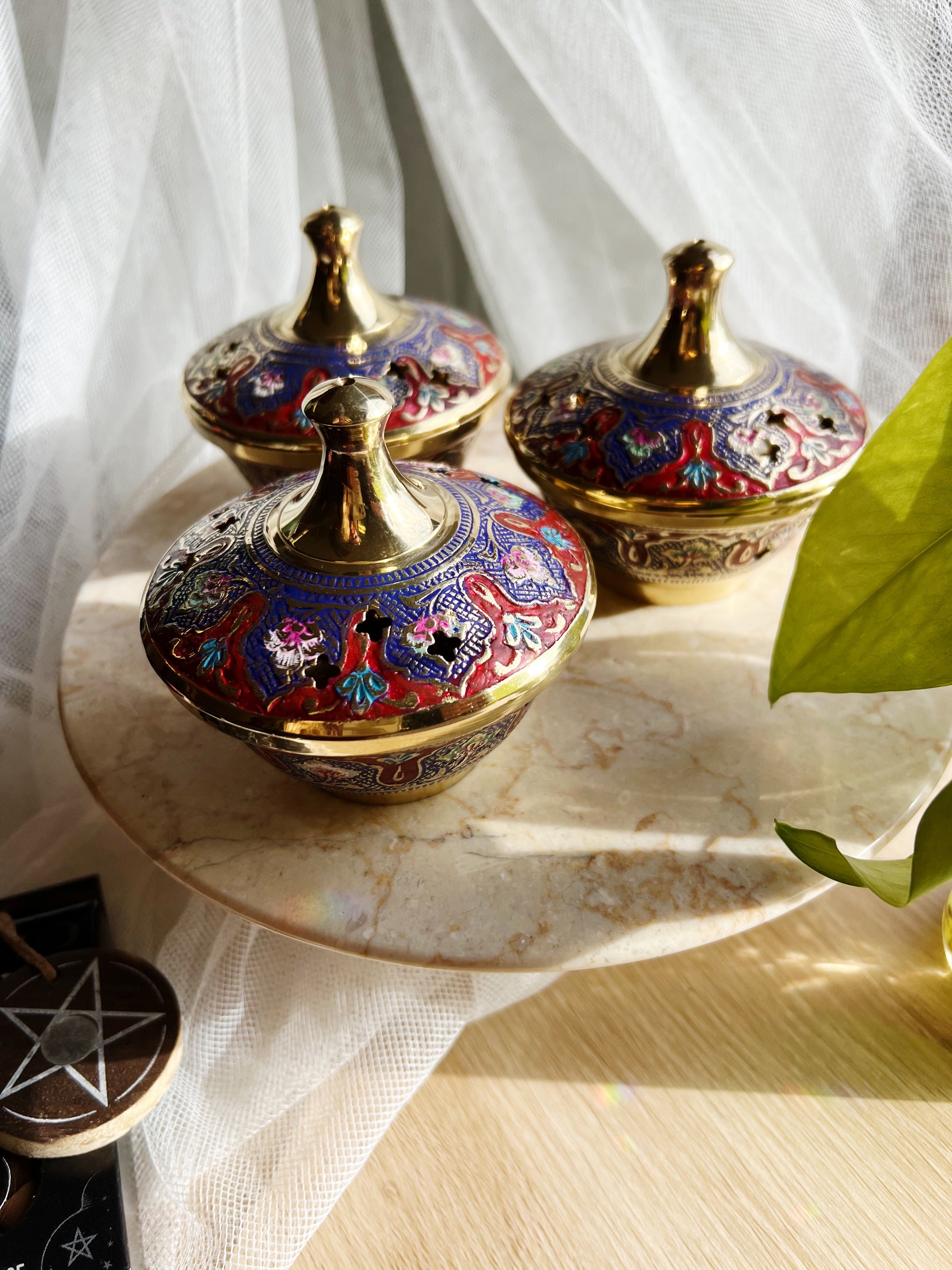 🕯️ Stor Røkelsesbrenner i Bronse med Fargede Inngraverte Detaljer