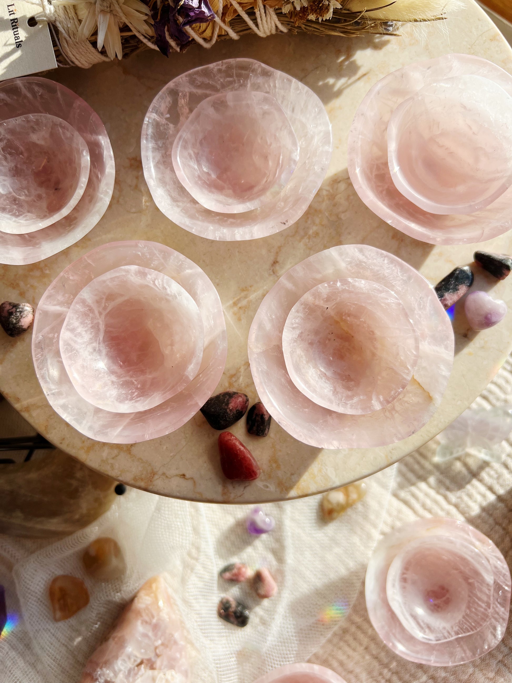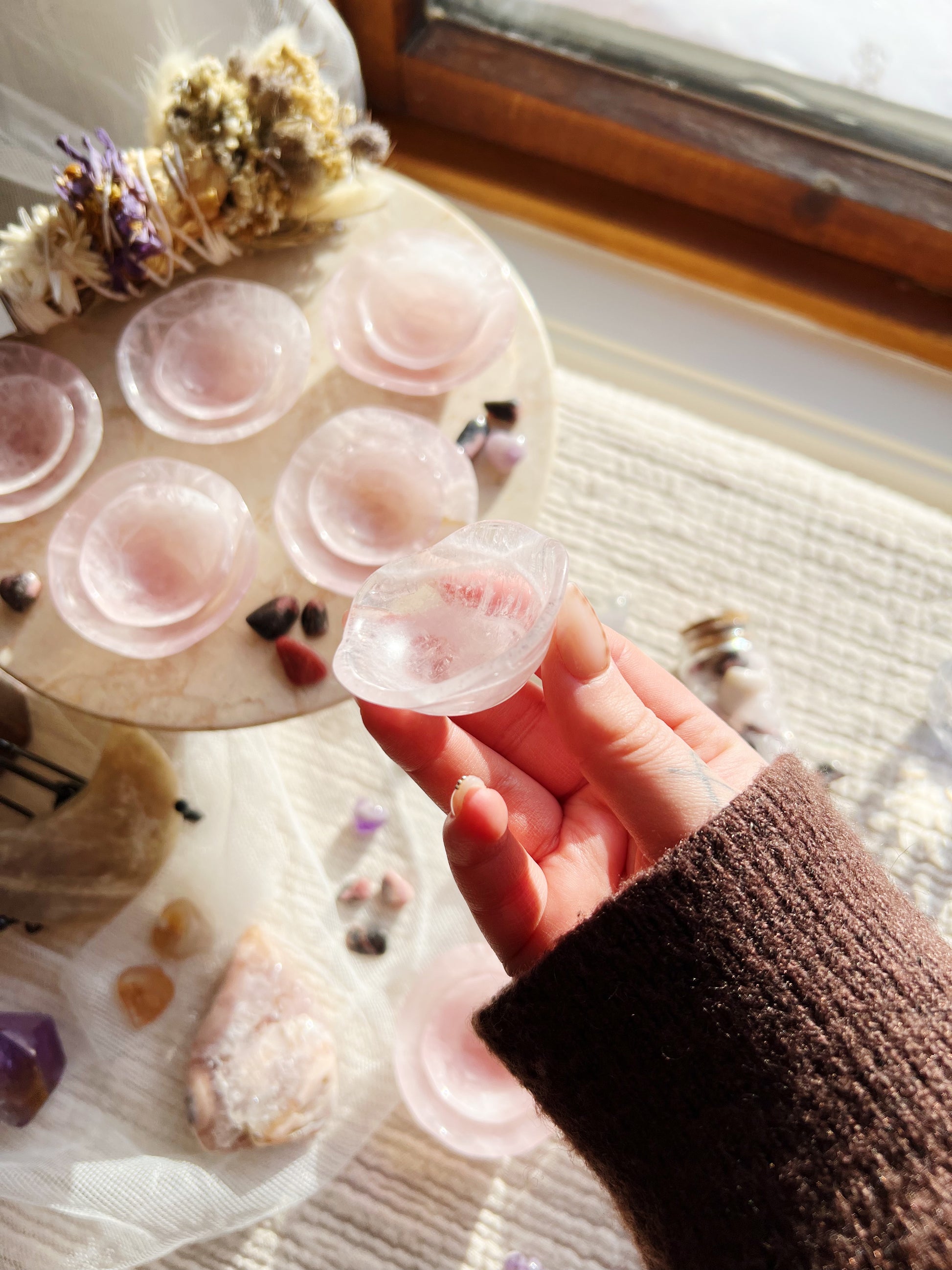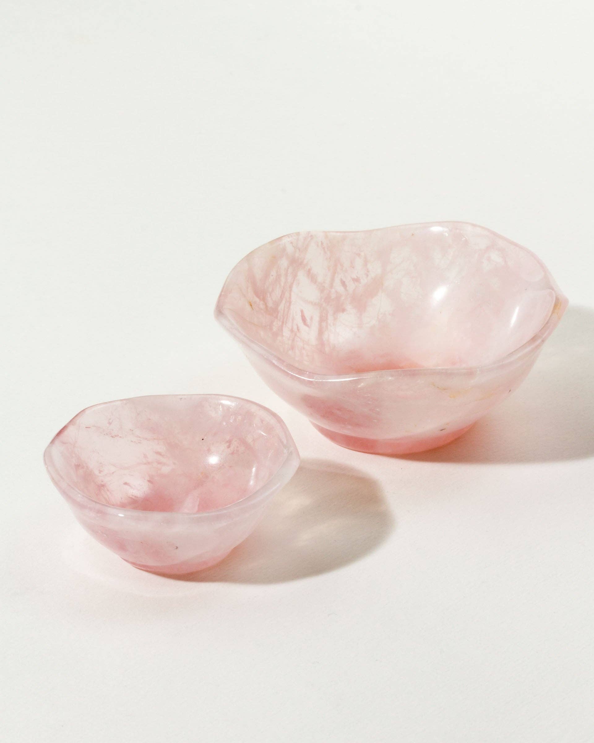 Laget av ekte rosenkvarts, er hver skål unikt utskjært og passer perfekt inn i dekoren din. Selv om ingen to er like, har hver skål en subtil bølget kant, som minner om kurvene og kantene til et roseblad, et ikonisk symbol på kjærlighet.