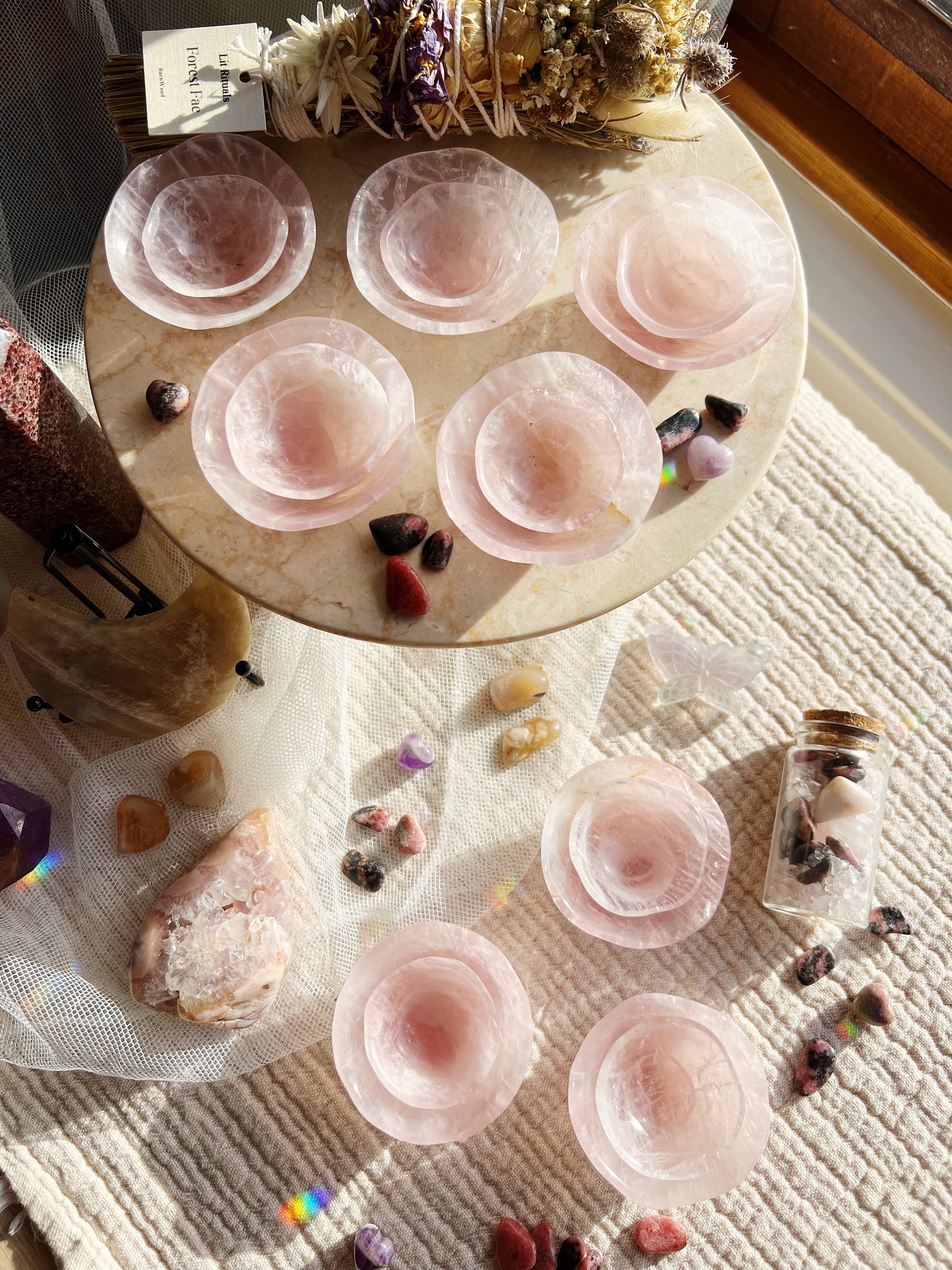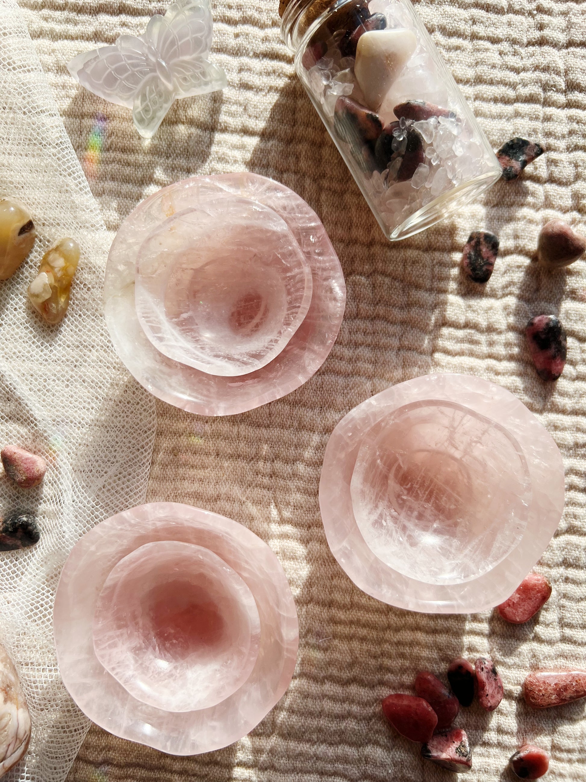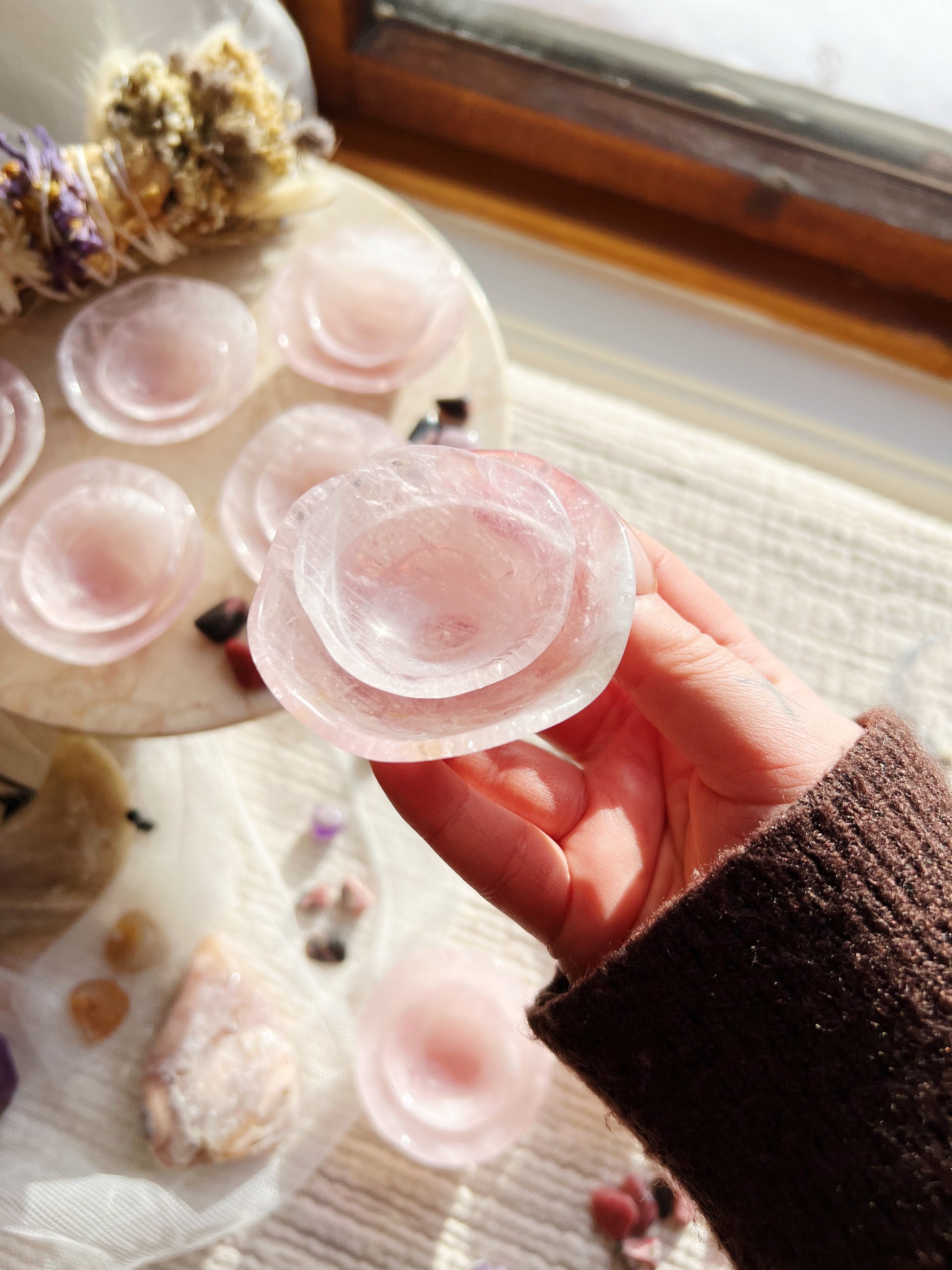 Laget av ekte rosenkvarts, er hver skål unikt utskjært og passer perfekt inn i dekoren din. Selv om ingen to er like, har hver skål en subtil bølget kant, som minner om kurvene og kantene til et roseblad, et ikonisk symbol på kjærlighet.