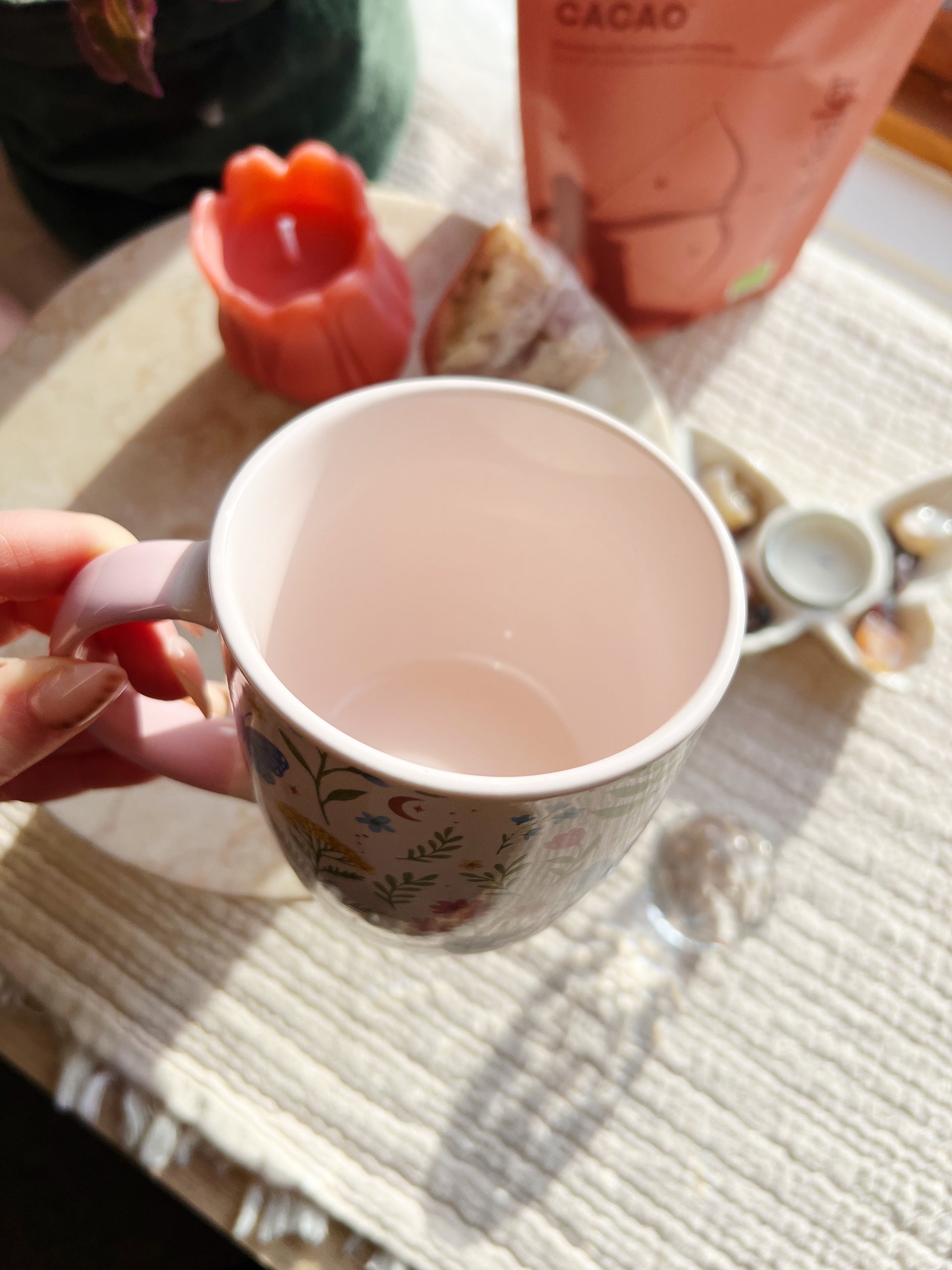 Denne sjarmerende keramiske koppen er dekorert med et delikat blomstermotiv i myke pastellfarger. Perfekt for å tilføre en touch av vårlig stemning til morgenkaffen eller teen din. Med sin lekne blomsterestetikk bringer denne koppen glede til enhver kopp.