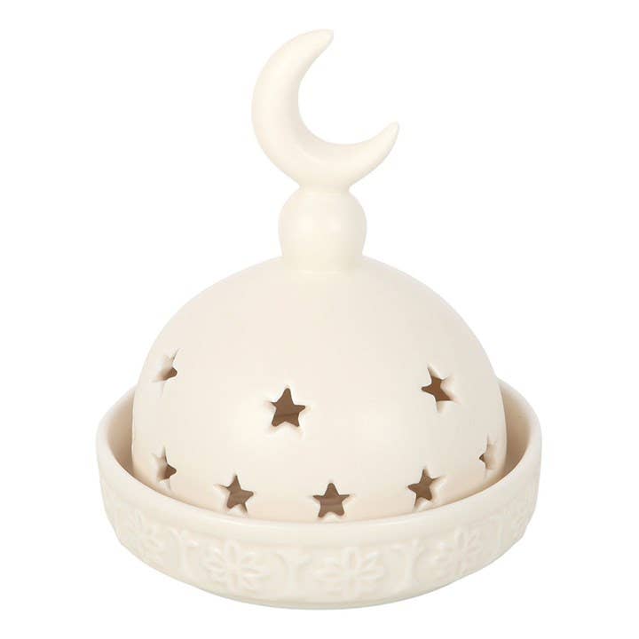 Denne vakre keramiske holderen med dekorativt moské-design kan brukes både til røkelseskjegler og telys, og gir deg fleksibilitet for ulike ritualer og stemninger. Et stilfullt stykke for hyller, alteret eller nattbordet som bringer varme og karakter til ethvert rom.