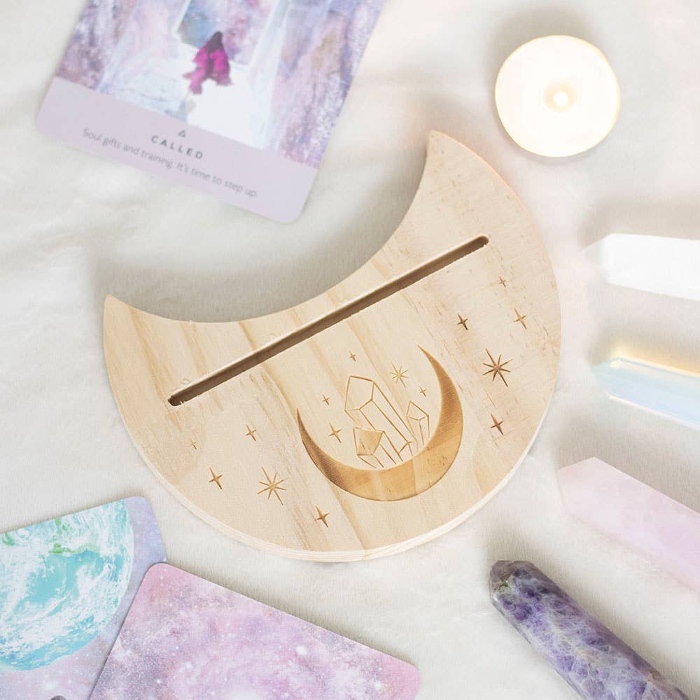 Dette vakre trestavtivet med mystisk halvmåne-design lar deg vise frem ditt daglige tarotkort, slik at kortets budskap virkelig kan resonere gjennom dagen. Perfekt for å holde ditt valgte kort synlig på alteret, skrivebordet eller nattbordet.