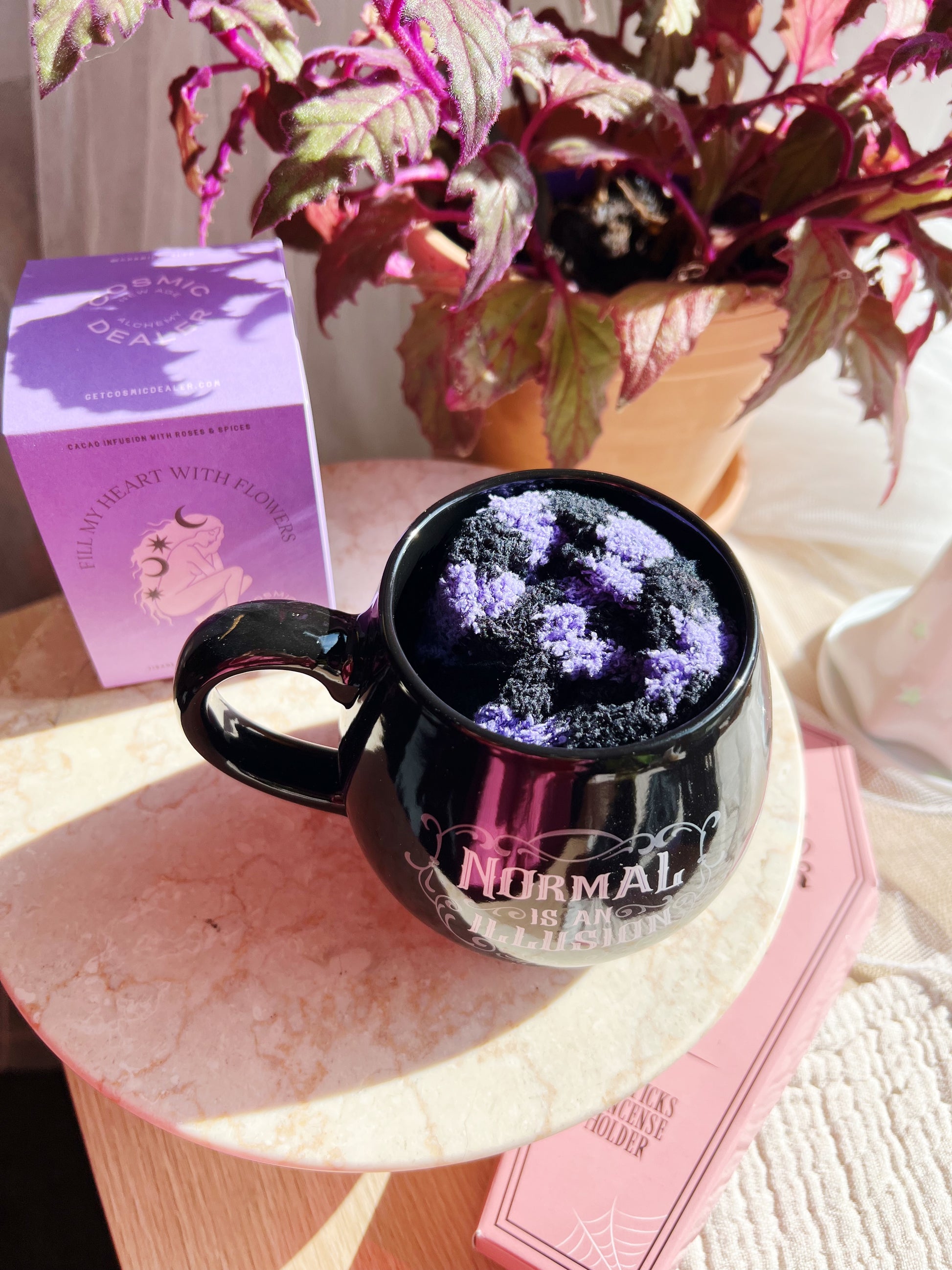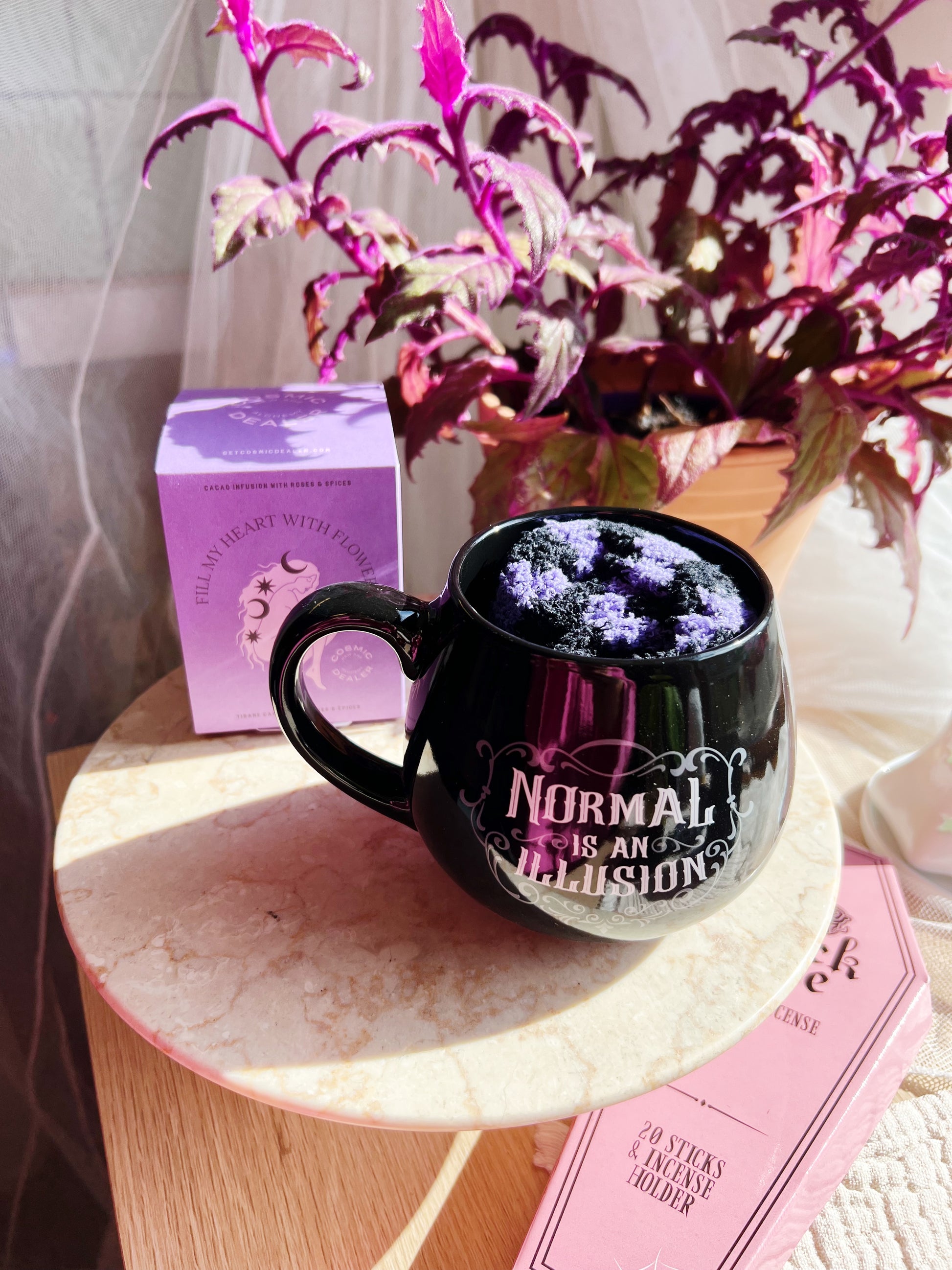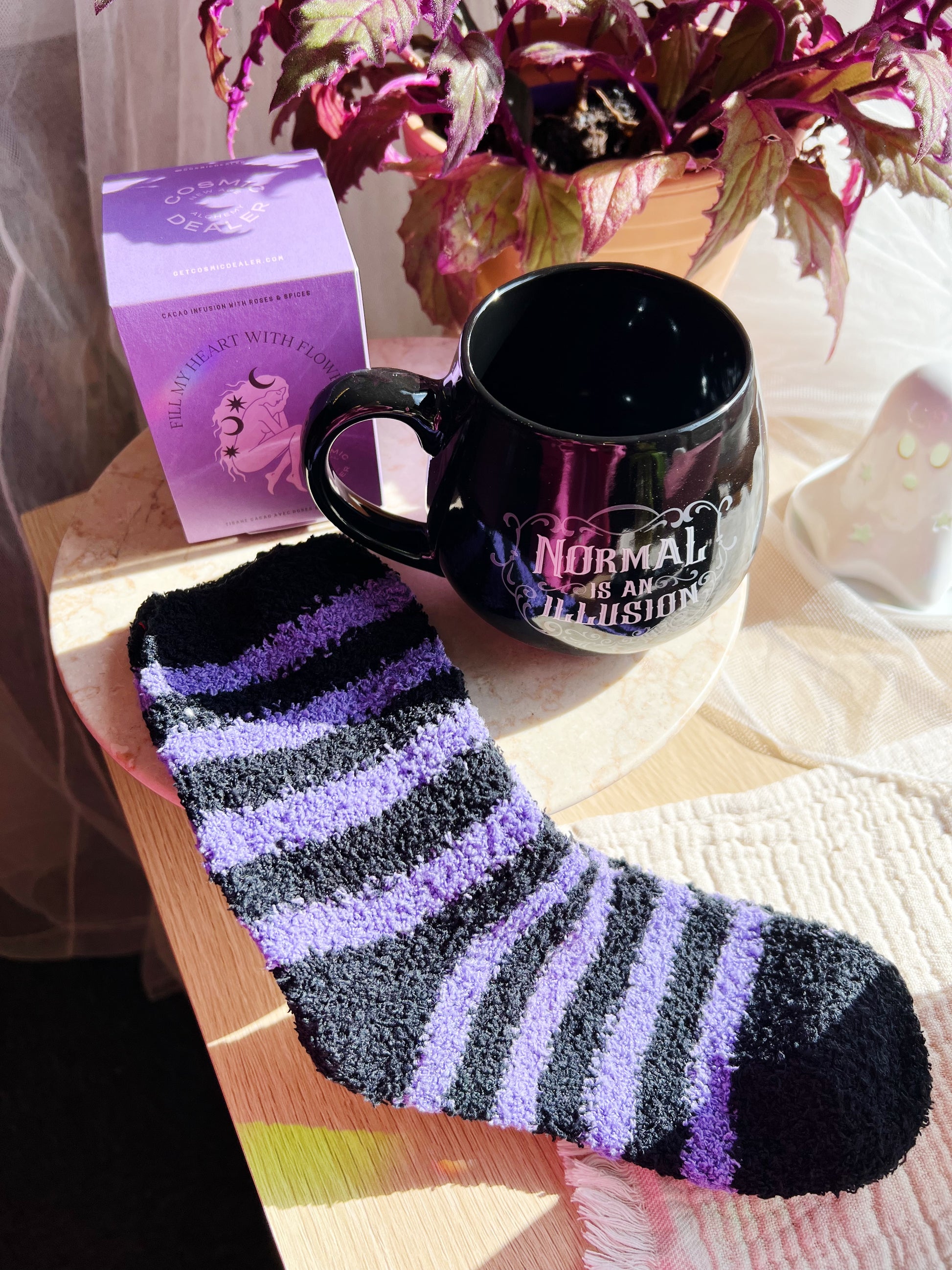 Varm opp selv det kaldeste, mĂžrkeste hjerte med dette herlige (og litt onde) gavesettet! Settet inkluderer et sort keramikkkrus med teksten "Normal is an Illusion" og et matchende par myke, fluffy sokker i svart og lilla striper.
