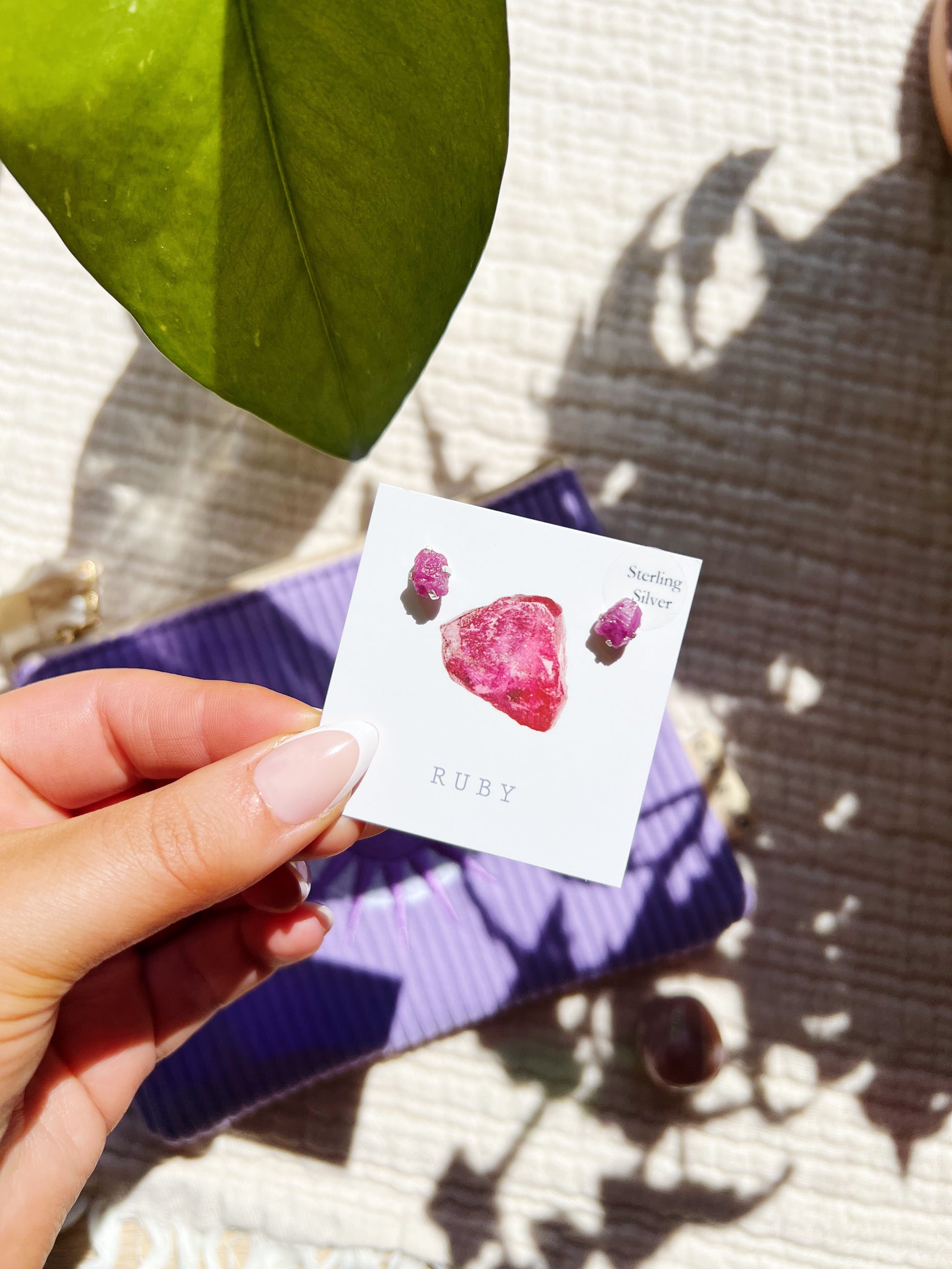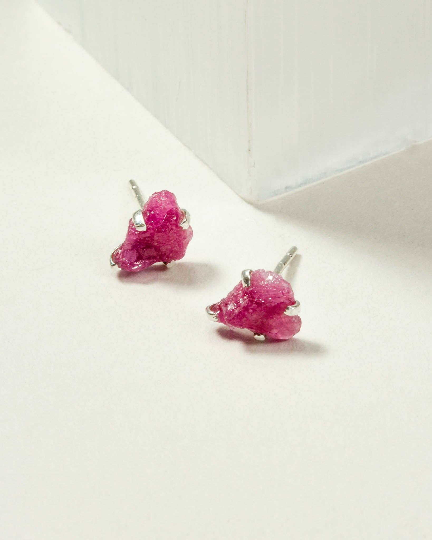 Disse øredobbene i sterlingsølv bærer ekte rubiner, hver med sin egen unike form og glød. Et meningsfullt smykke for deg som ønsker å leve med åpent hjerte og sterk vilje.
