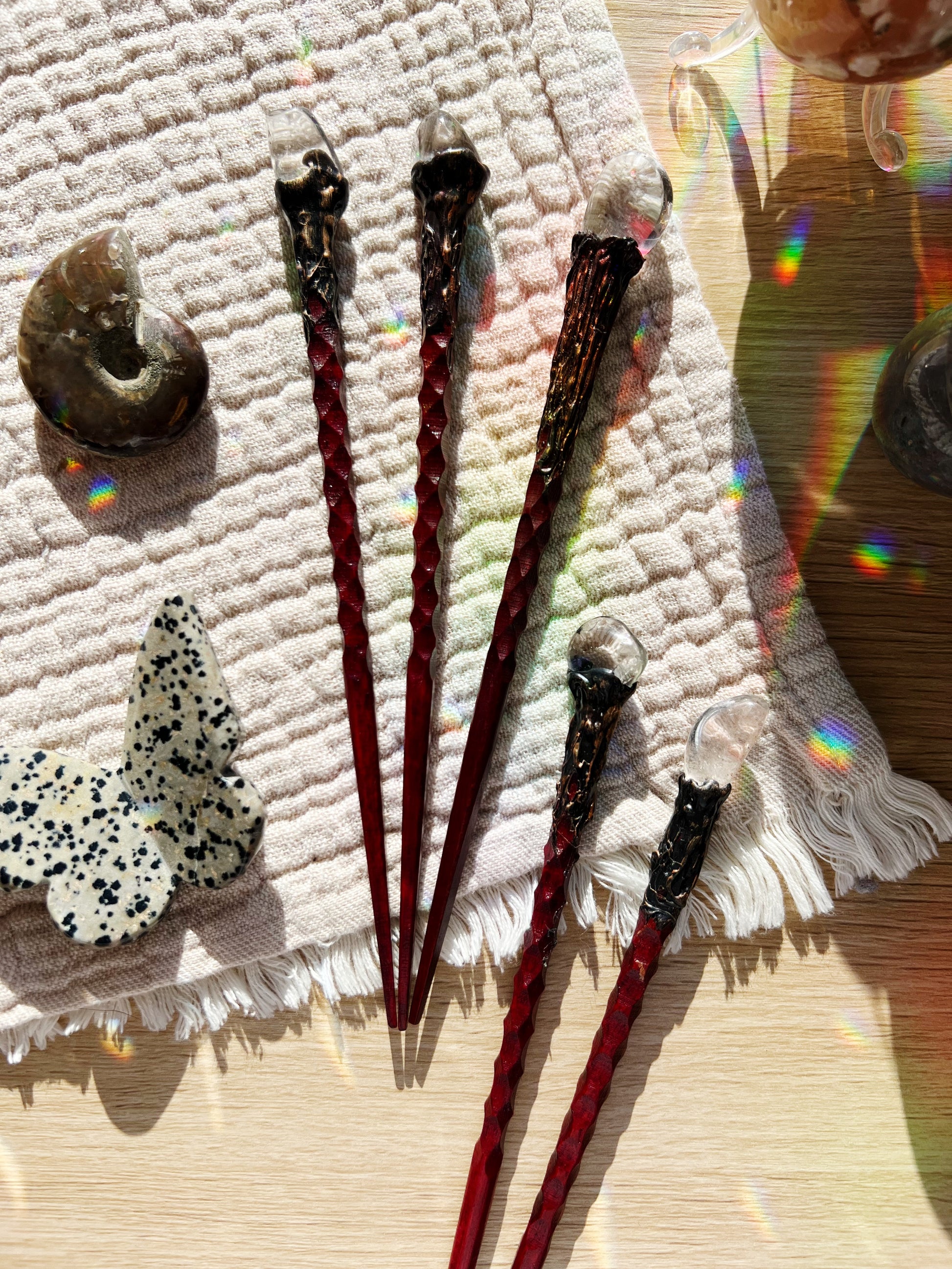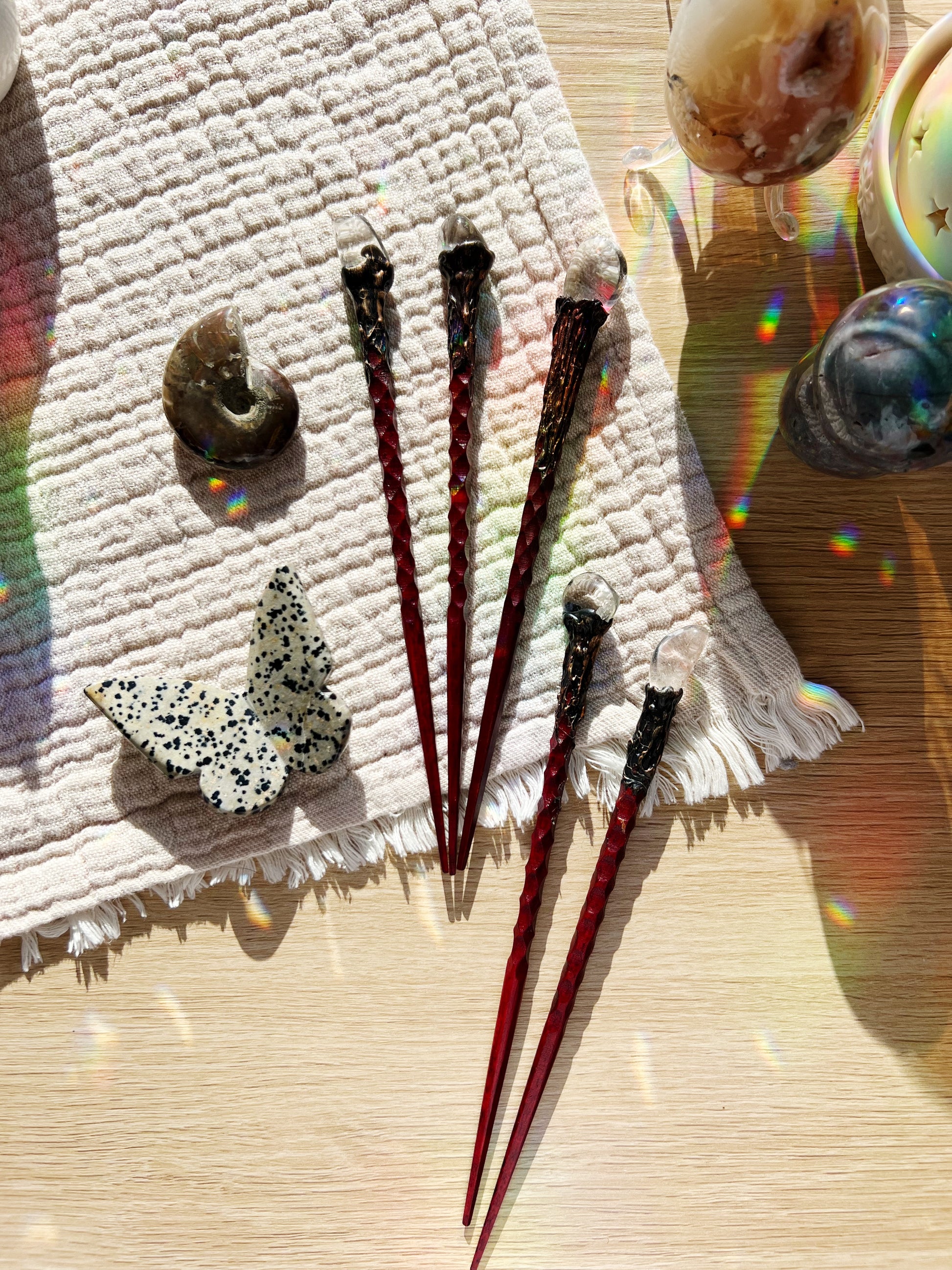 Siden hver krystall er naturlig og unik, kan farge og form variere. Dette gjør hver hårnål til et unikt smykke.