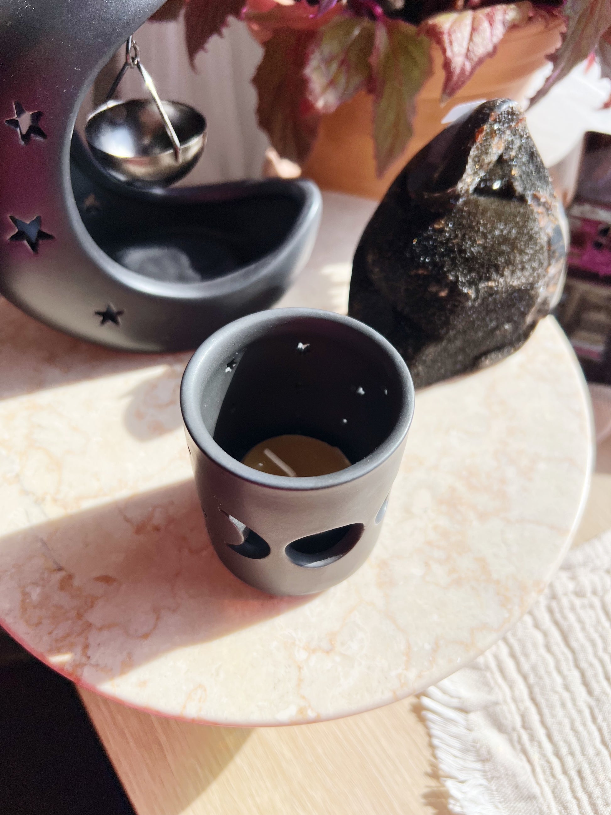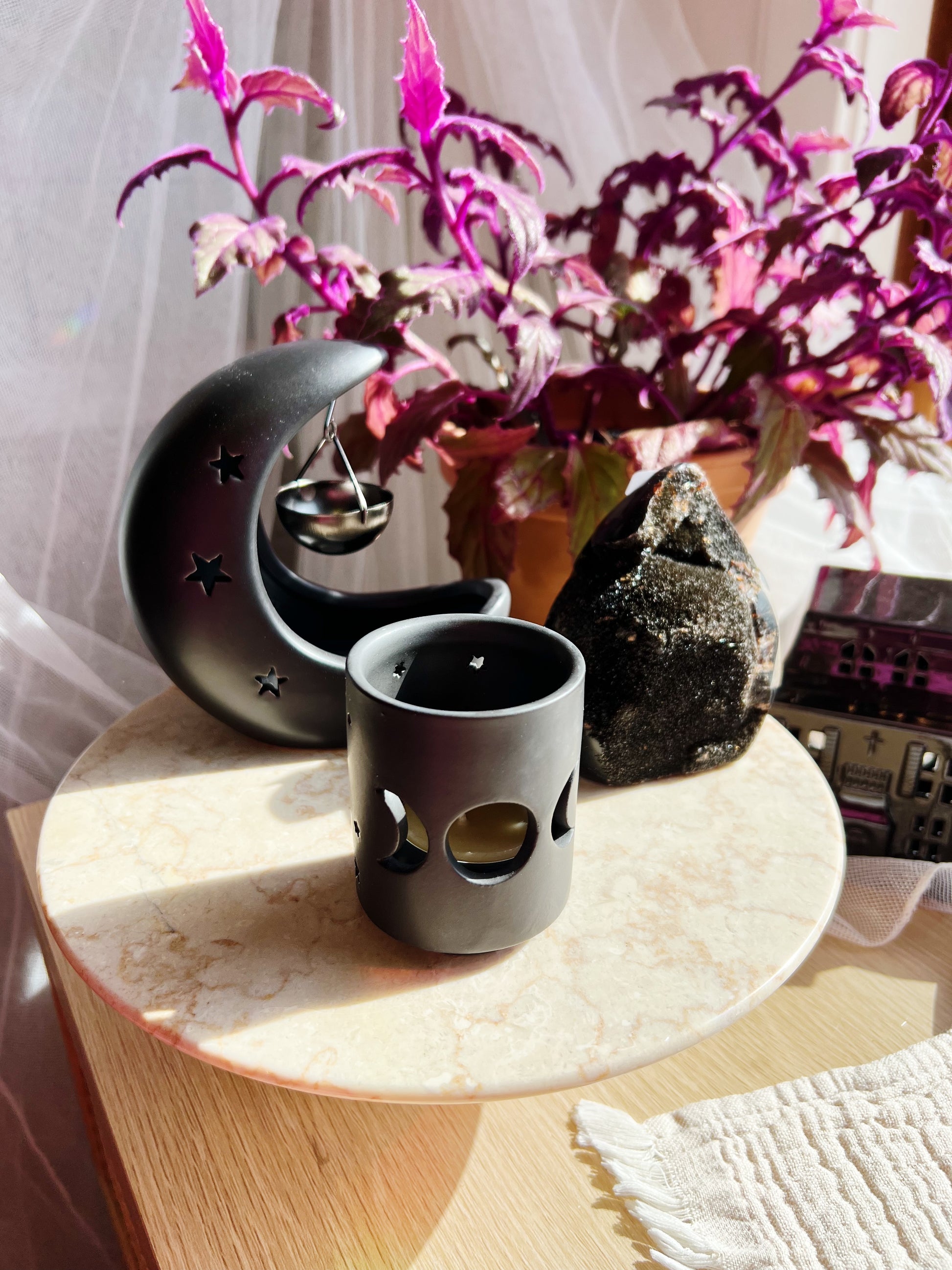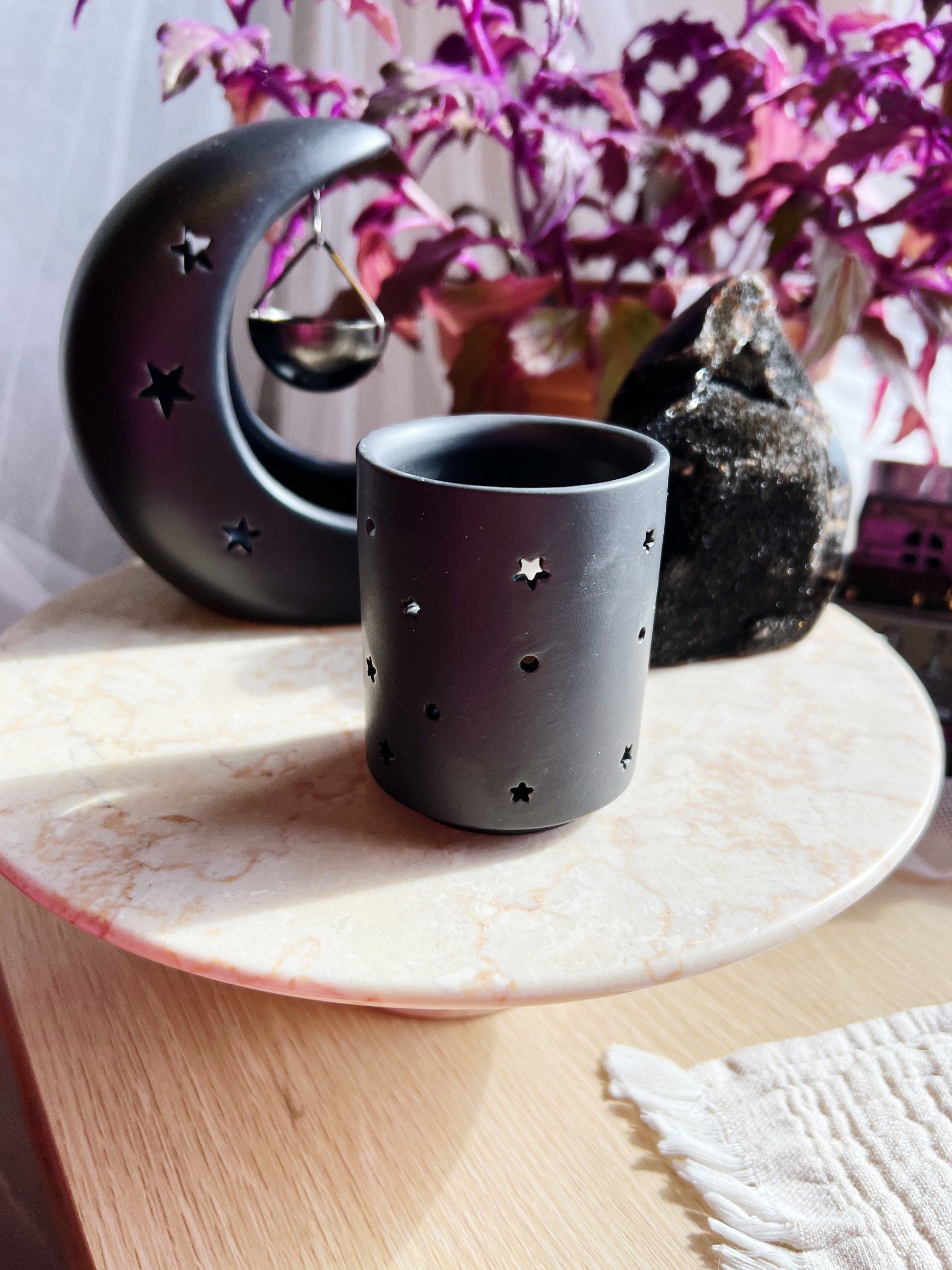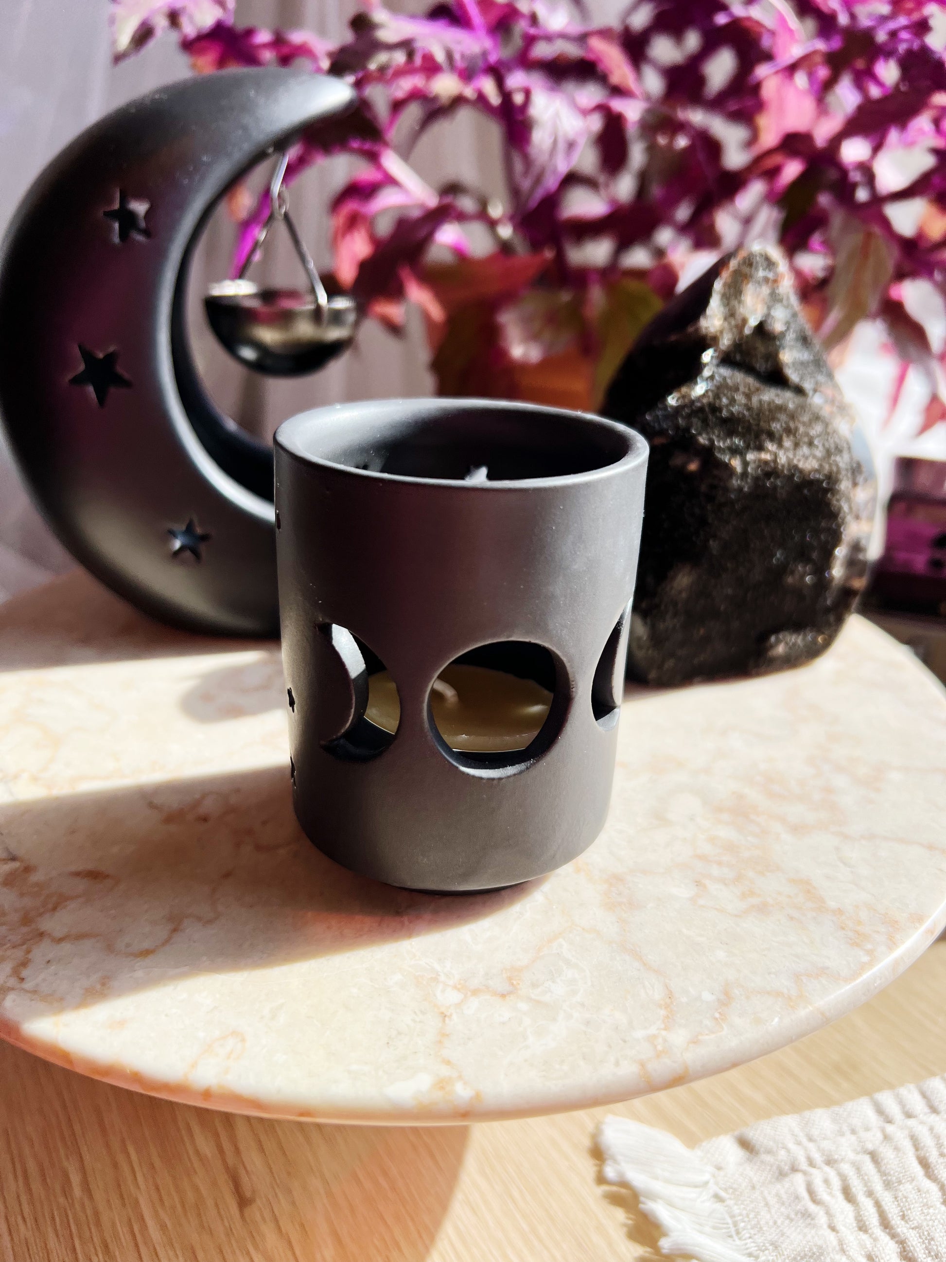 Denne stilrene telysholderen i keramikk har et vakkert utskåret design av den triple månen, symboliserende livets faser: jomfruen, moren og den vise gamle. Med sin kule, matte sorte finish gir den både en mystisk og elegant touch til hjemmet.