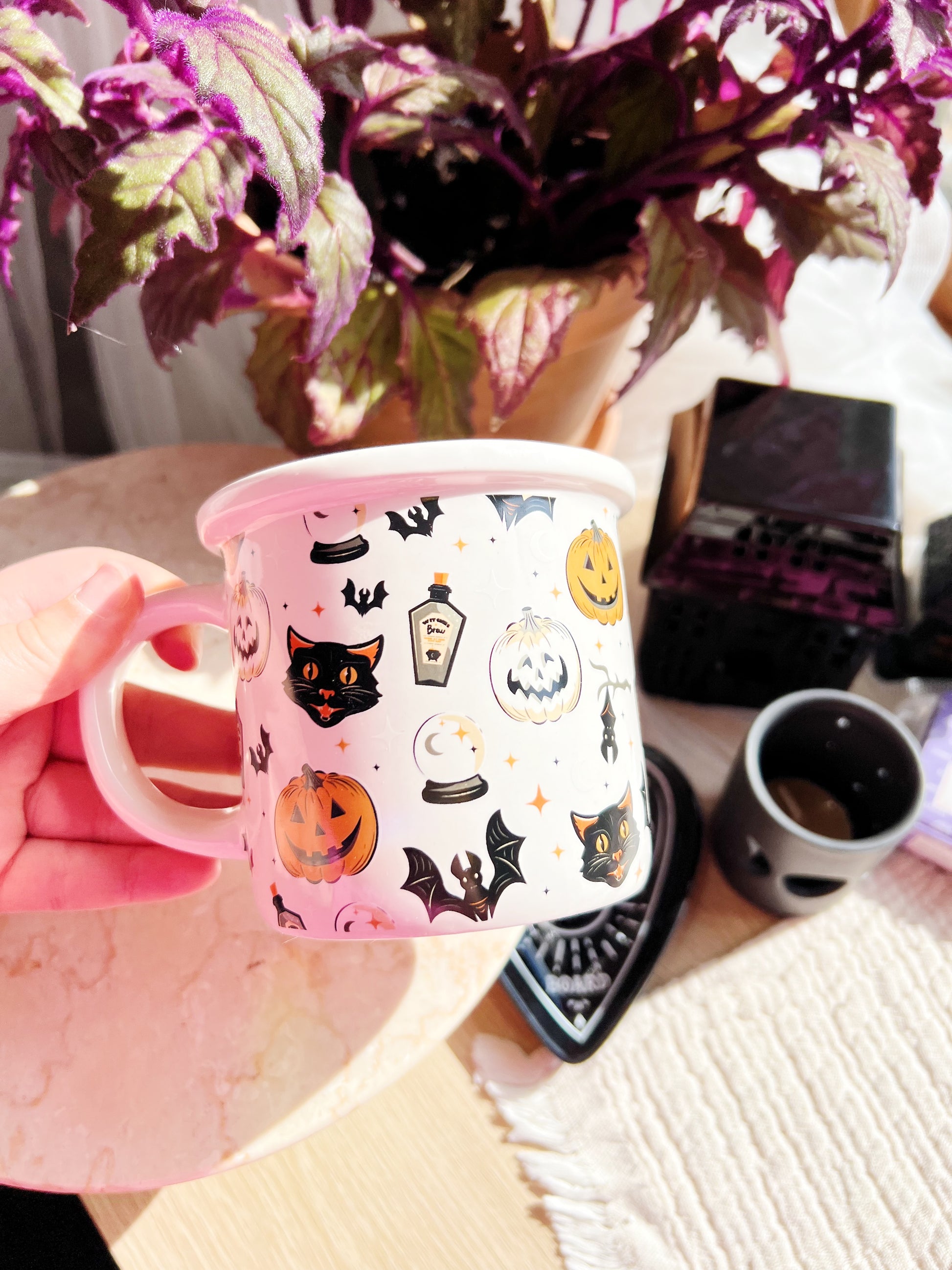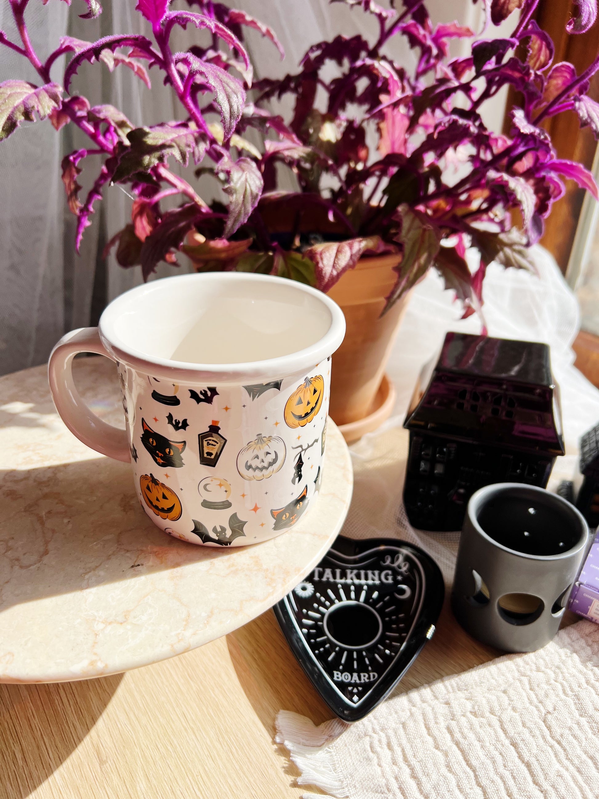 Kom i Halloween-stemning med dette solide og sjarmerende keramikkruset dekorert med nostalgiske Halloween-motiver! Her finner du svarte katter, flaggermus, gresskar og trylledrikker i en herlig retro stil som varmer bÄde sjelen og hendene.