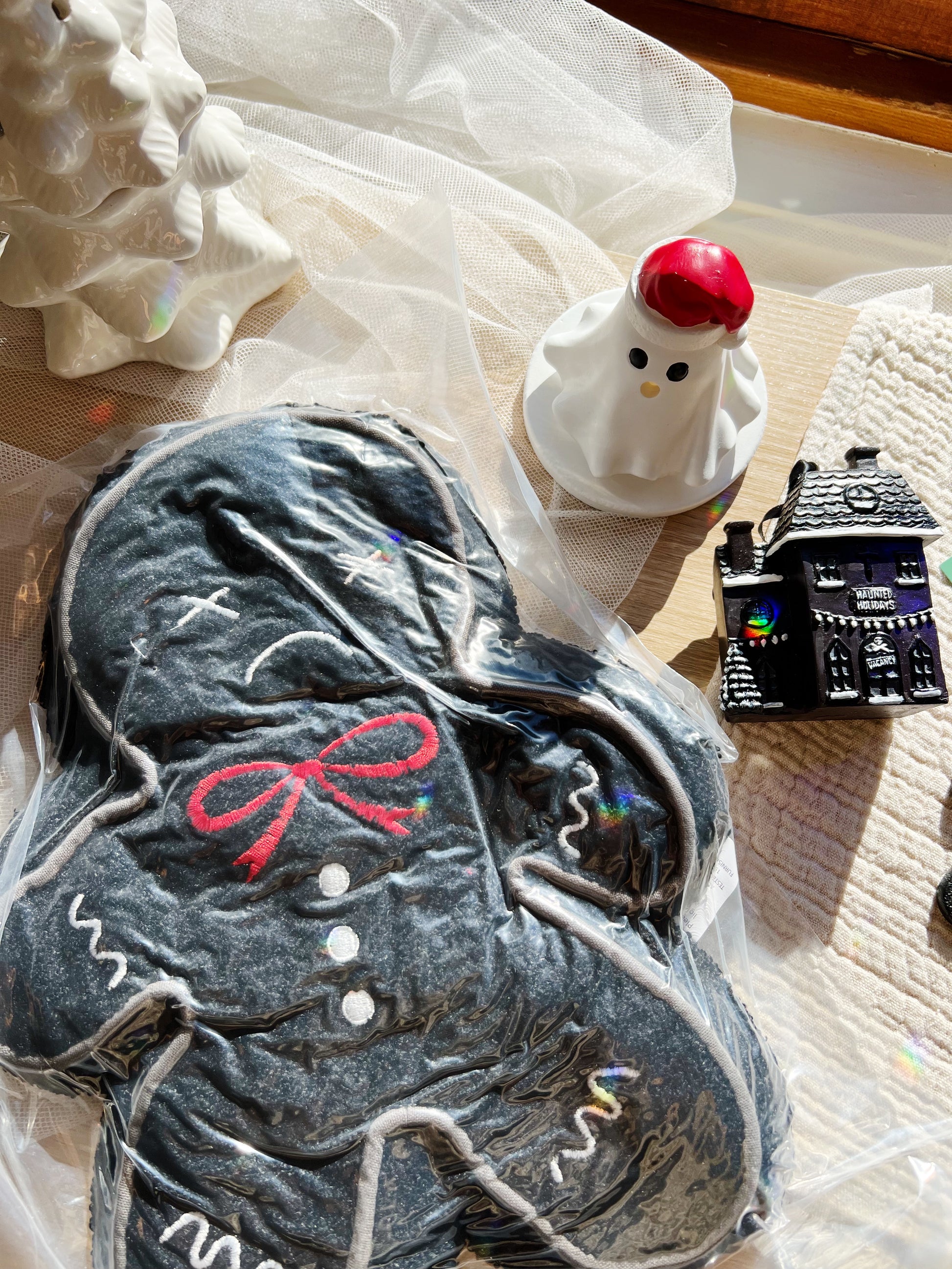 Denne bouclé-puten formet som en spooky pepperkakemann er det perfekte tilskuddet til deg som elsker litt mørk humor og gotisk julemagi. Med myk tekstur og rampete uttrykk er den både dekorativ og deilig å lene seg mot – enten i sofaen, sengen eller favorittkroken din.