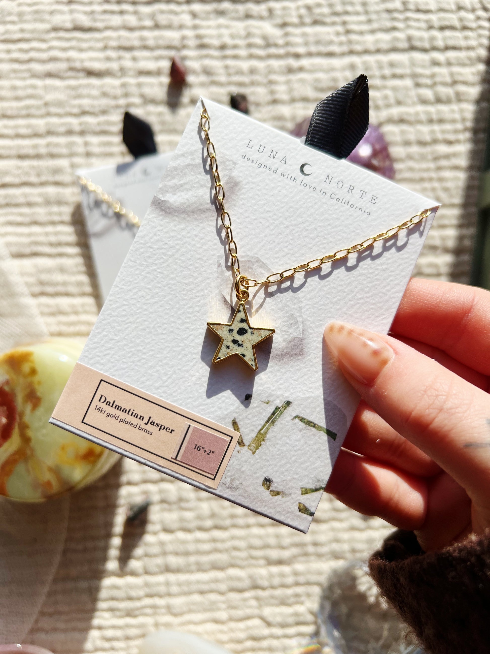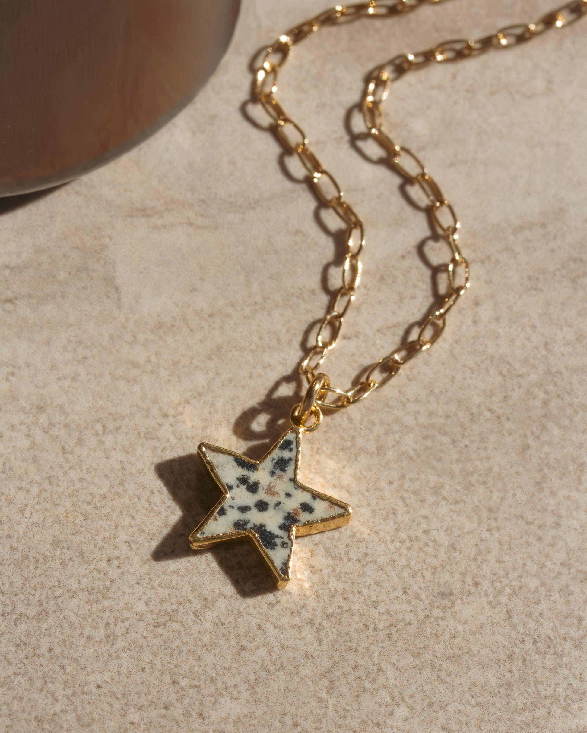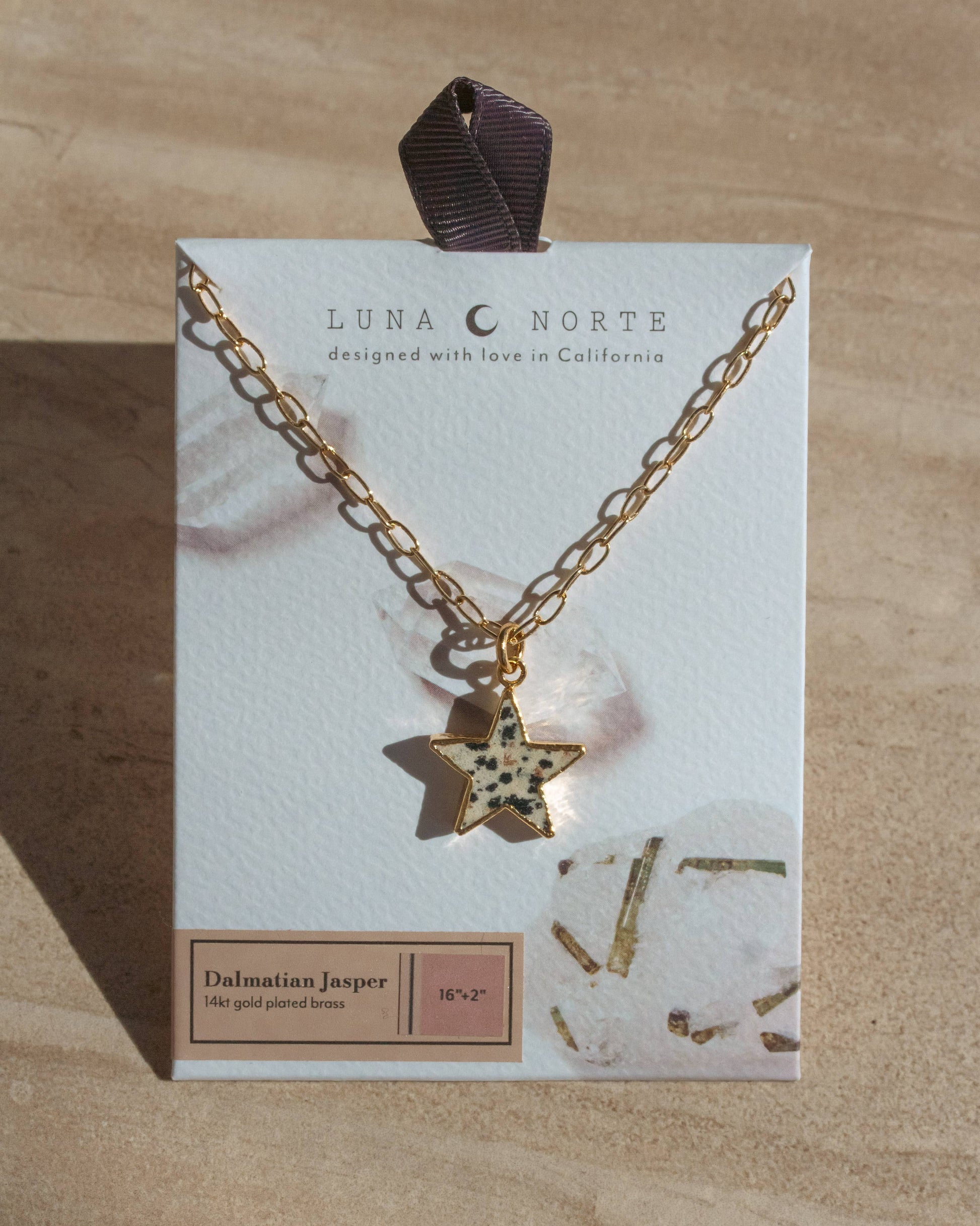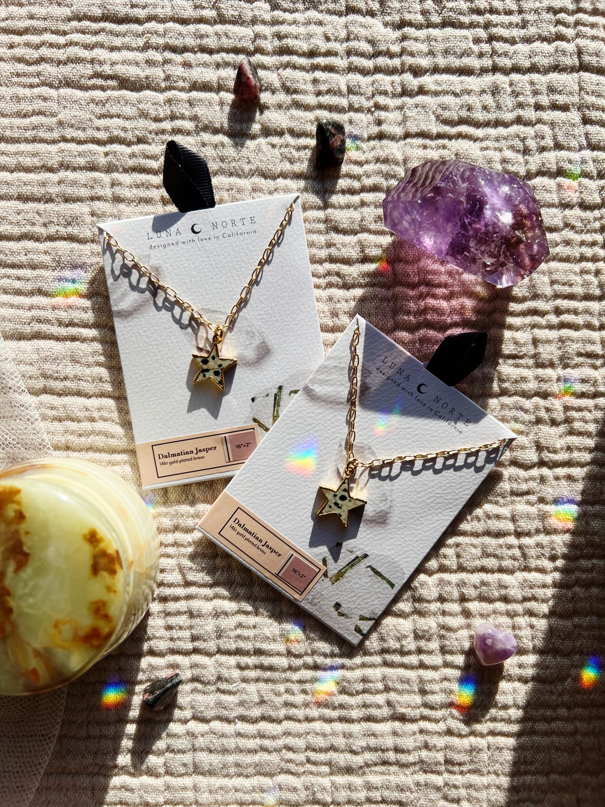 En leken balanse mellom himmelsk og jordaktig energi. Starstruck Jasper-halskjedet har en utskjært dalmatiner jaspis-stjerne hengende fra en polert paperclip-kjede. Kjent for sine jordende og gledelige egenskaper, tilfører dalmatiner jaspis en naturlig, flekkete tekstur som gjør hvert smykke unikt.