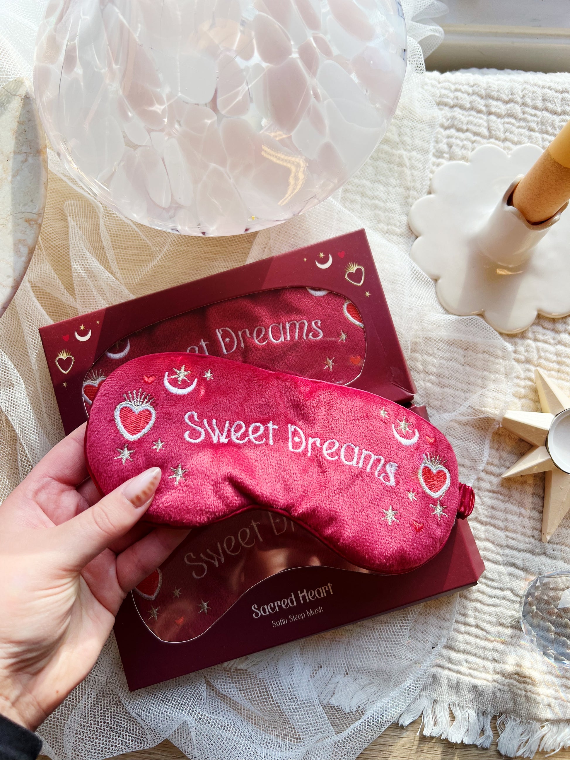 Drøm deg bort i myk komfort med denne nydelige, røde søvnmasken i fløyel – dekorert med teksten «Sweet Dreams», omgitt av magiske hjerter og månemotiver.