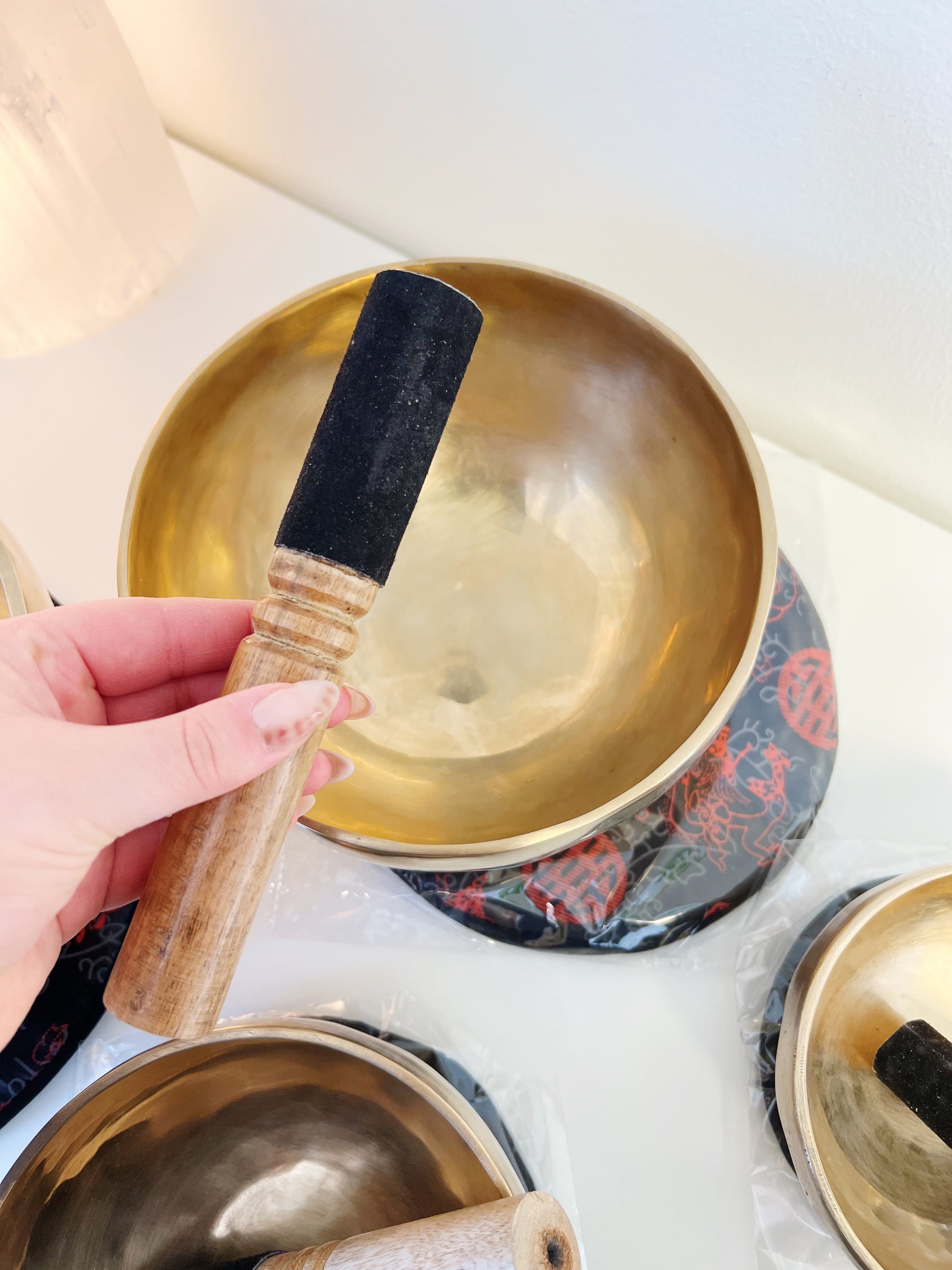 Håndlaget tibetansk syngebolle fra India, inkludert pute og trekølle. Perfekt for meditasjon, lydterapi og avslapning.