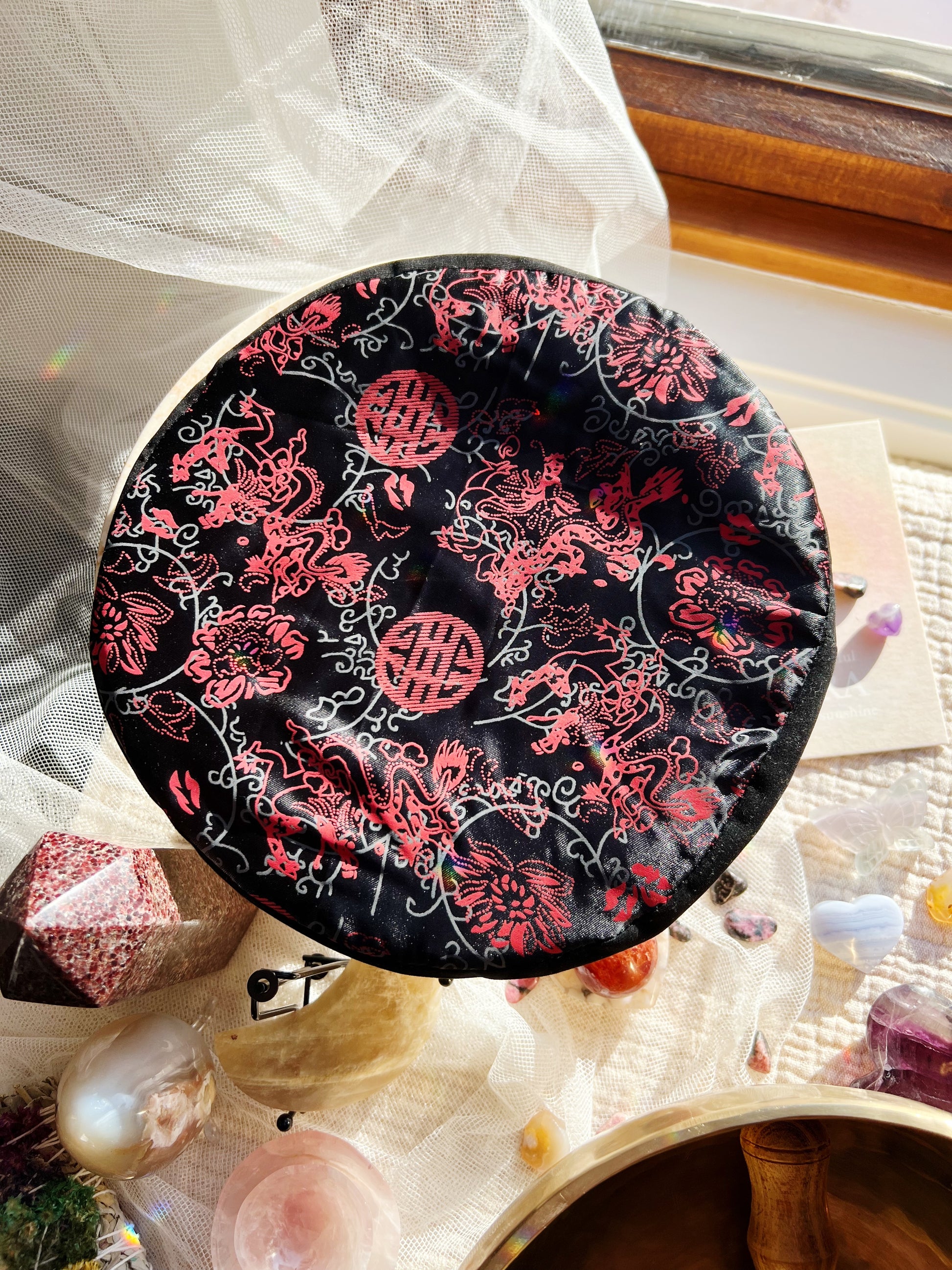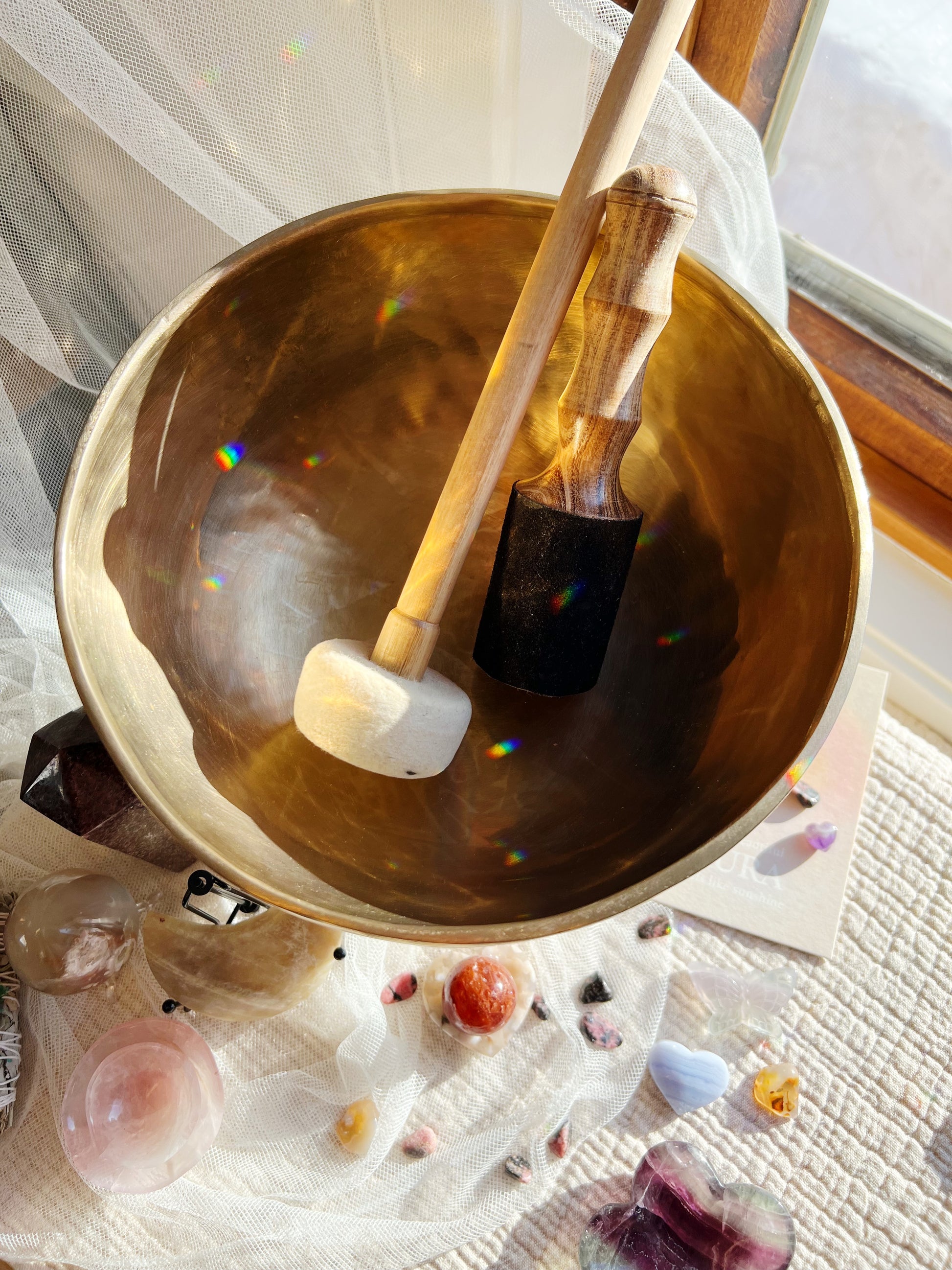 Håndlaget tibetansk syngebolle fra India, inkludert pute og køller. Denne større syngebollen produserer dype, kraftfulle toner perfekt for meditasjon, lydterapi og avslapning.
