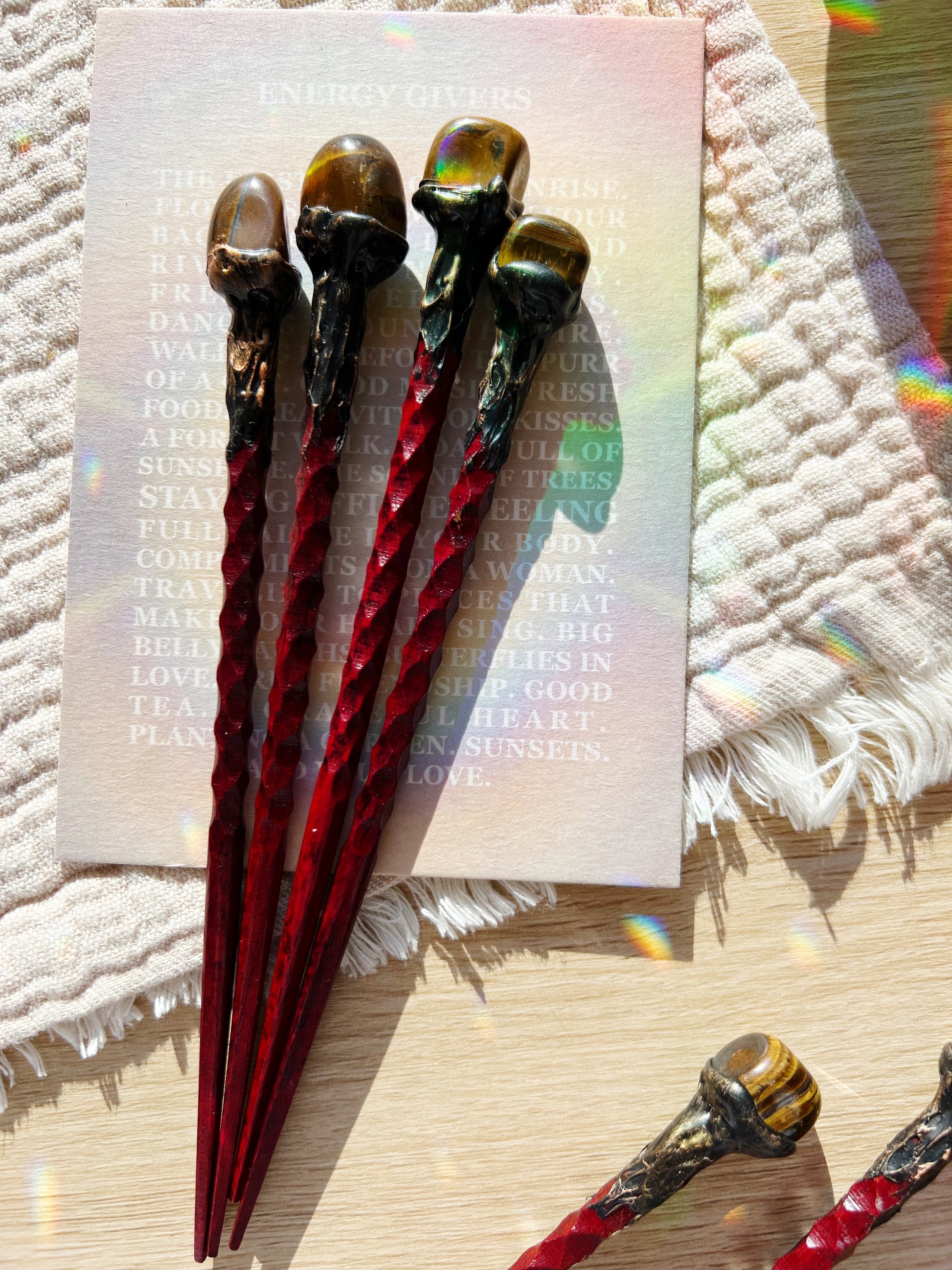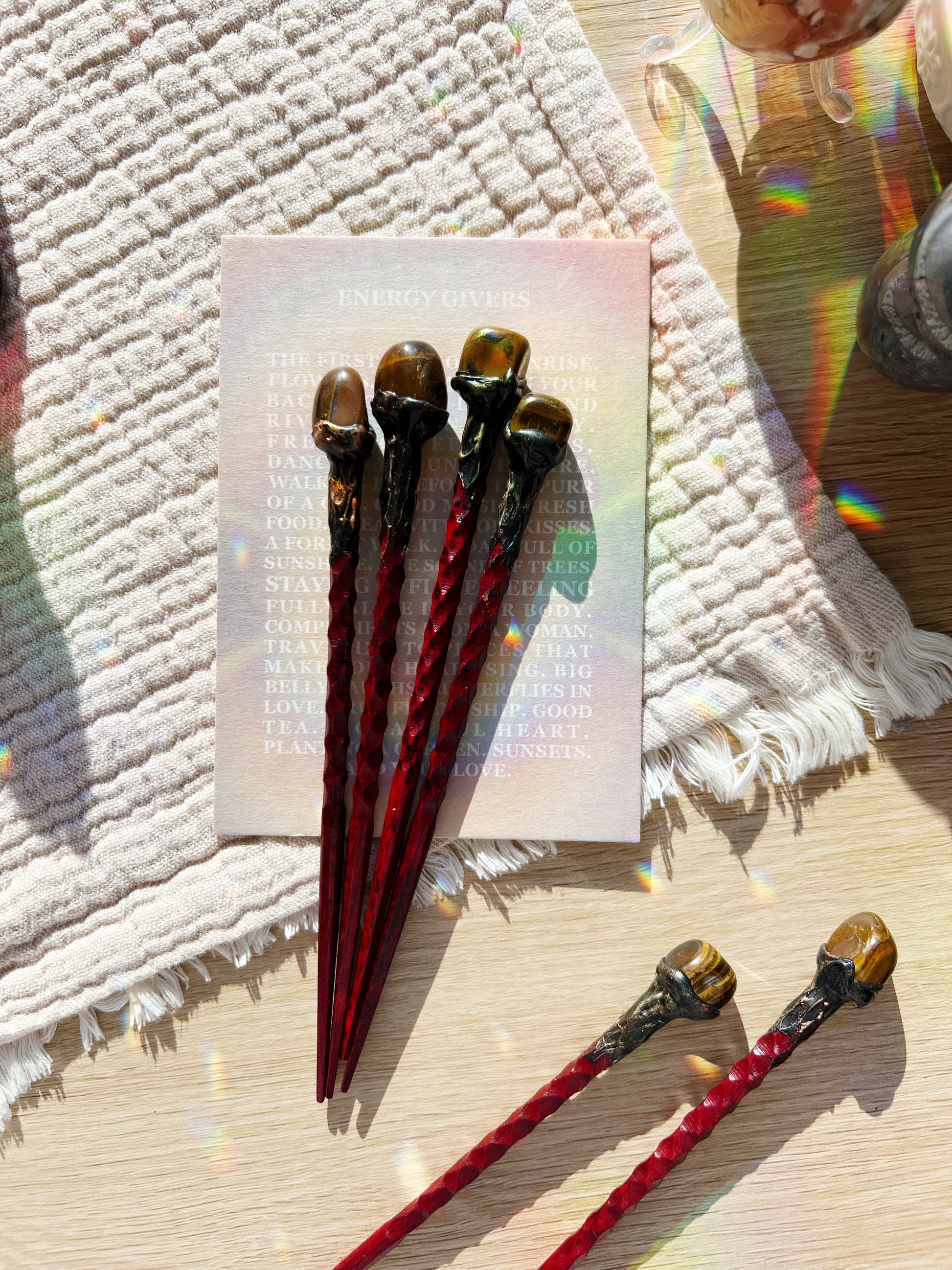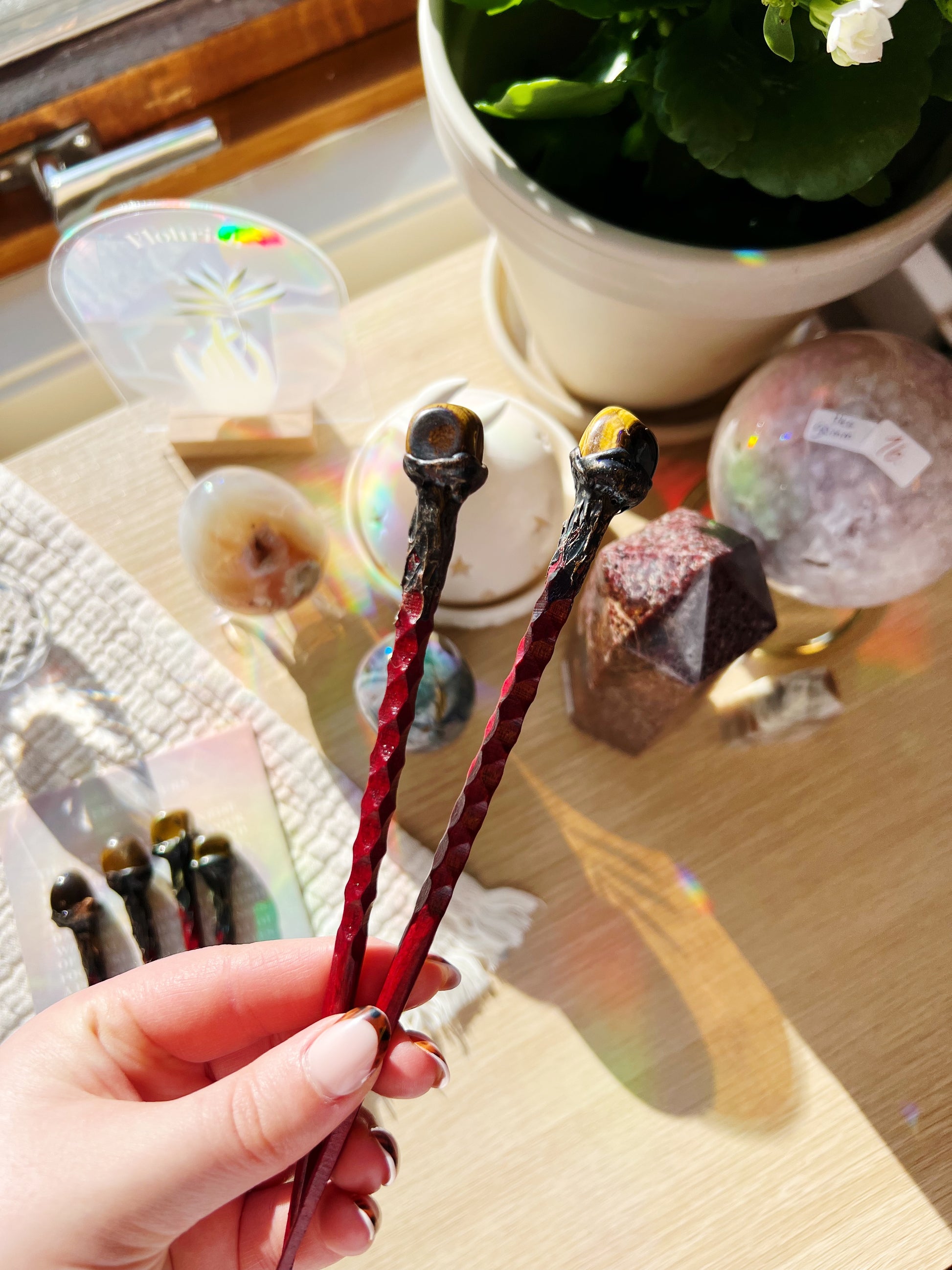 Denne vakre hårnålen kombinerer funksjon med spirituell energi. Laget av tre med en ekte Tigerøye-krystall fra Brasil, lar den deg bære Tigerøyens kraftfulle energi med deg hele dagen.