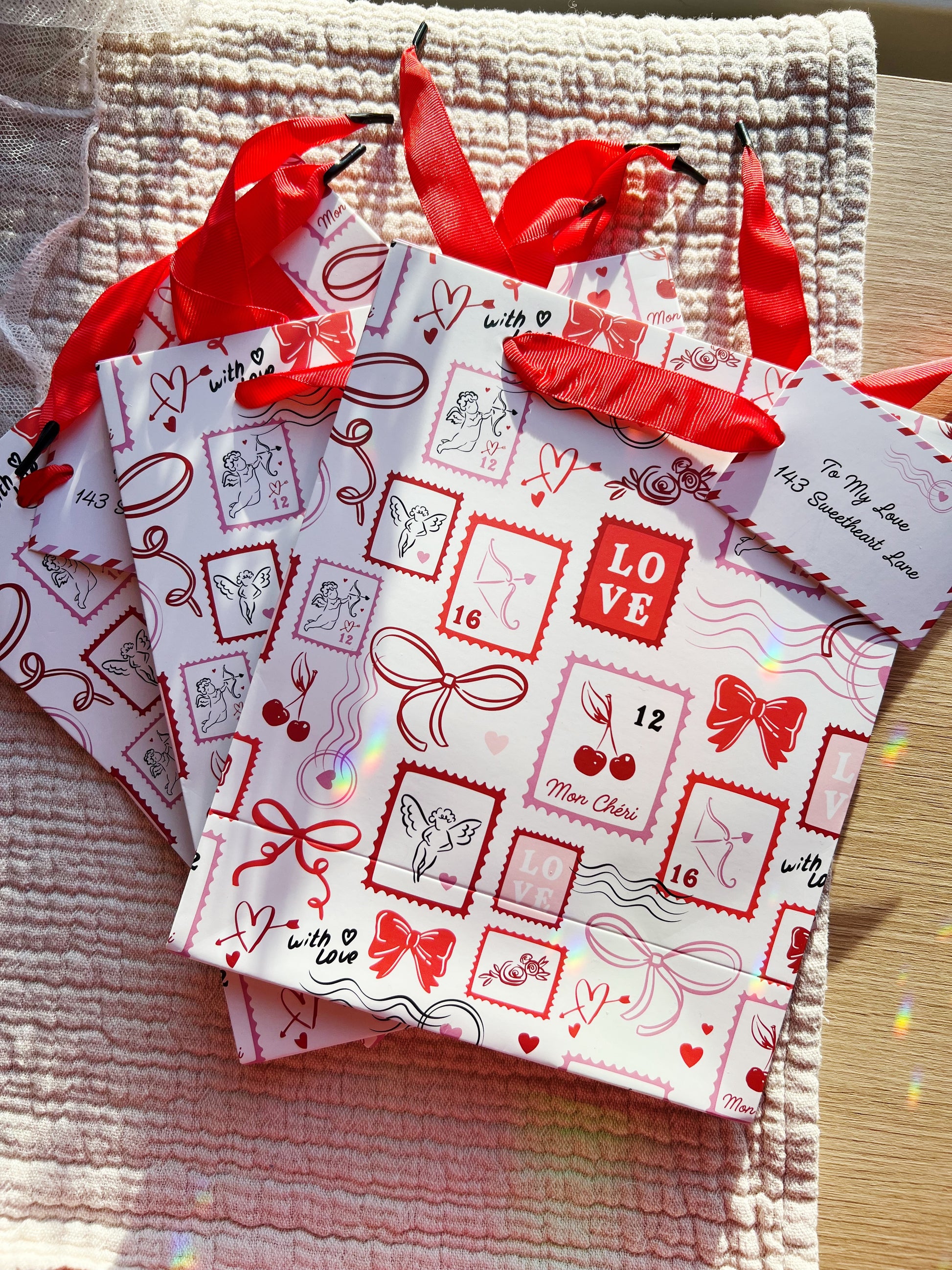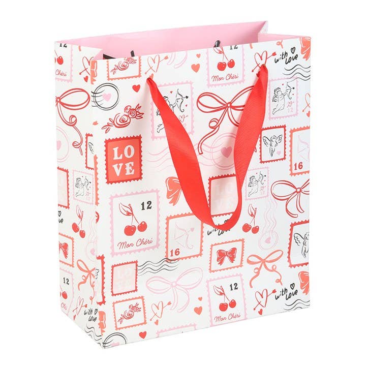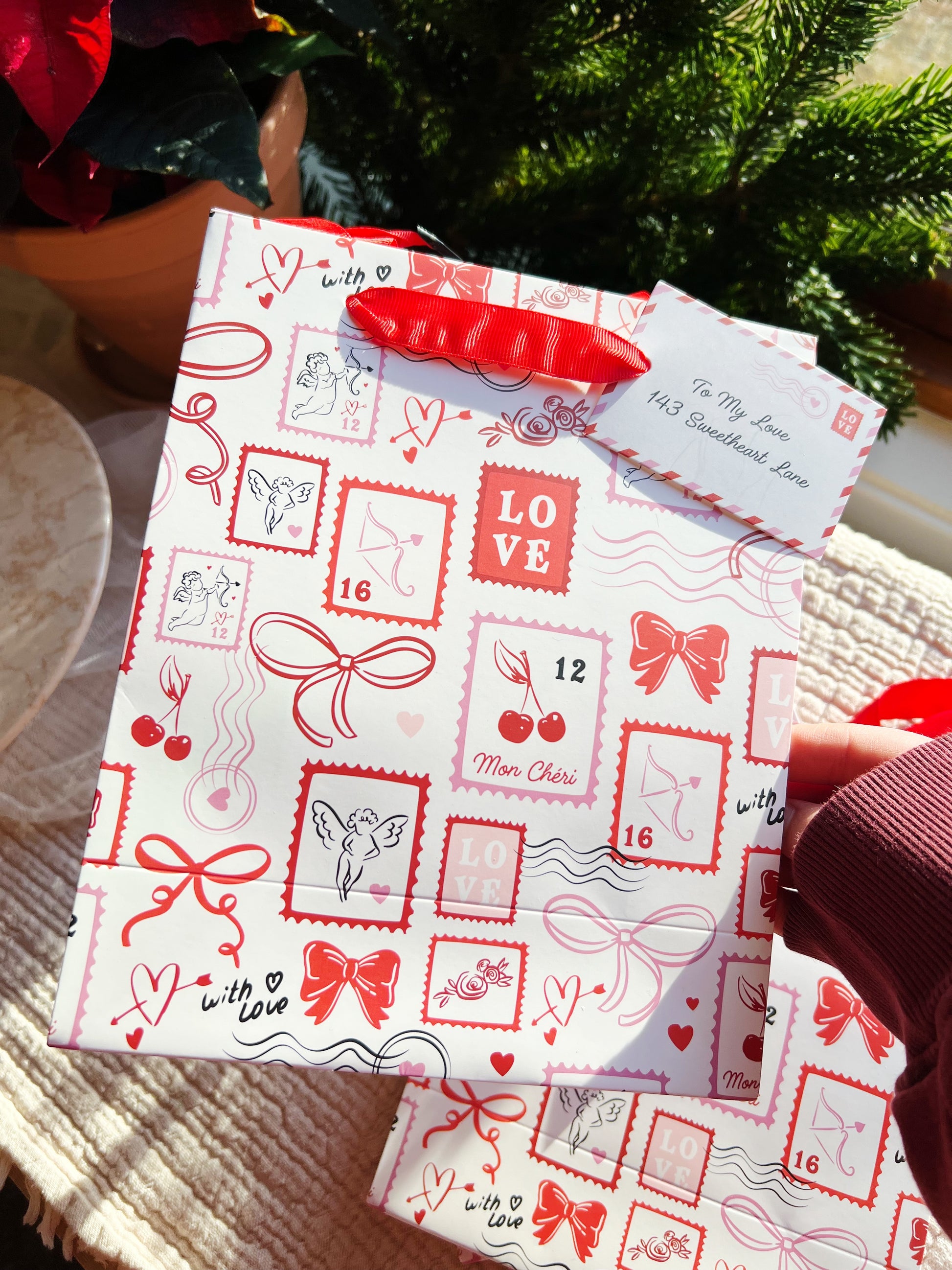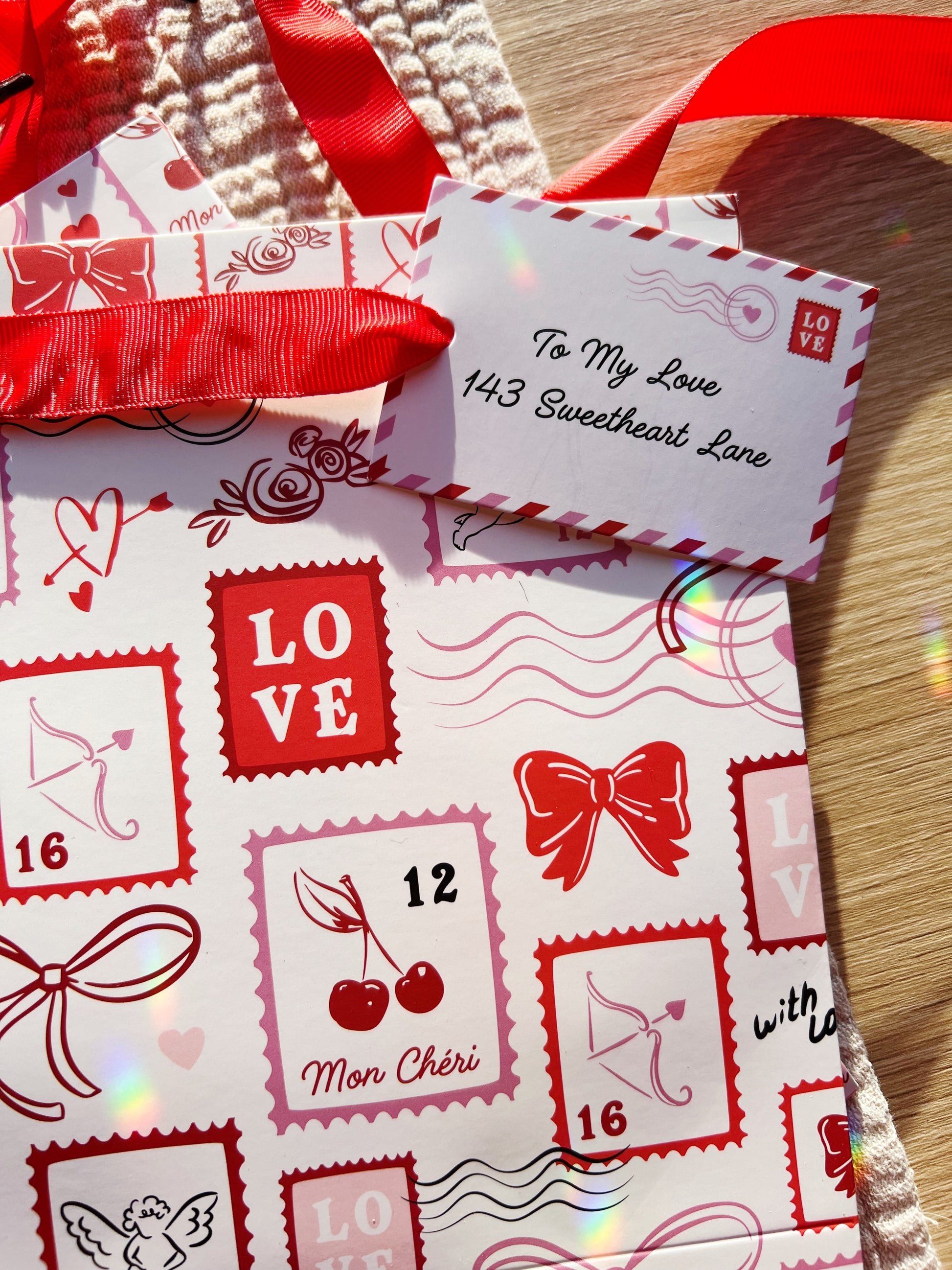 Pakk inn gaveene dine i denne papirgaveposen, dekorert med et lekent frimerkemotiv inspirert av kjærlighetsbrev og små søte hilsener. En sjarmerende og praktisk måte å presentere små kjærlighetsgaver på.