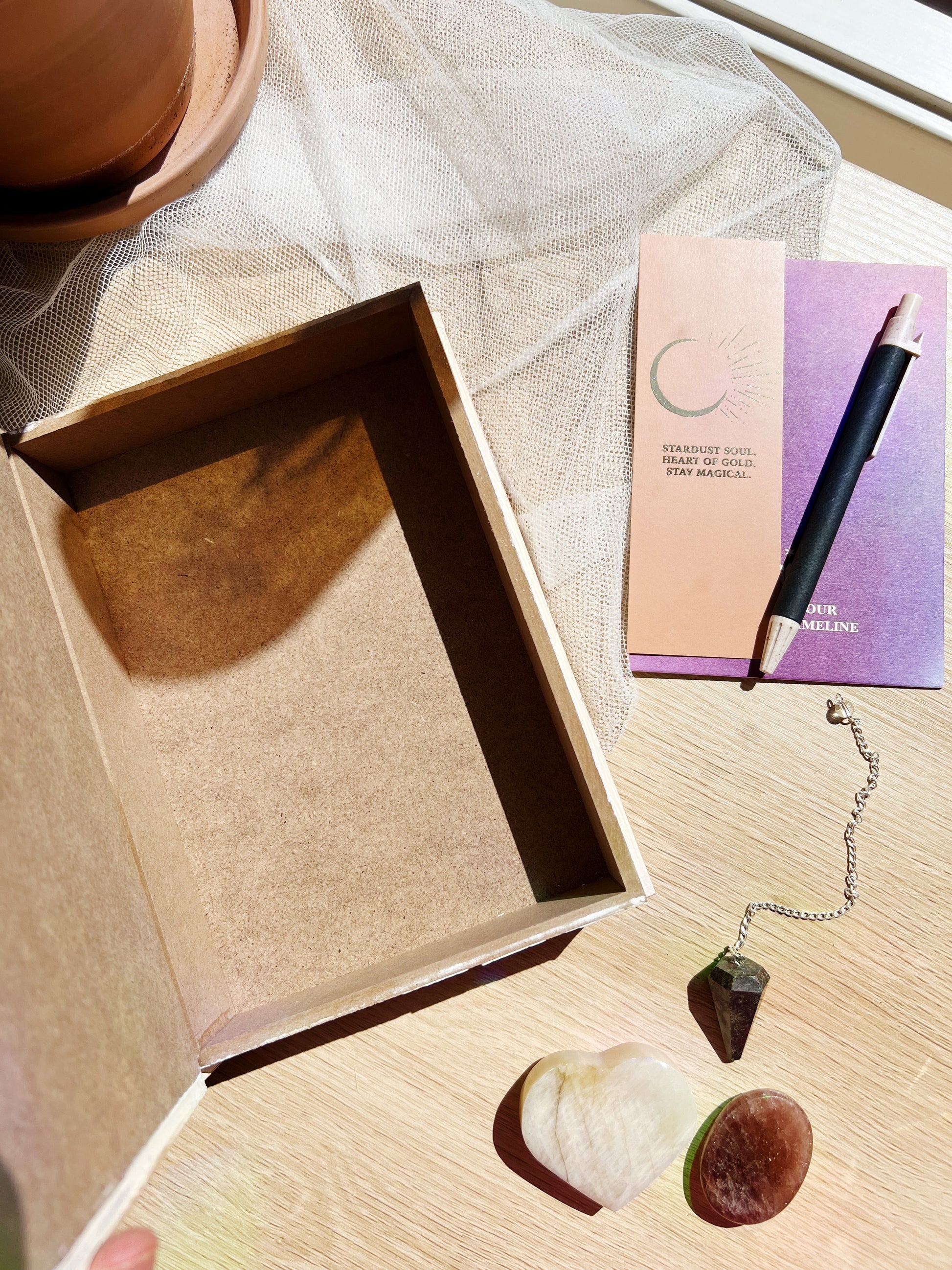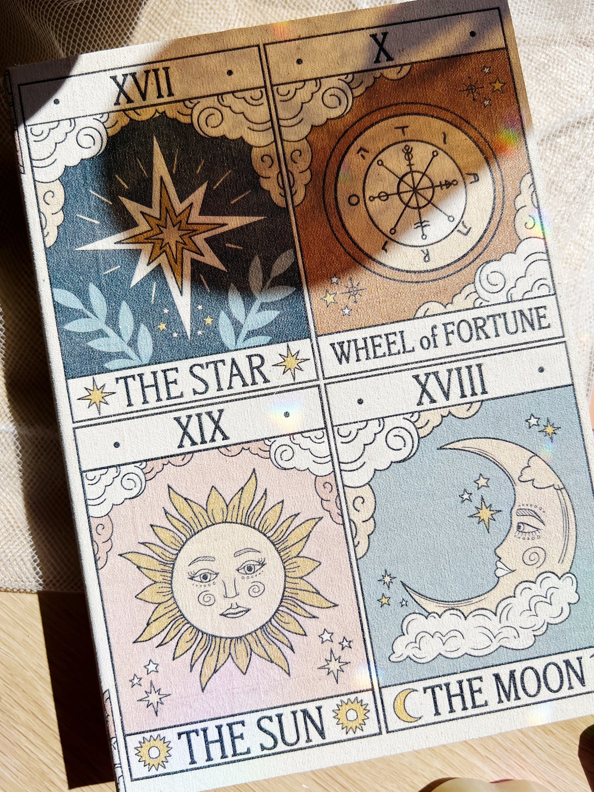 Hold dine skatter skjult i denne stoffinntrukne oppbevaringsboksen, som er designet som The Book of Tarot. Med et vintage tarot-inspirert design og klassiske symboler som Solen, Månen, Stjernen og Hjulet av Lykke, er denne bokformede boksen perfekt for å oppbevare smykker, små skatter eller minner.
