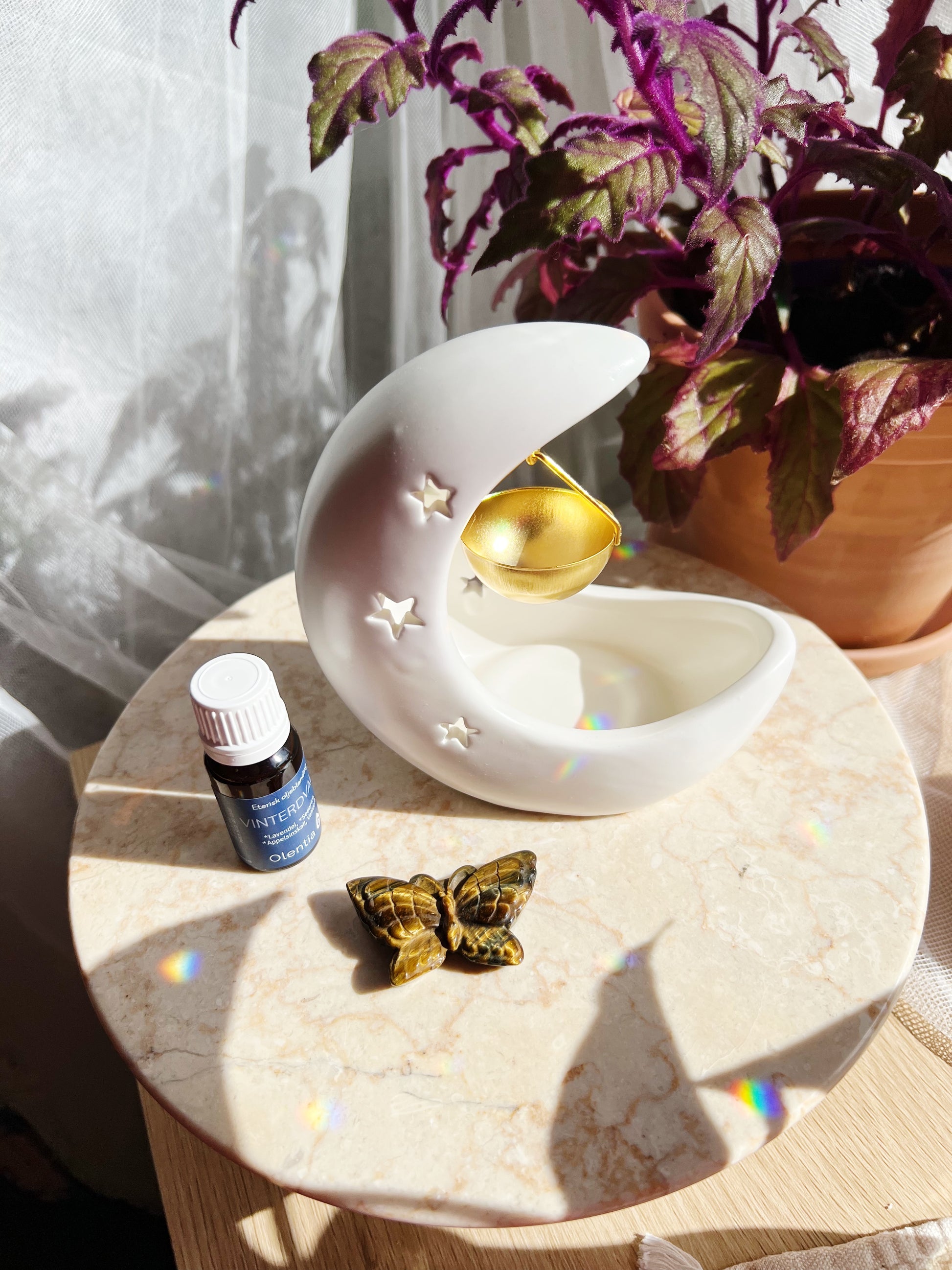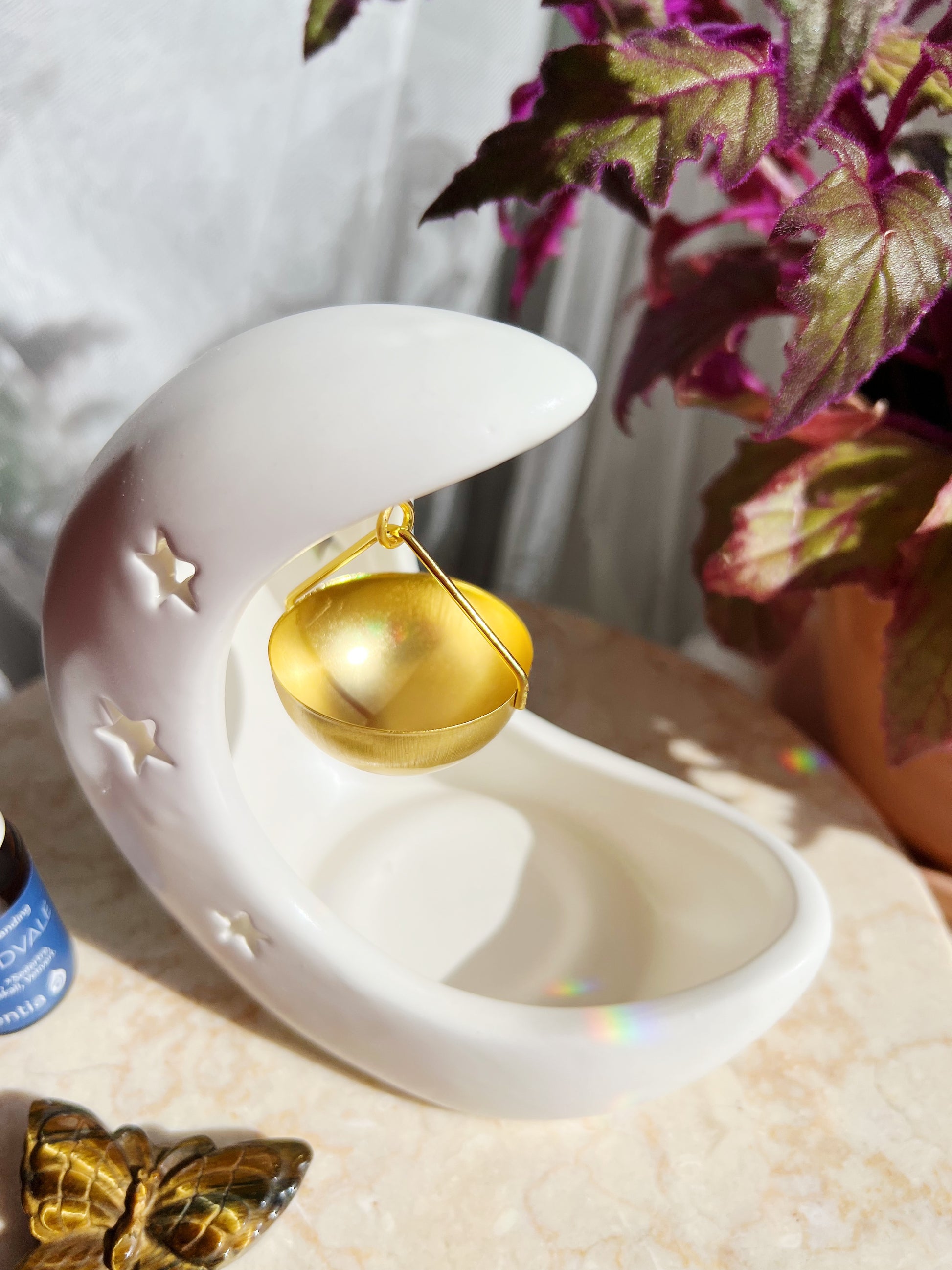 🌙✨ Hvit Olje/Vokssmelter – Halvmåne med Stjerneskinn