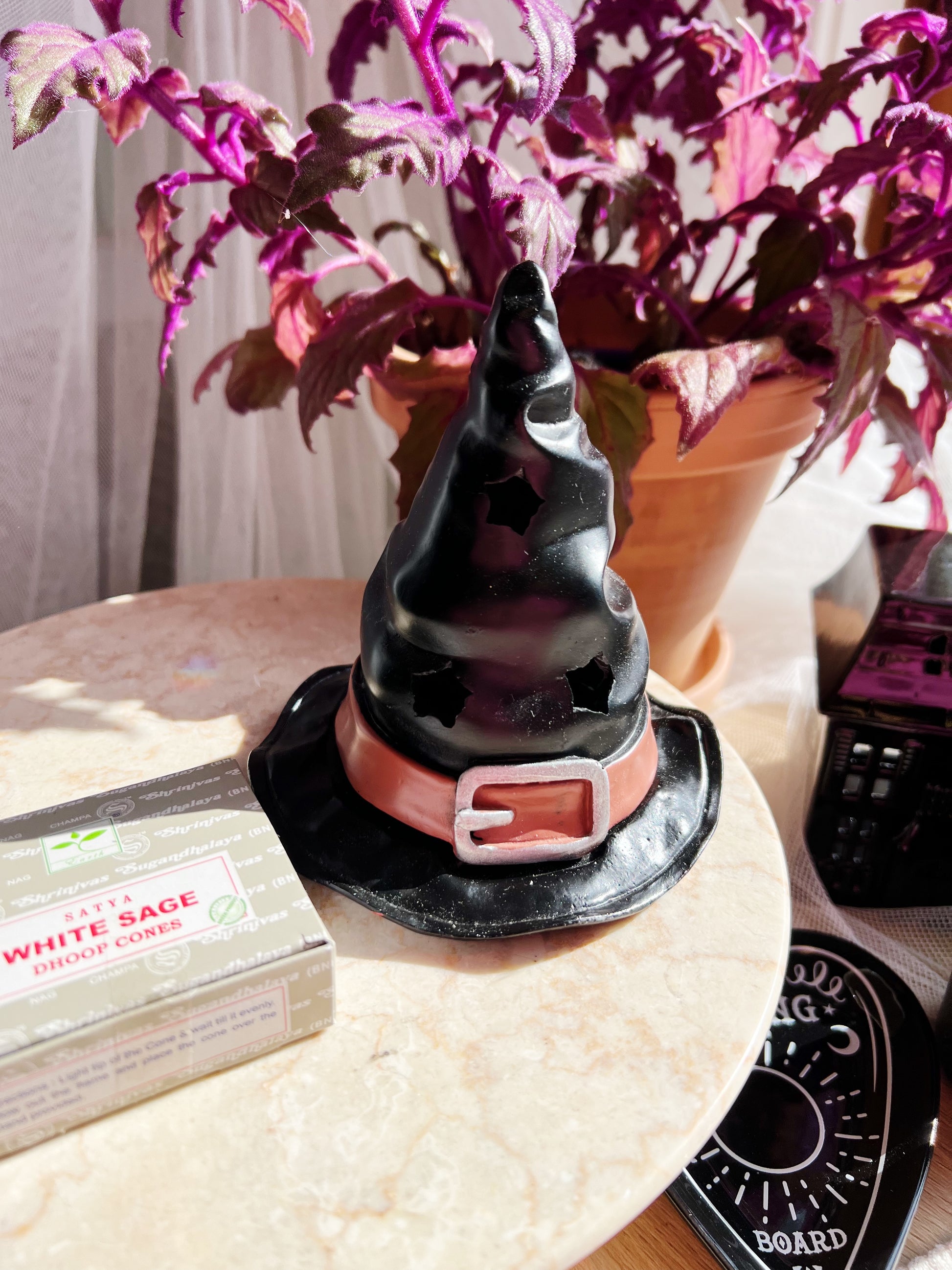 Plasser en ulmende røkelseskjegle under denne lille heksehatten og se på mens røyk forsiktig kommer ut fra utskårne stjerner. Flott for både Halloween og hekseinnredning året rundt. 16 x 16 x 17 cm
