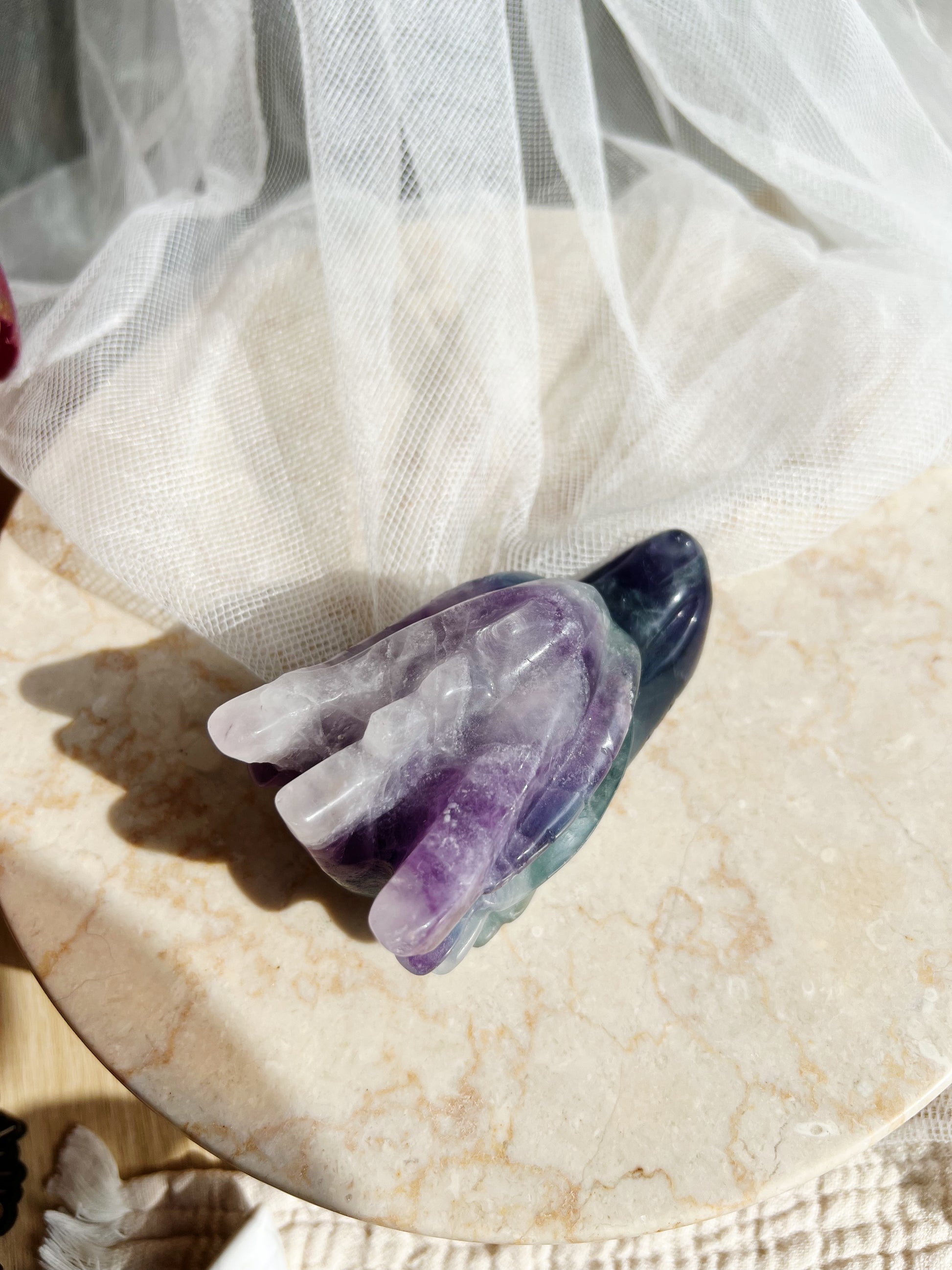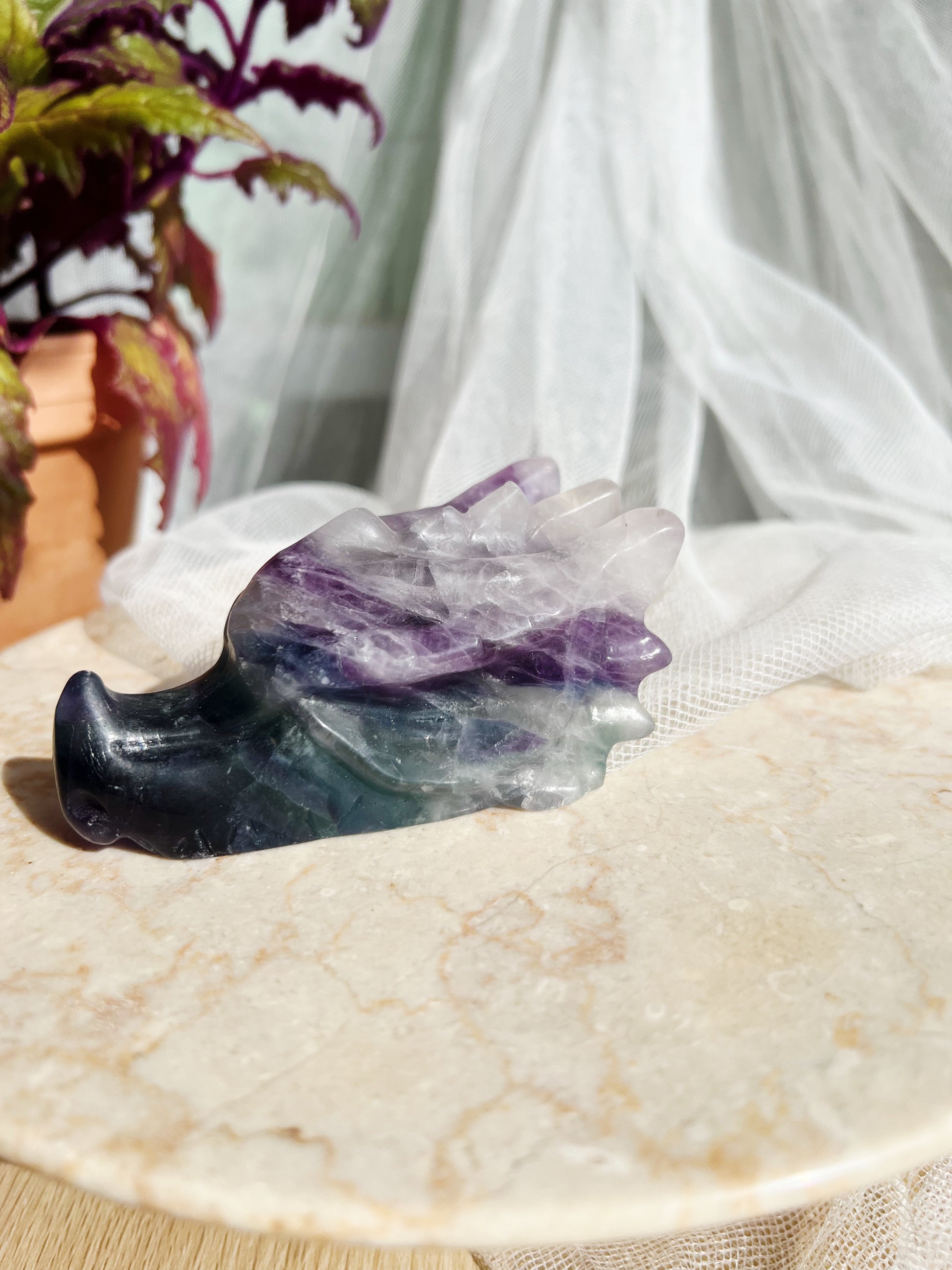 La deg fascinere av dette unike dragehodet i Candy Fluoritt – en krystall som veier ca 386 gram og måler ca 10 cm. Med sine blendende farger i grønt, lilla og hvitt, og vakre snøfnugg-lignende mønstre, er dette et kraftfullt kunstverk fra naturen som kombinerer skjønnhet og magisk energi.